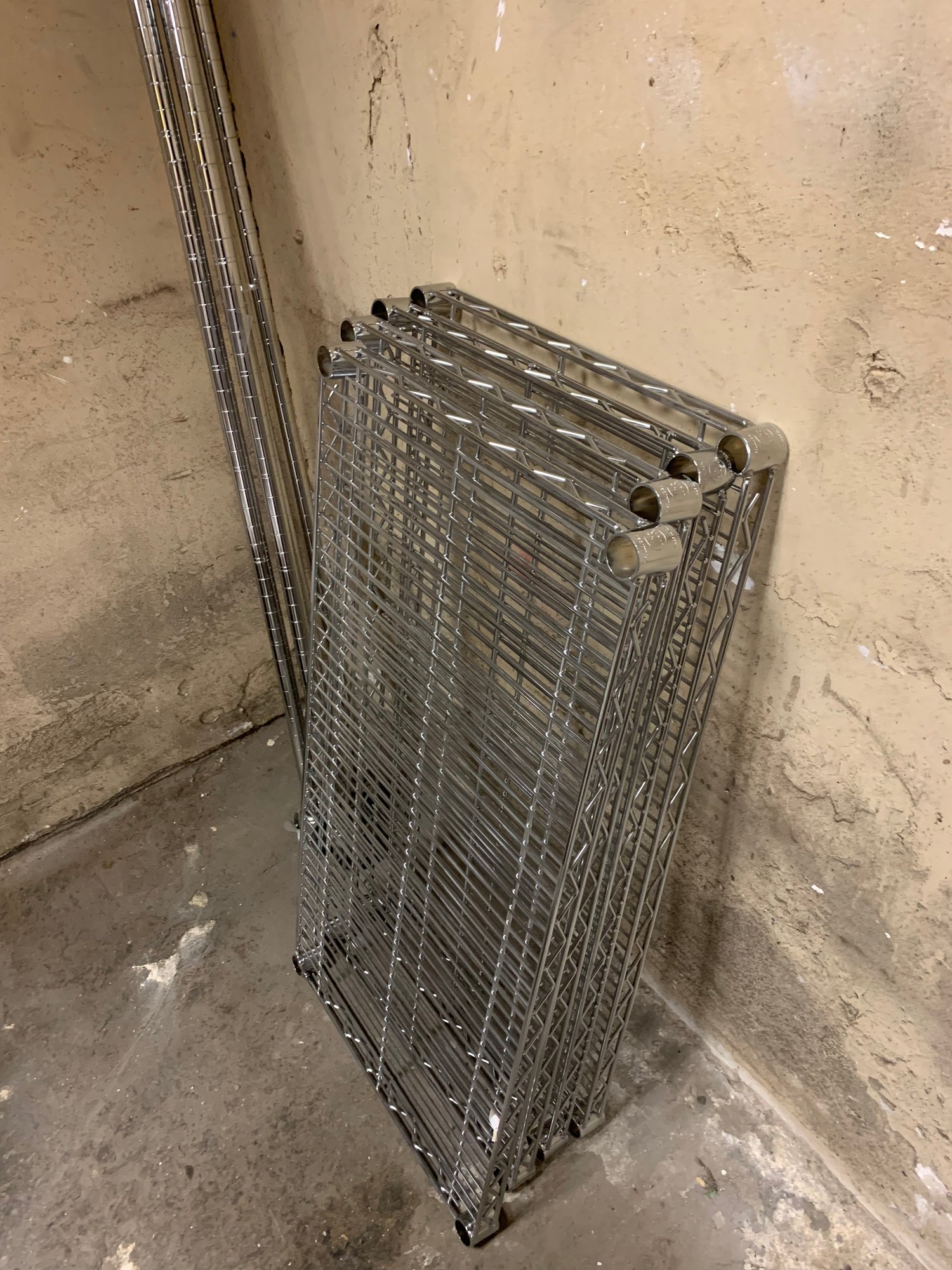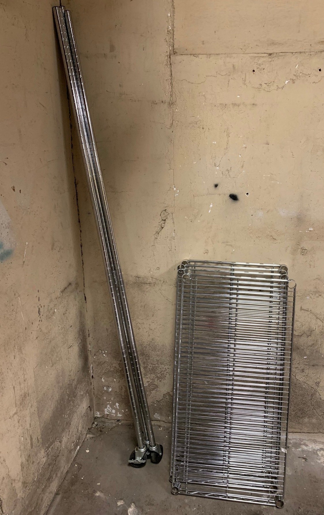 Includes 4 shelves, 4 posts with casters and 16 split shelf sleeves.
