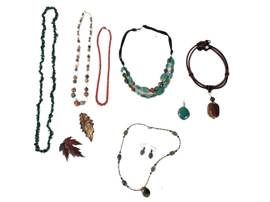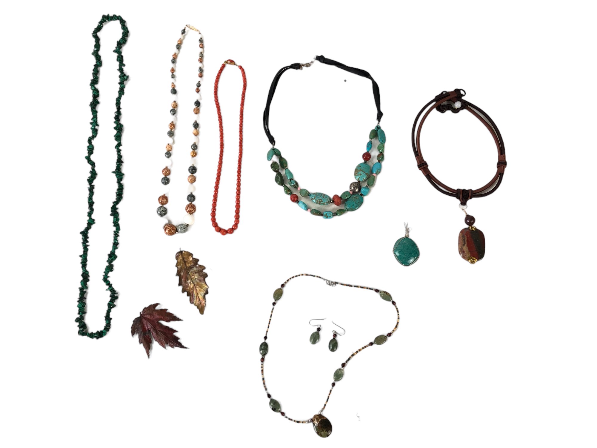 Includes 6 necklaces, 2 pins, 1 pendant and 1 pair of earrings.