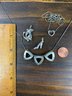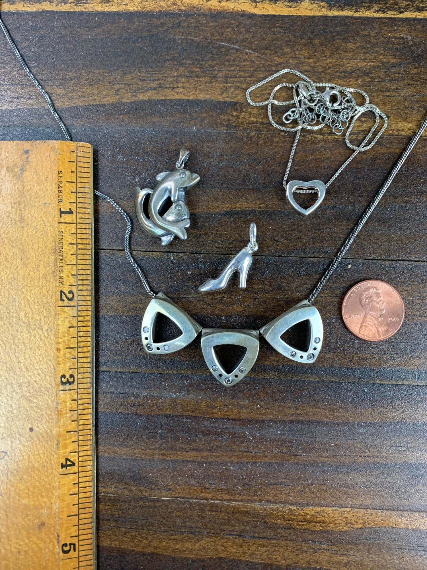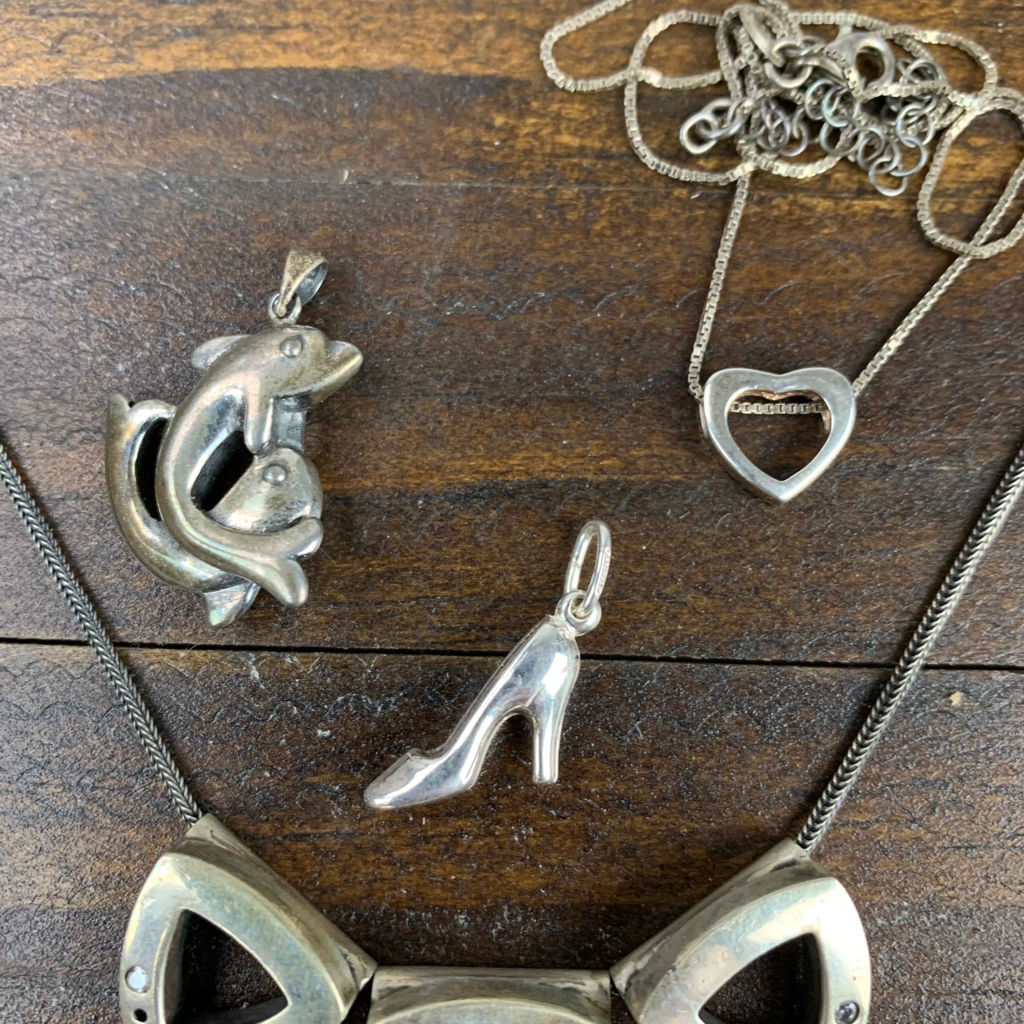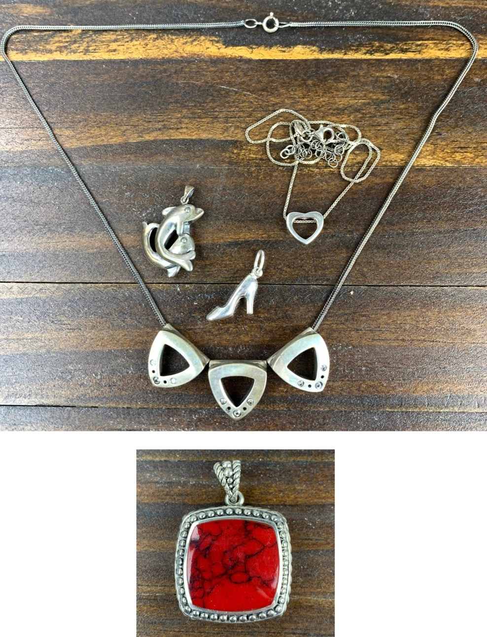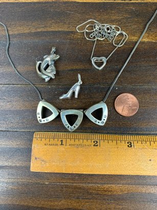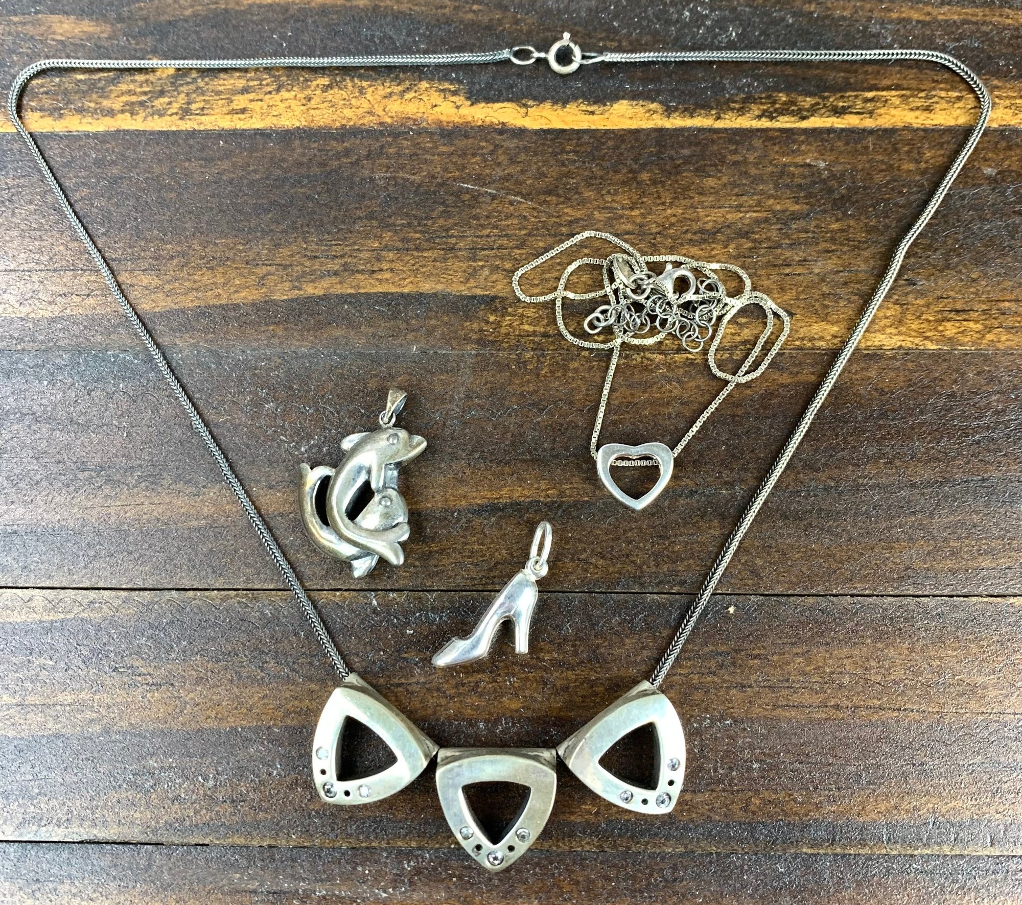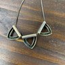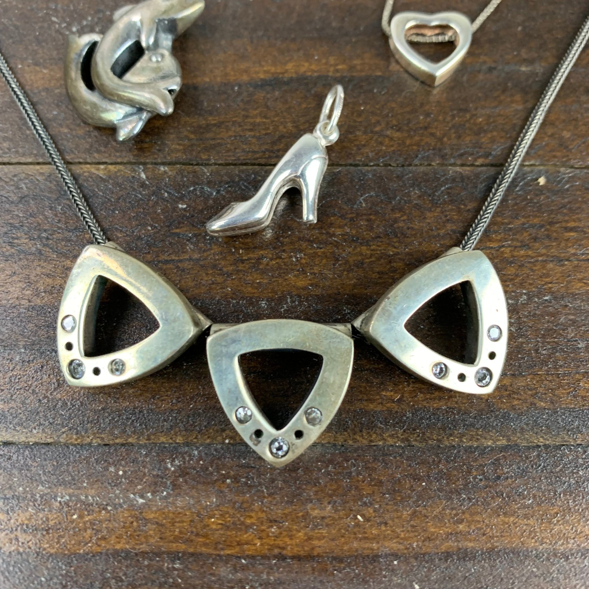 The triangle necklace appears unmarked, but acid tests positive for silver.