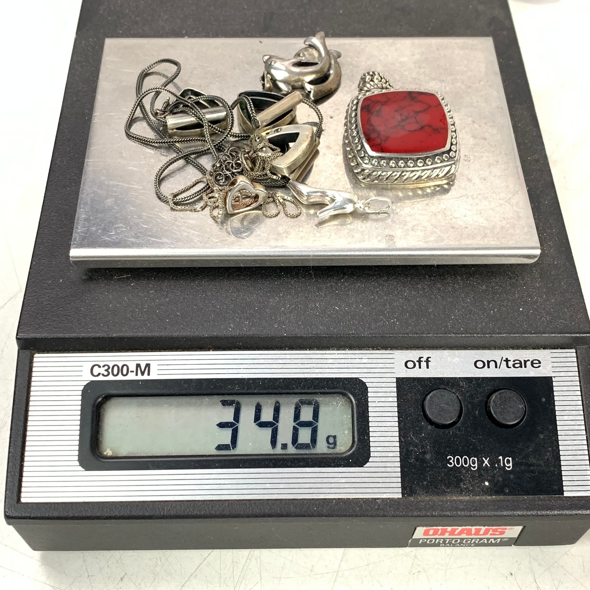 The heart pendant necklace is stamped "925" on the clasp - the heart does not appear to be marked, but is non-magnetic.