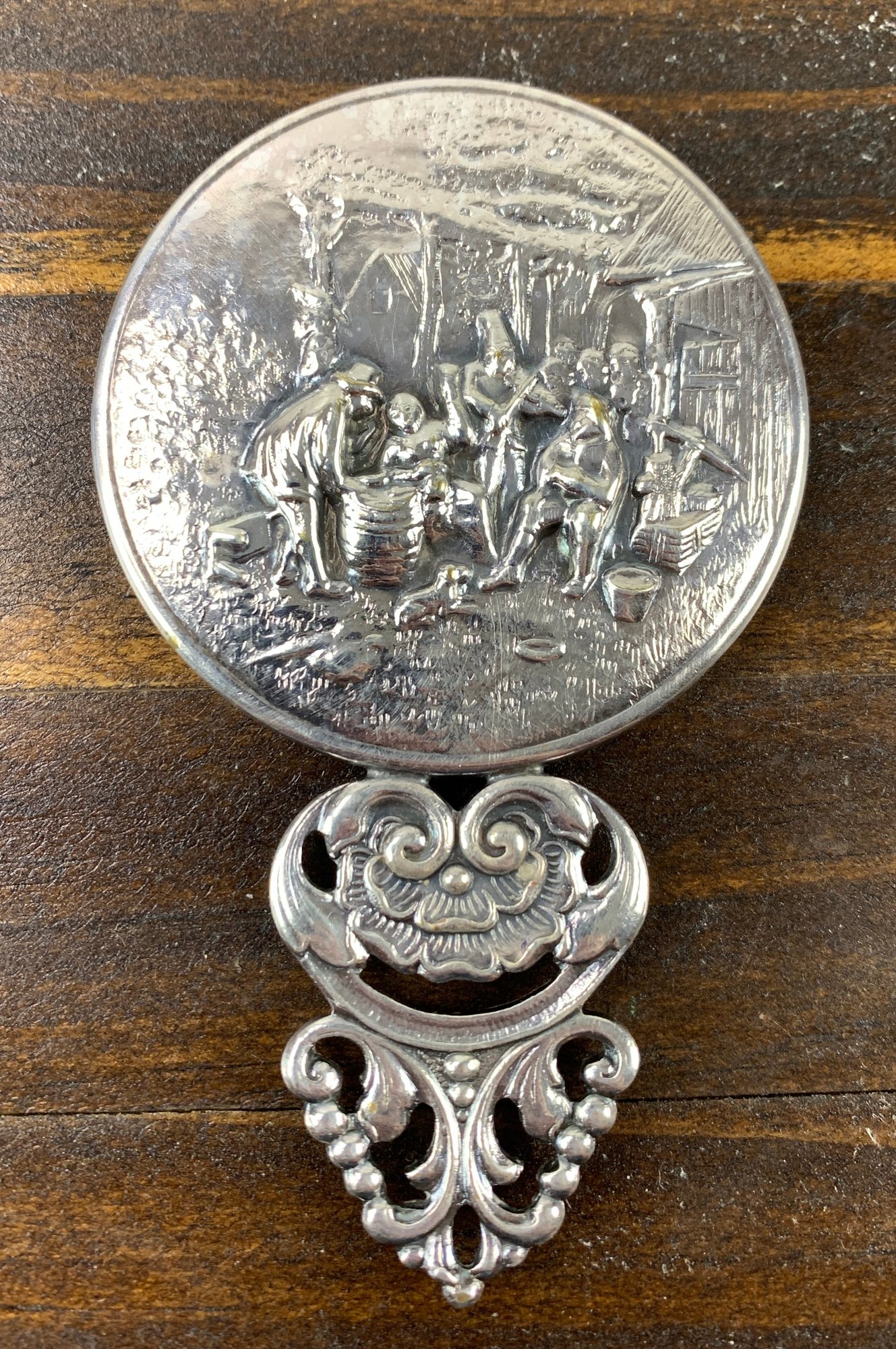 Stamped "Denmark" and hallmarked along the edge of the mirror.