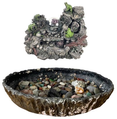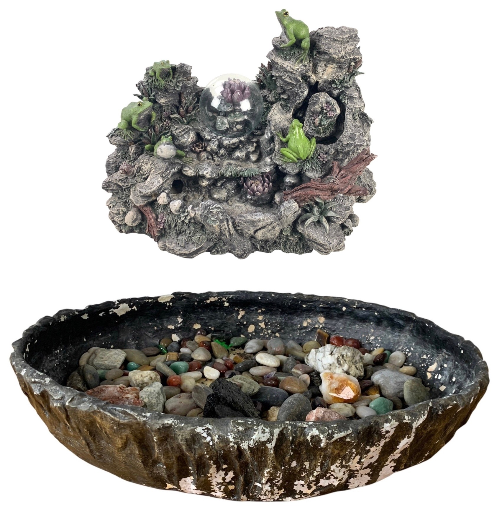 Includes a water fountain, basin, decorative rocks and transformer.