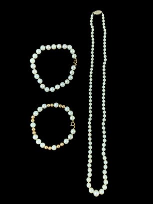 The beads and white gold clasp have acid tested positive for 14K gold.