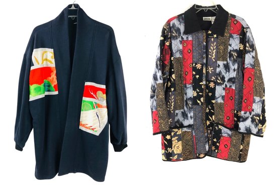 The embroidered jacket appears to be a larger size, possibly an x-large. Pulls noted in the embroidery on the back of the jacket (see photo #10).