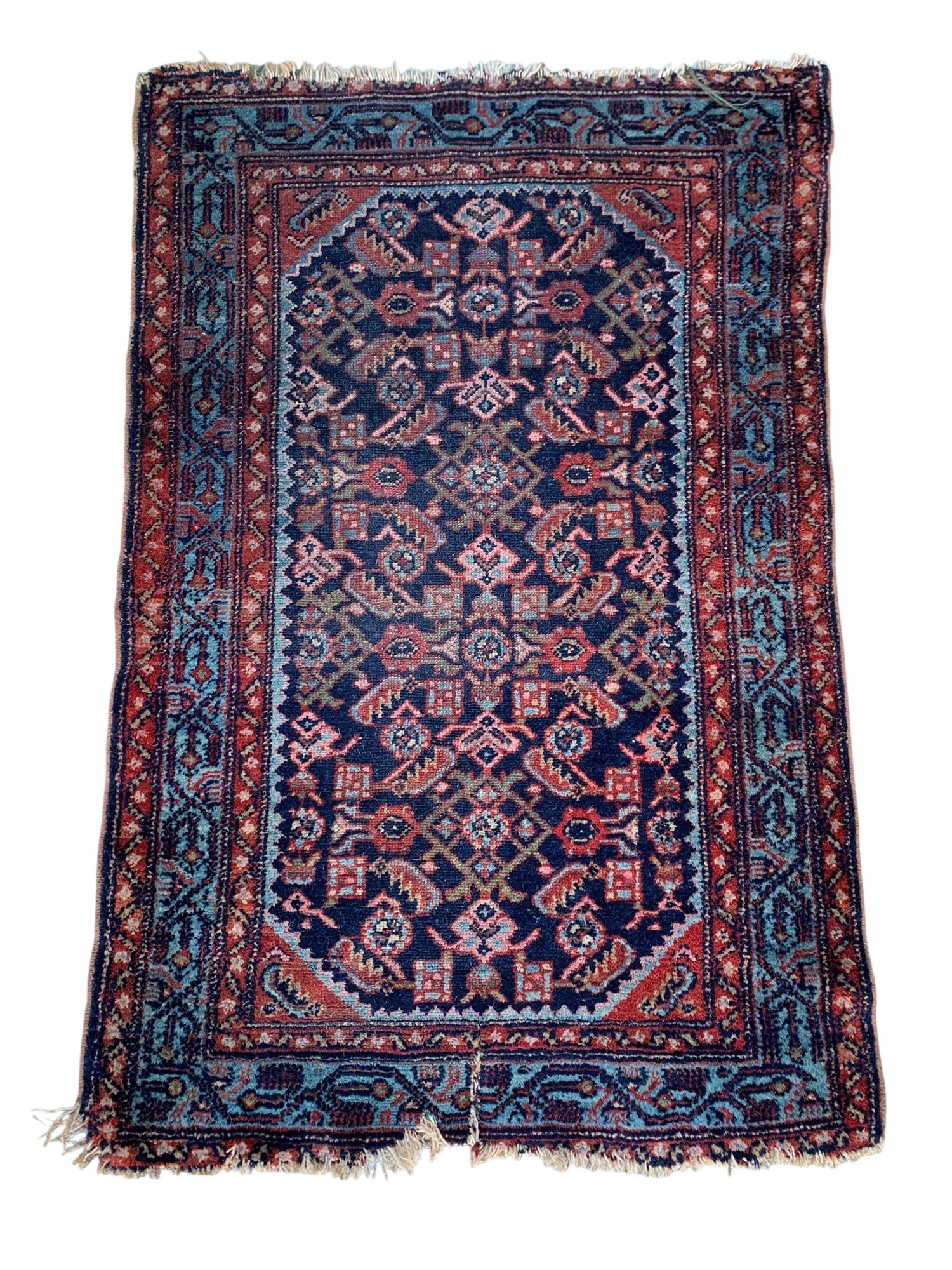 Condition: wear consistent with age/usage, fringe loss, tear and corner loss noted along one end.