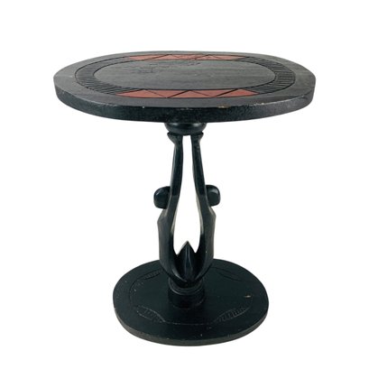 Features a carved double-figure base with decorated African motif table top.