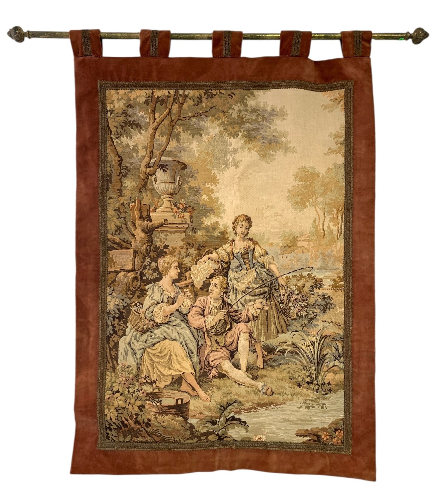 Woven tapestry of a painting by Francois Boucher with a dusty rose pink velvet border.