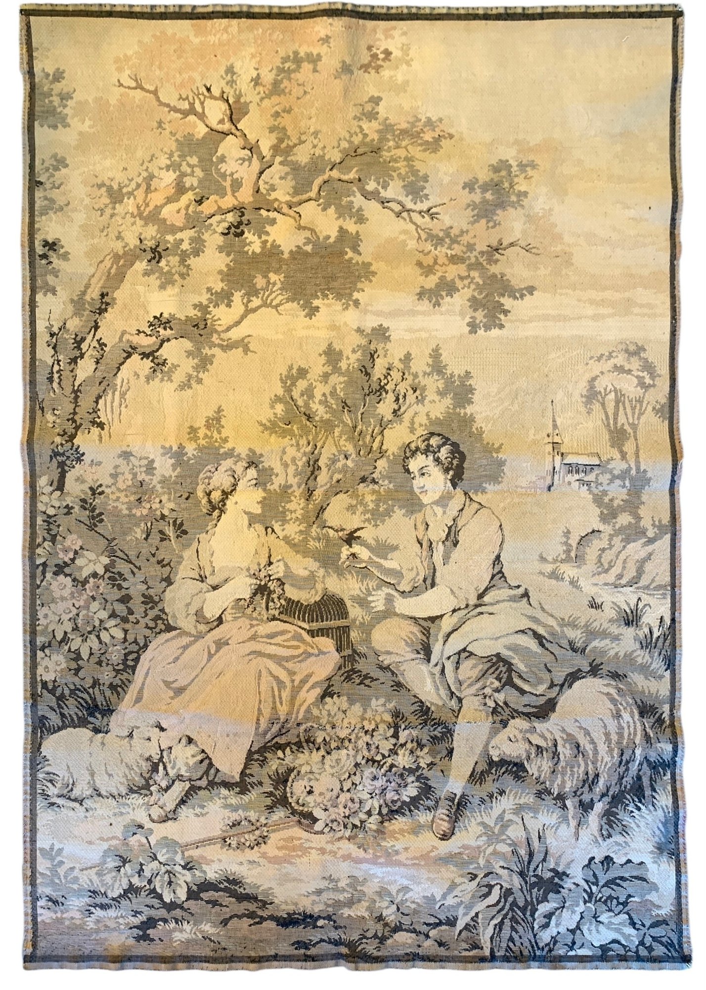 Depicts a romantic courting scene of a gentleman presenting a songbird to a lady, with sheep and flowers at their feet, and a church in the distance.