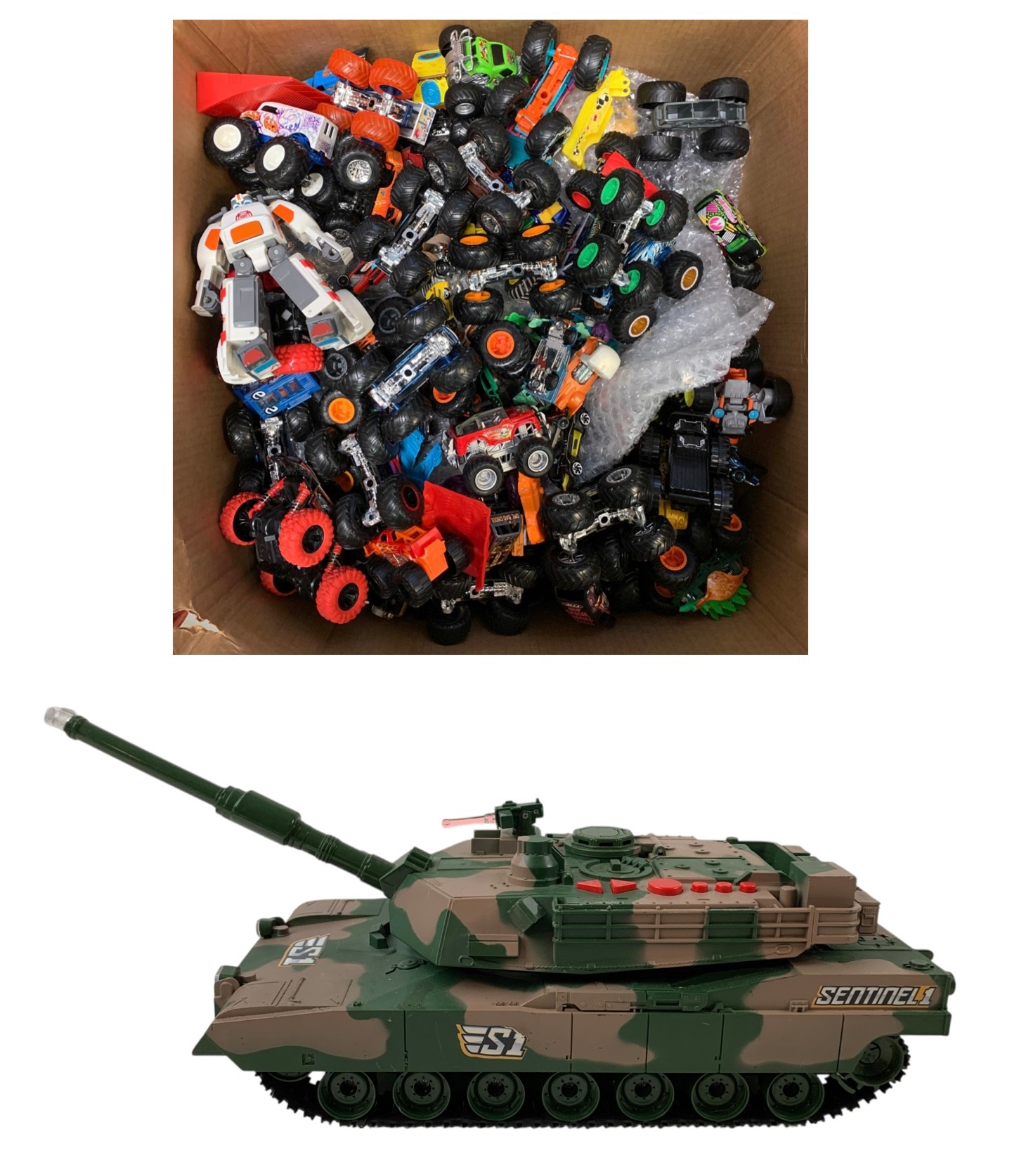 •Box contains several layers of toys separated by layers of bubble wrap - most appear to be monster trucks, may be other toys mixed in, not fully inspected, selling as-is.