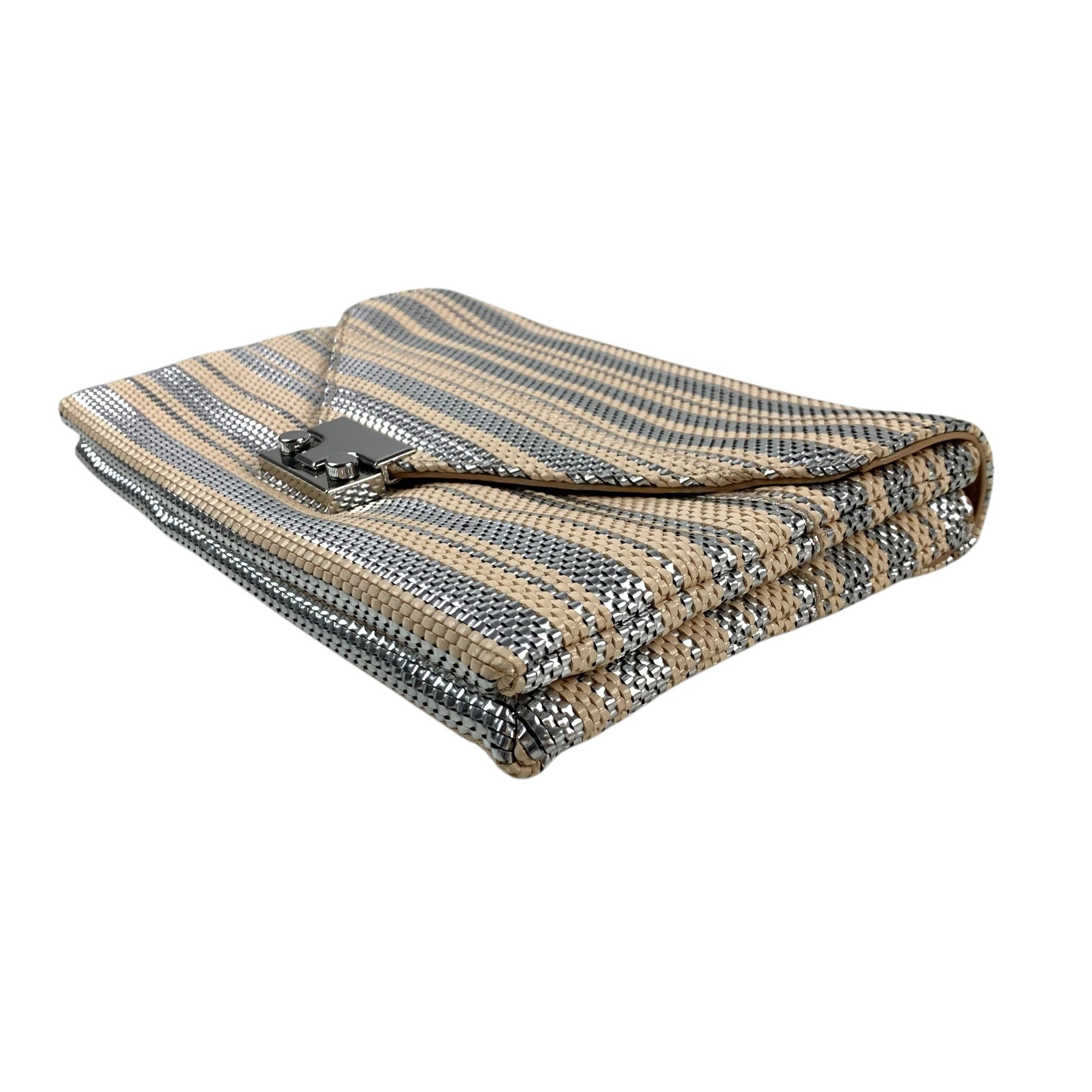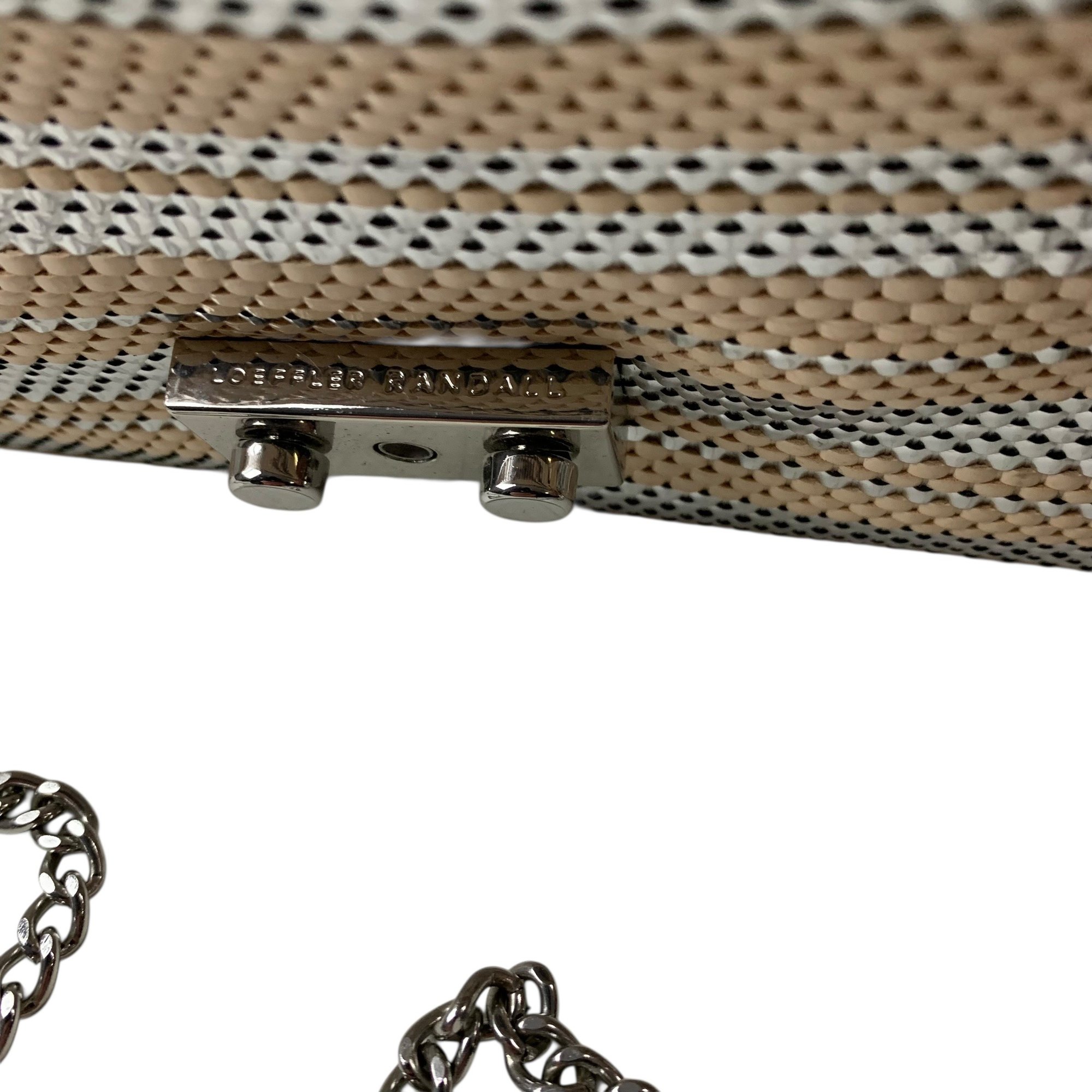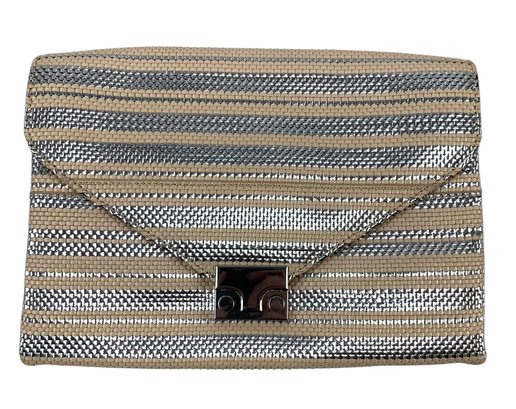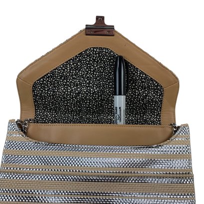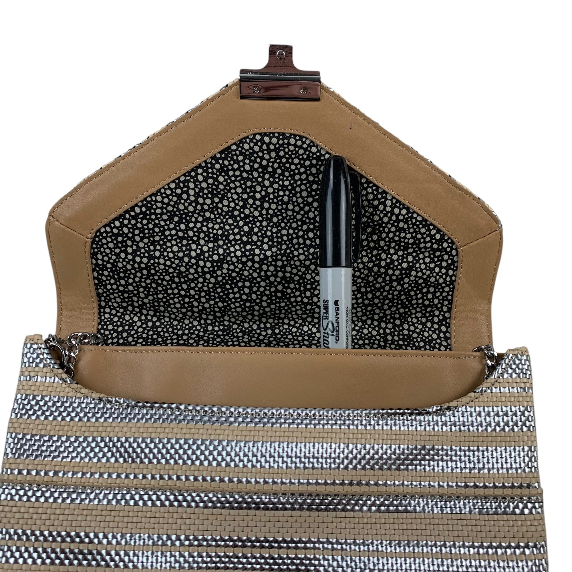 Features silver and beige stripes with silver chainlink crossbody strap.