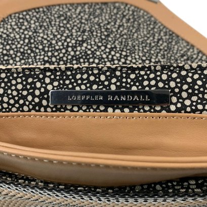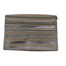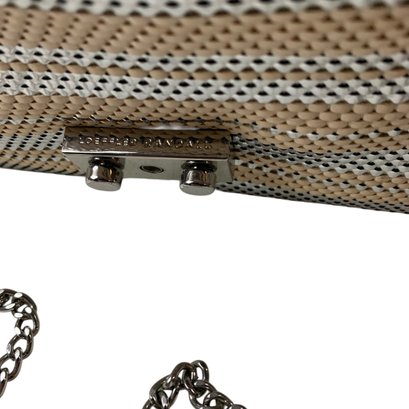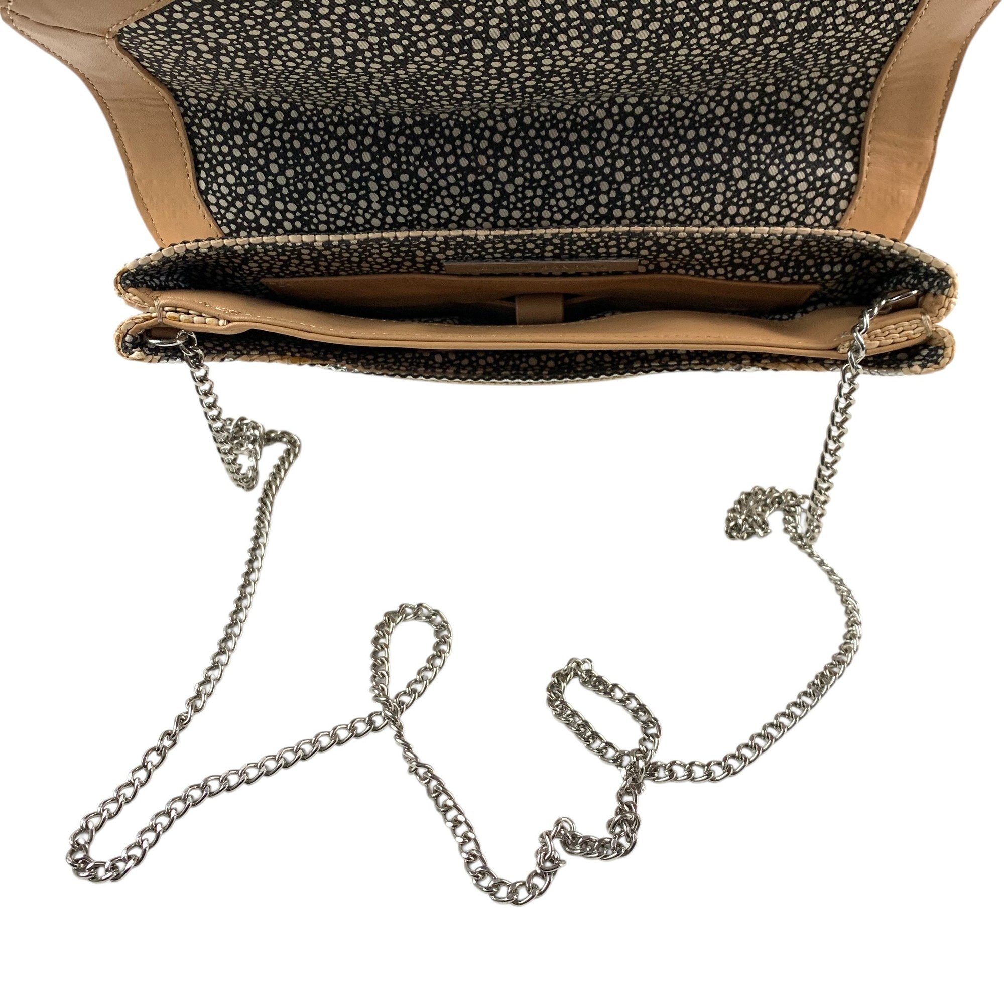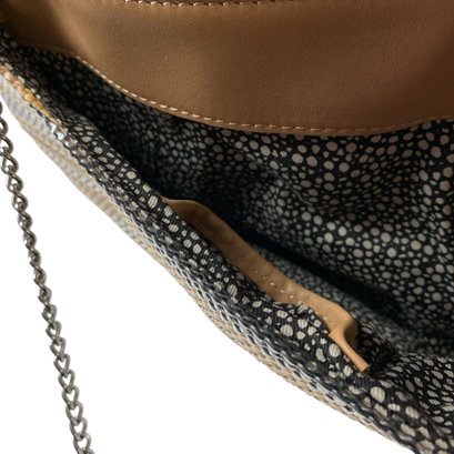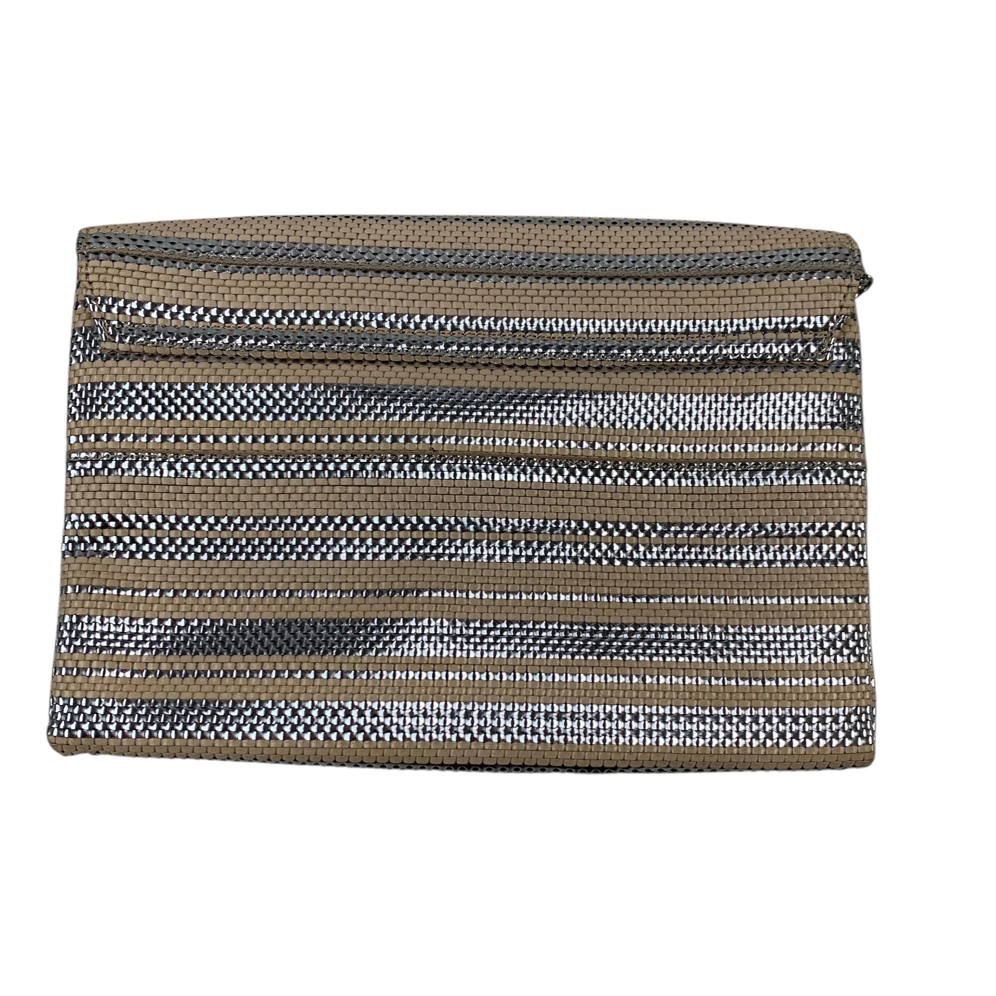 Features silver and beige stripes with silver chainlink crossbody strap.