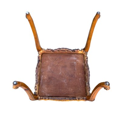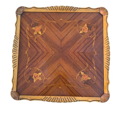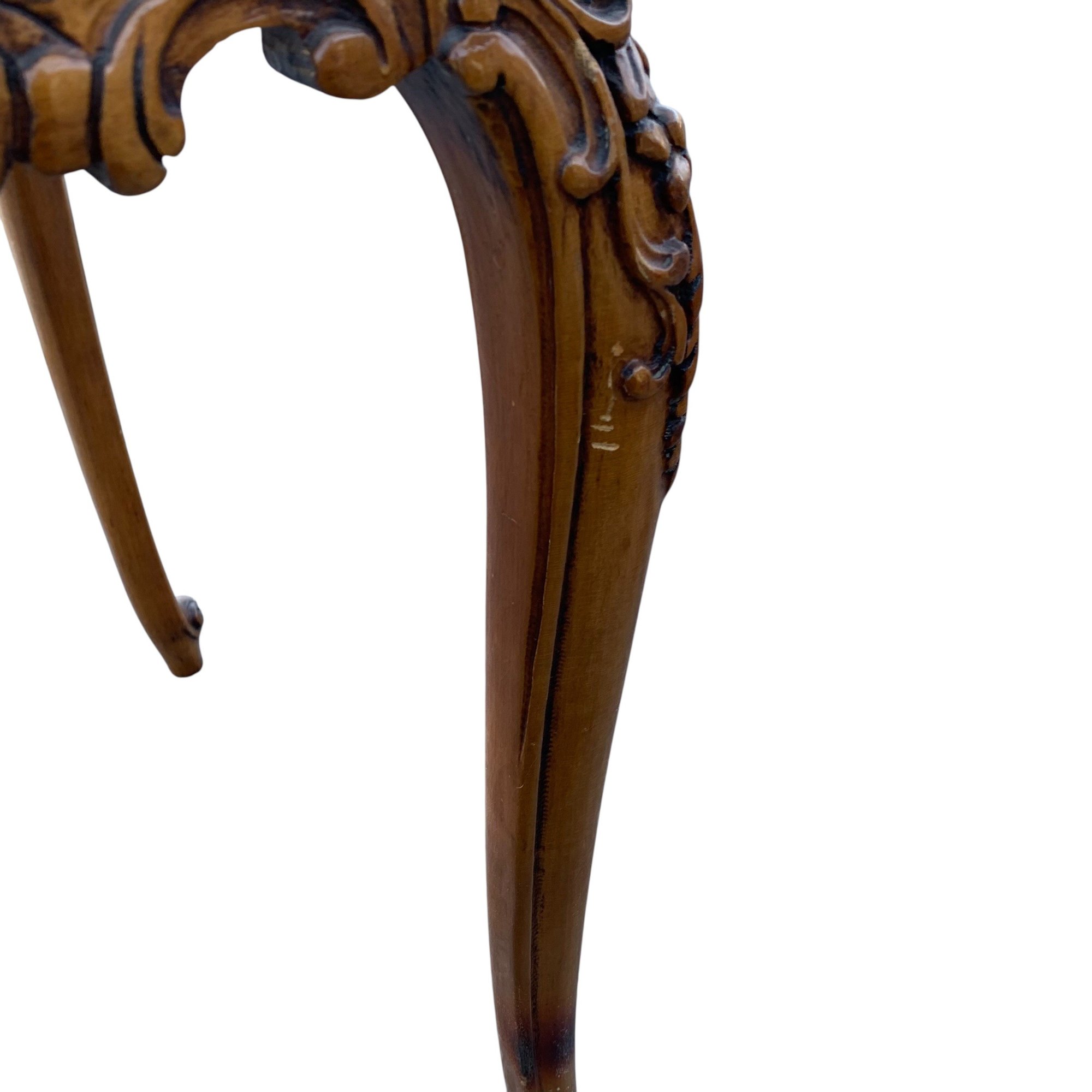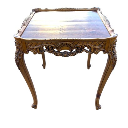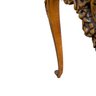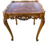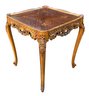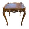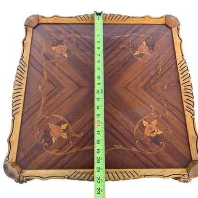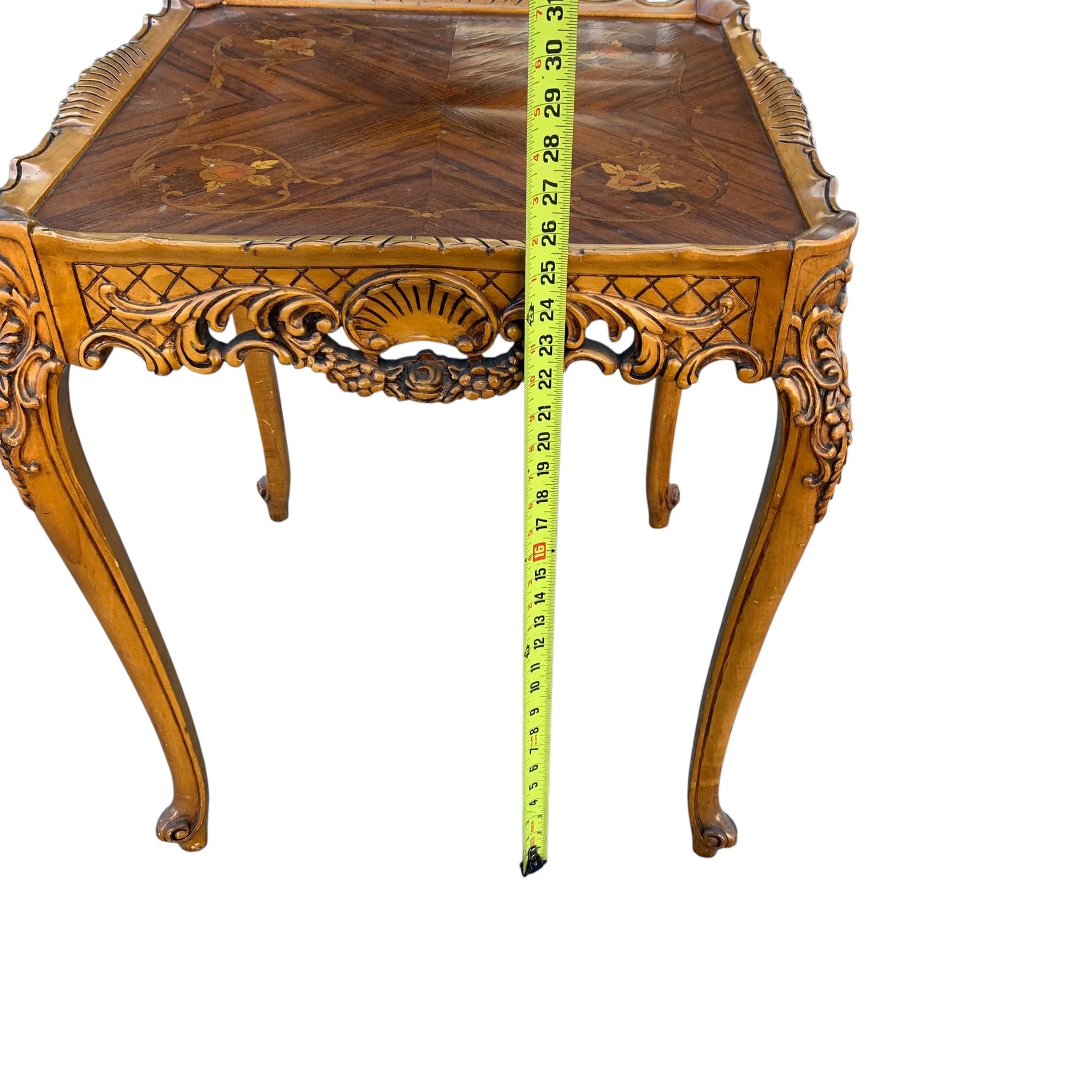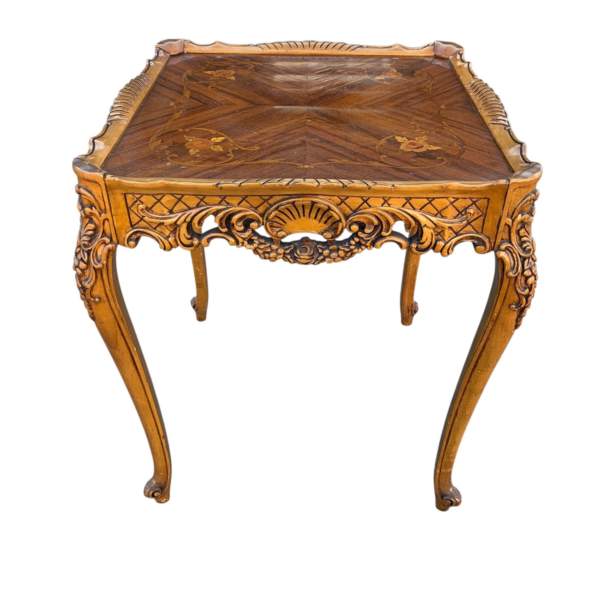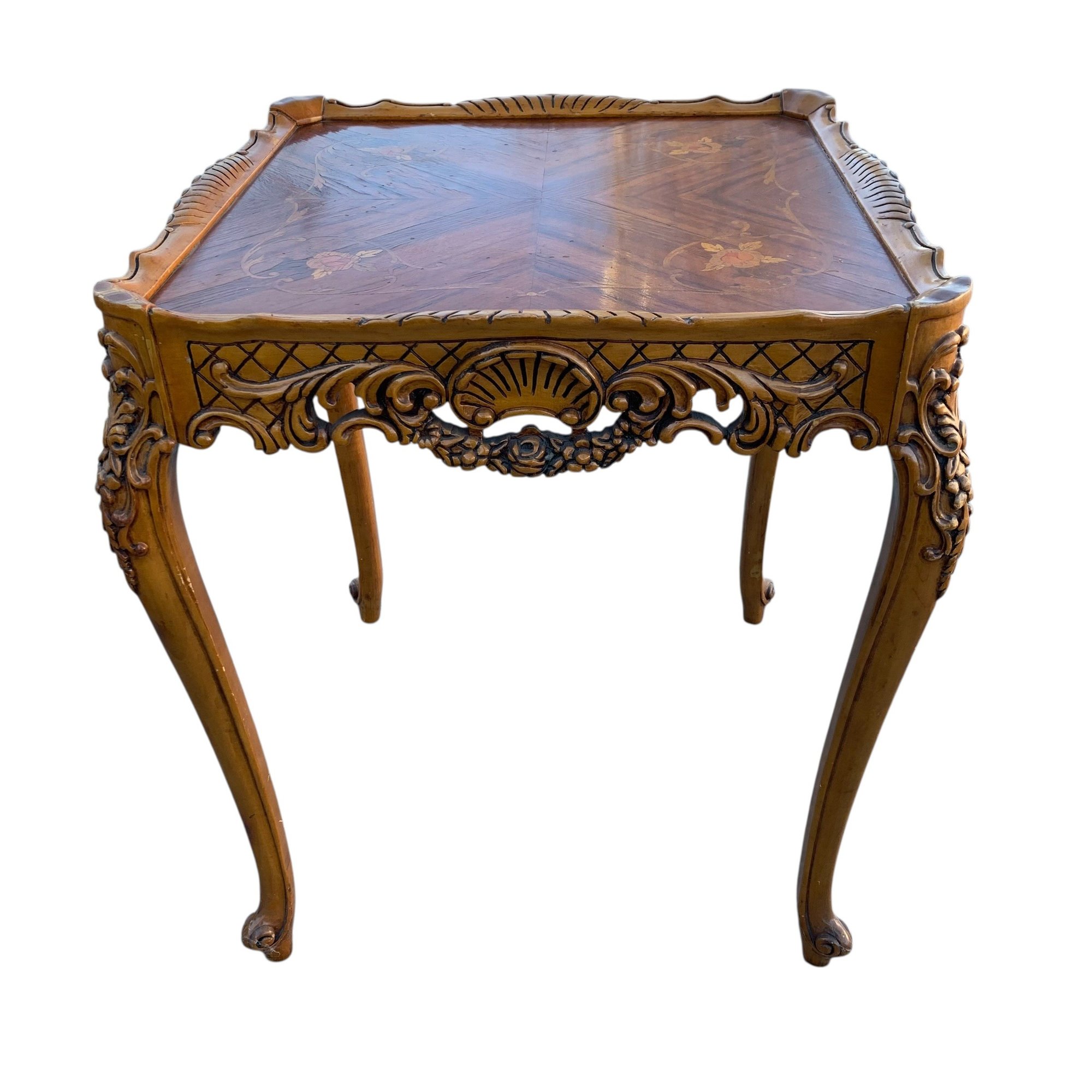 Features a floral wood inlaid top, openwork carved apron and cabriole legs.
