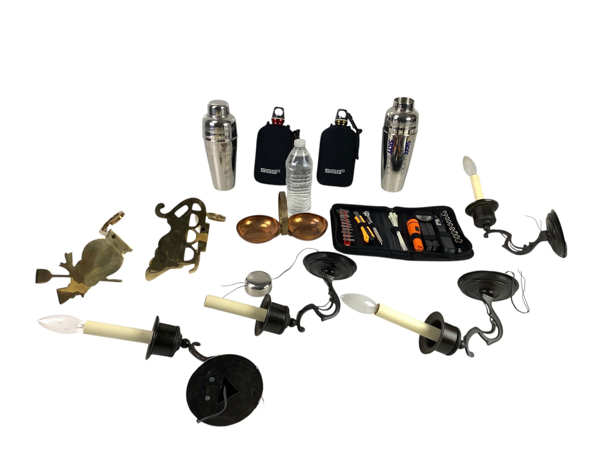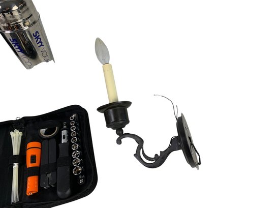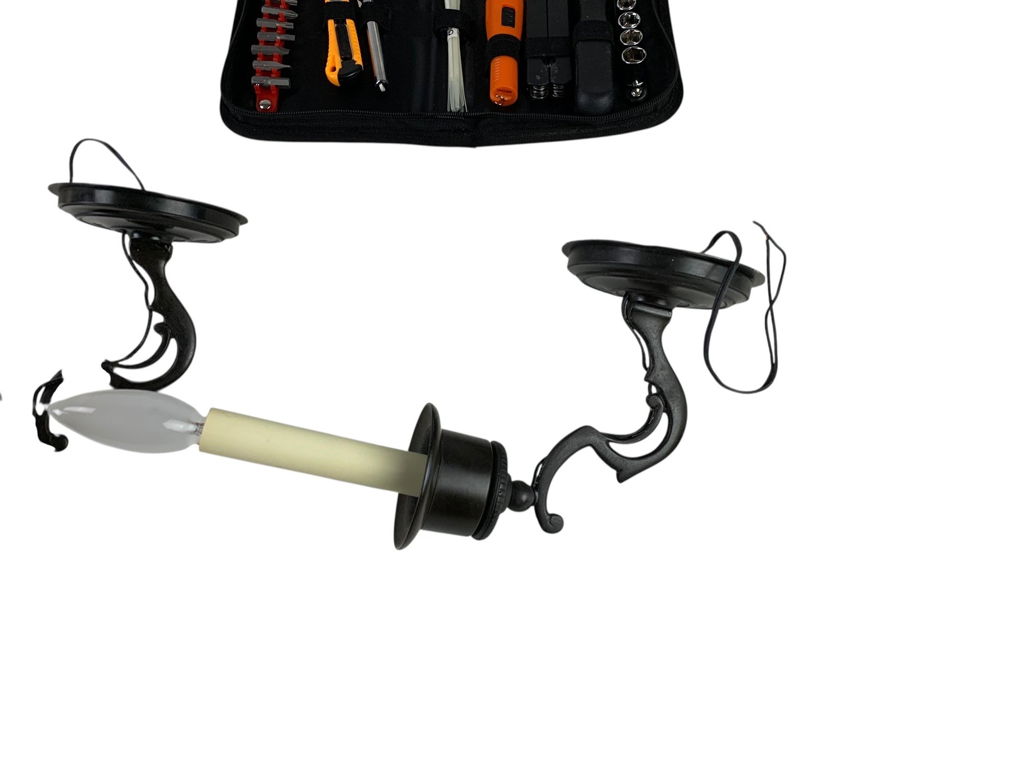 Also includes (2) brass Christmas stocking holders, a portable tool set and (4) electrified wall sconces.
