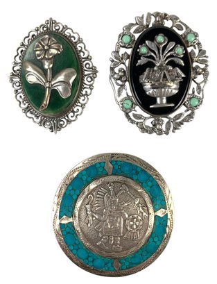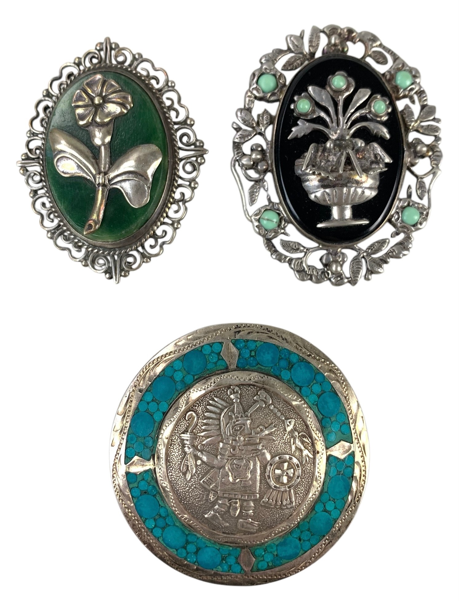 Stamped "Sterling Mexico" on the back of each brooch.