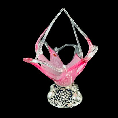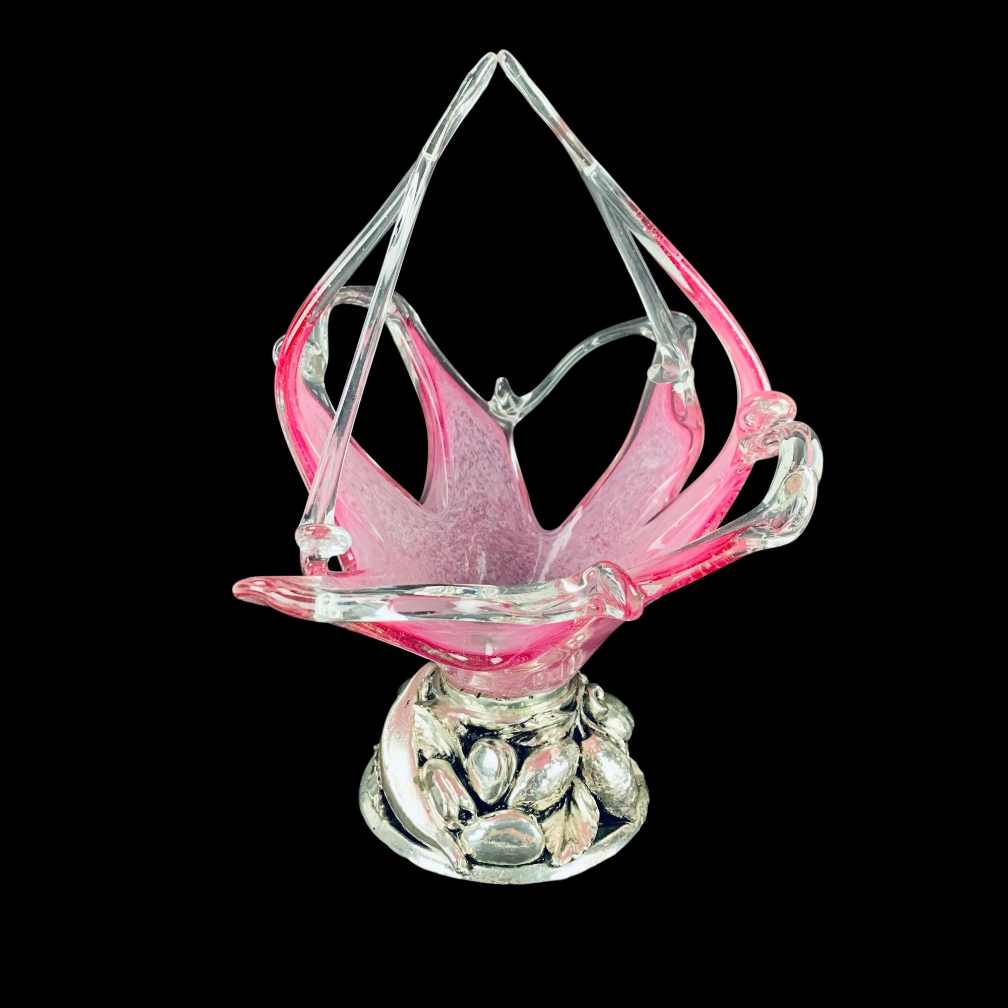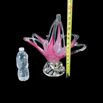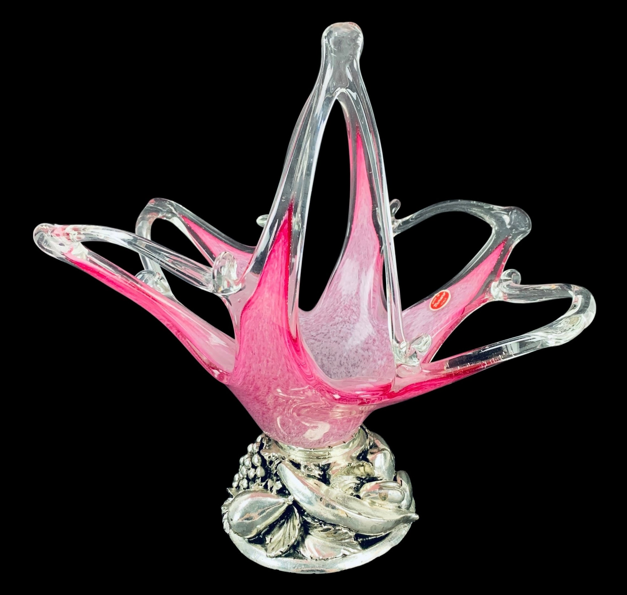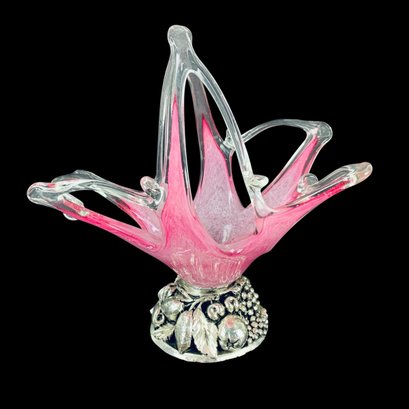 Beautiful dish outlined with clear blown glass handles, pulled shades of pink/fuchsia pink in the center and set on a silver metal base with raised fruit design.