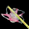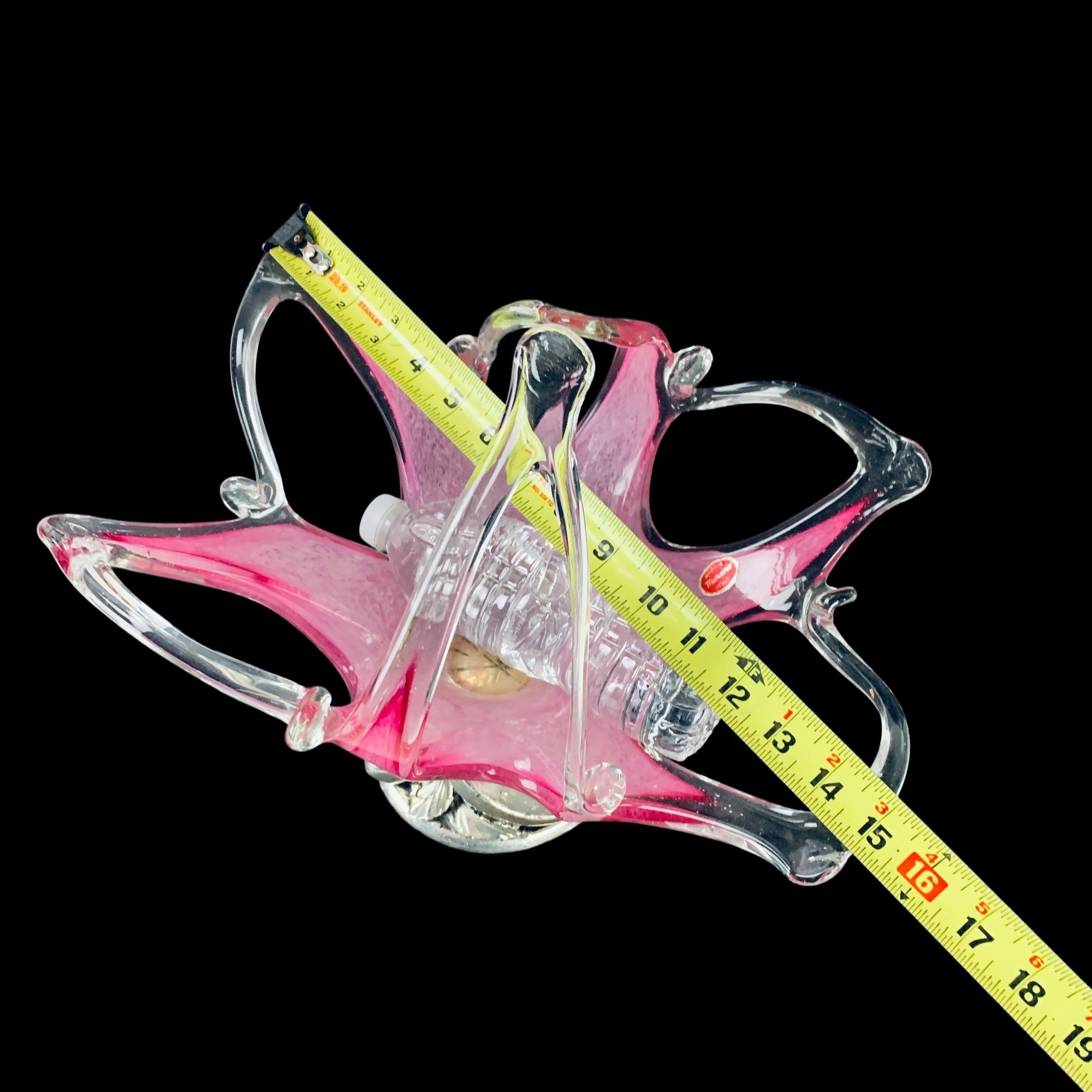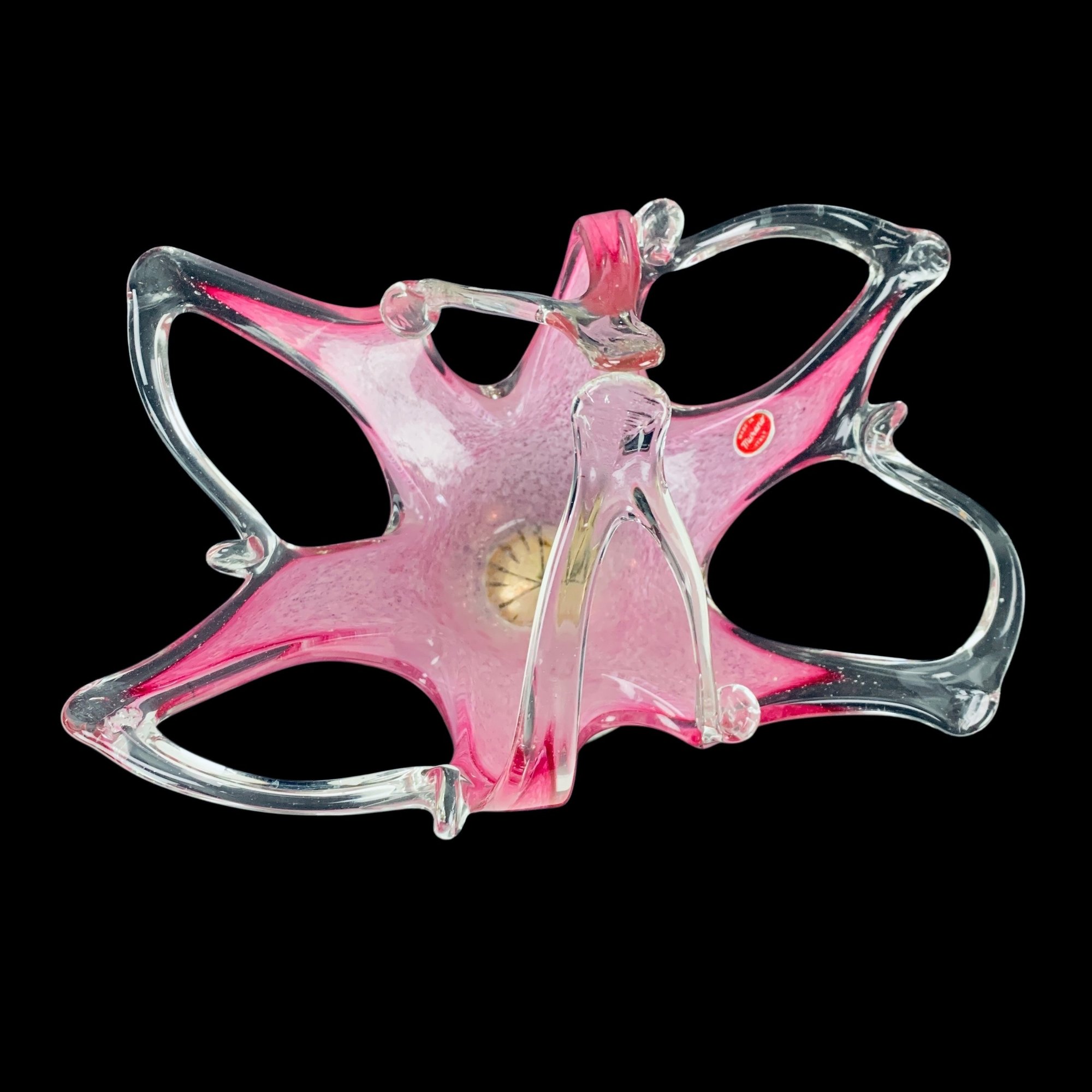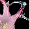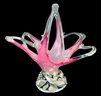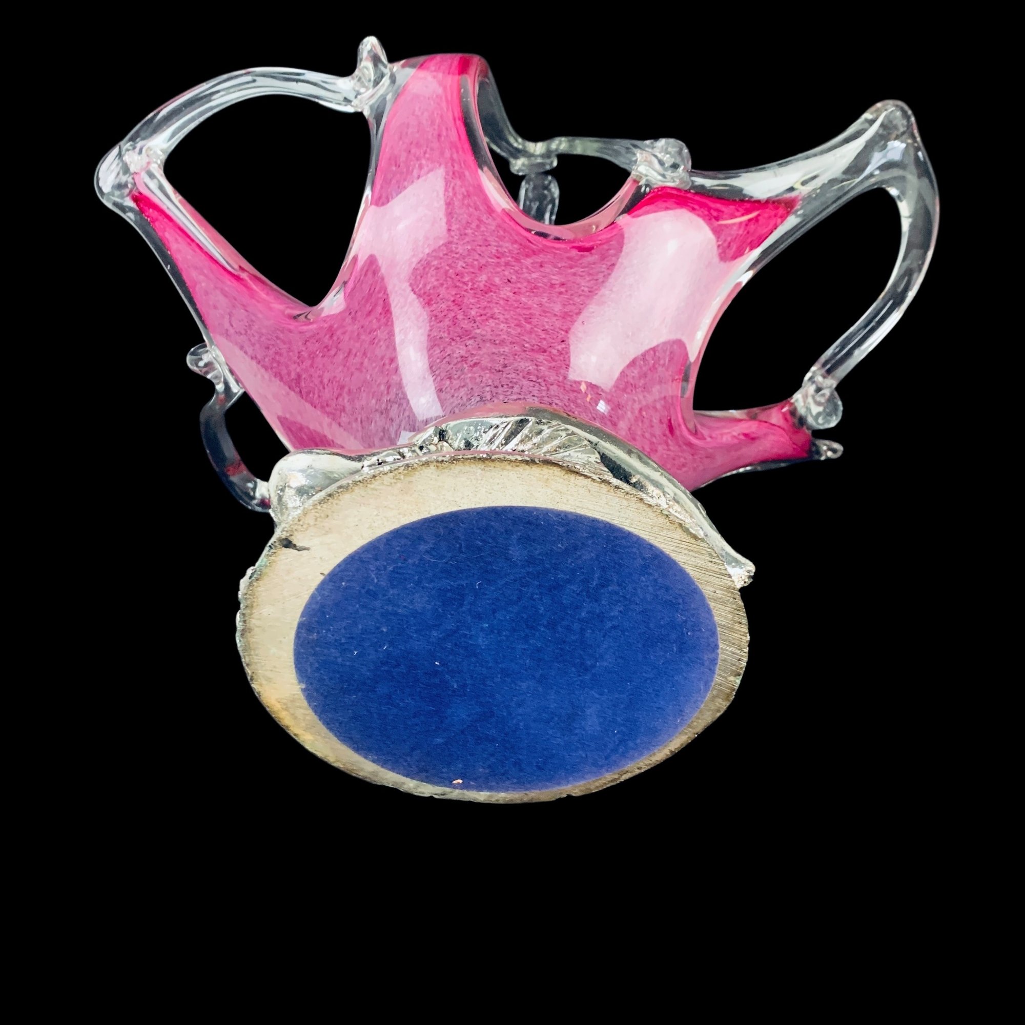 Beautiful dish outlined with clear blown glass handles, pulled shades of pink/fuchsia pink in the center and set on a silver metal base with raised fruit design.