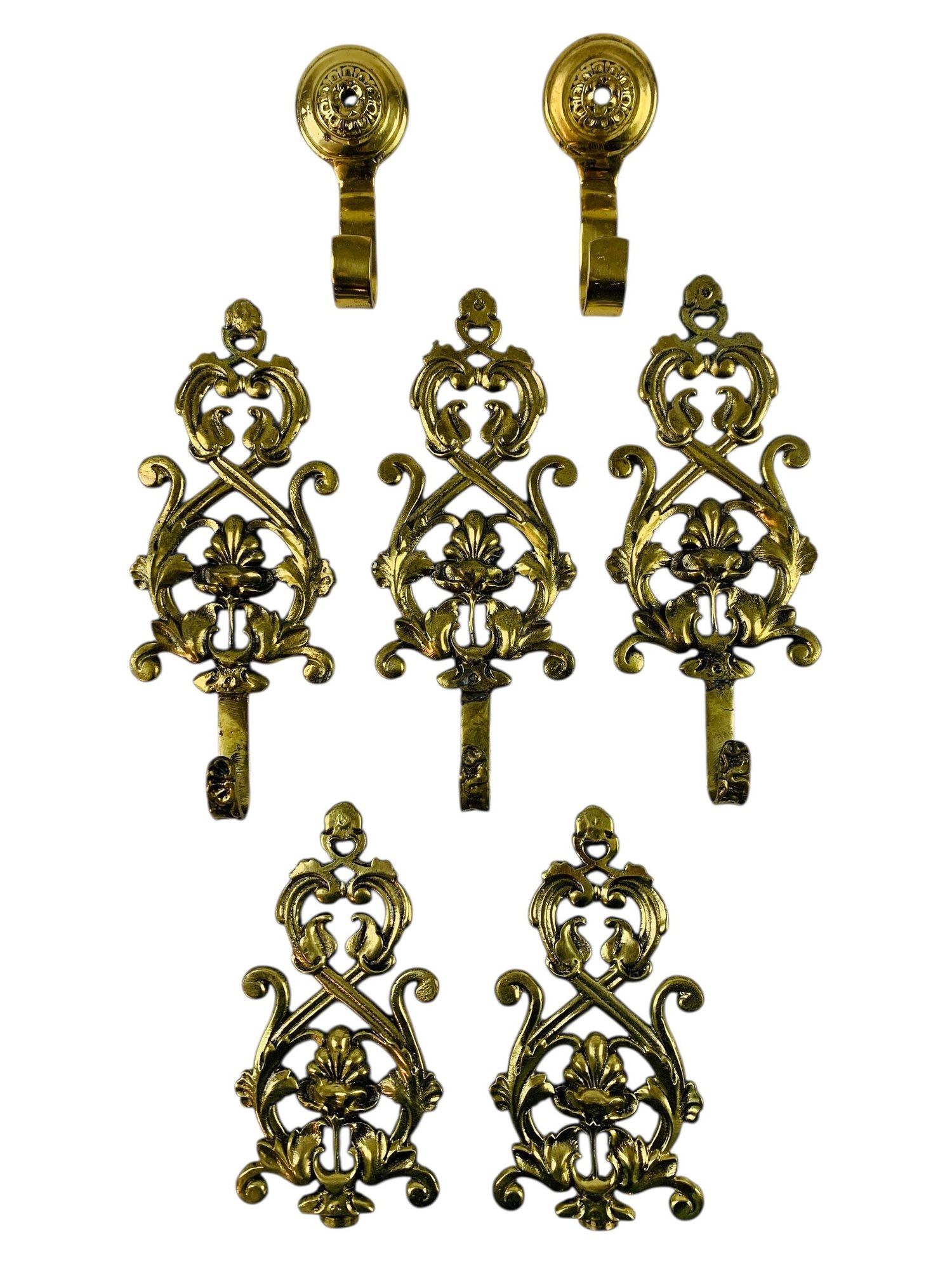 Includes (3) ornate filigree wall hooks, (2) round wall hooks and (2) finials.