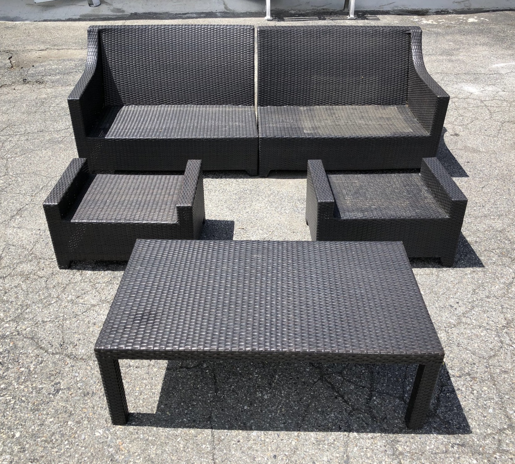 Set includes: 2 settees, 2 ottomans, 1 coffee table - cushions not included.