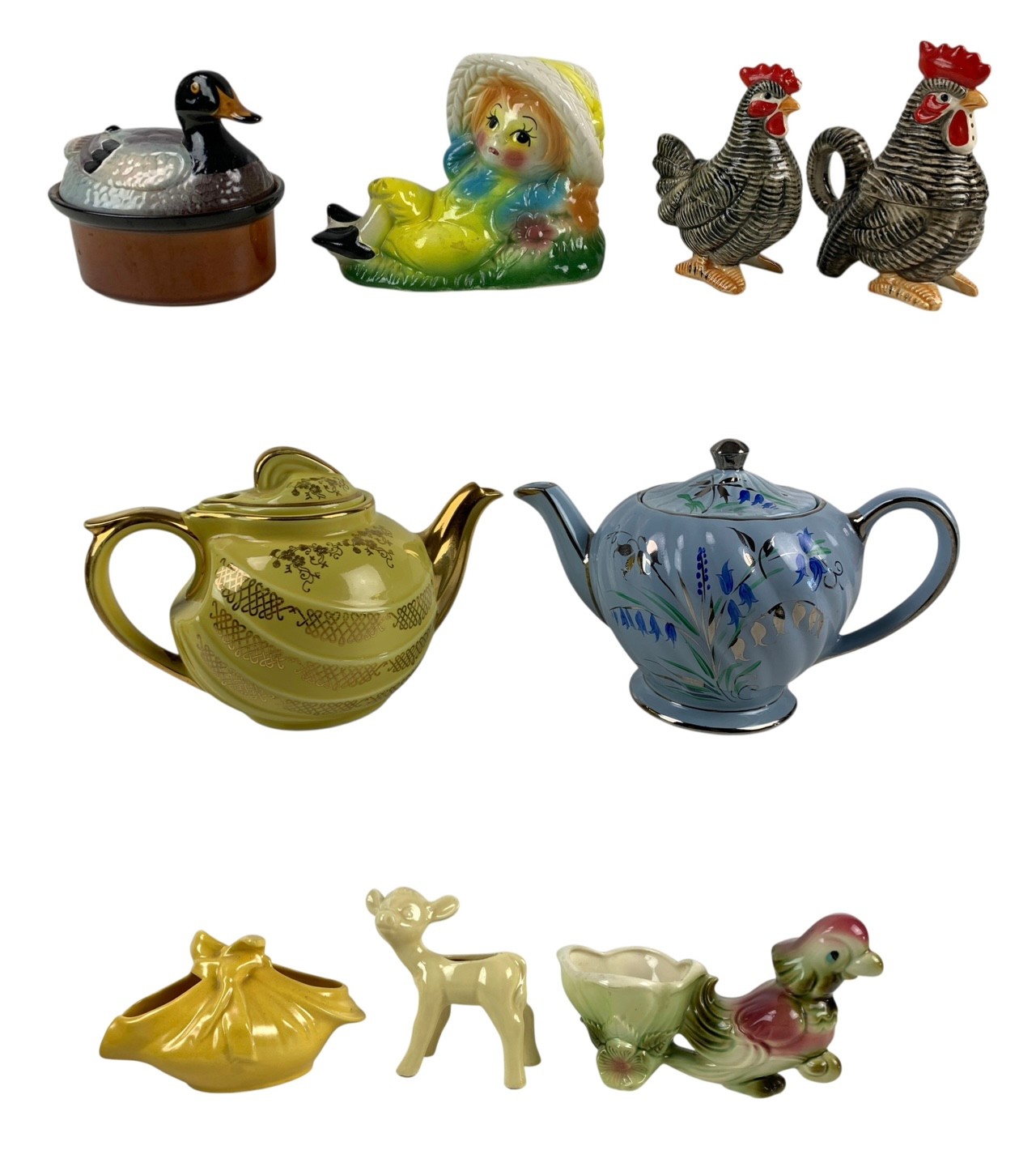 Good condition overall - the duck beak on the casserole dish is broken, and the Sadler teapot has a small chip on the base.