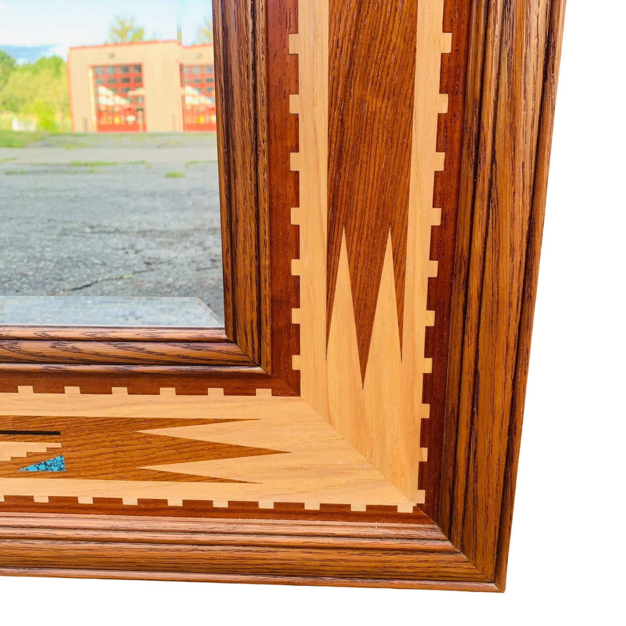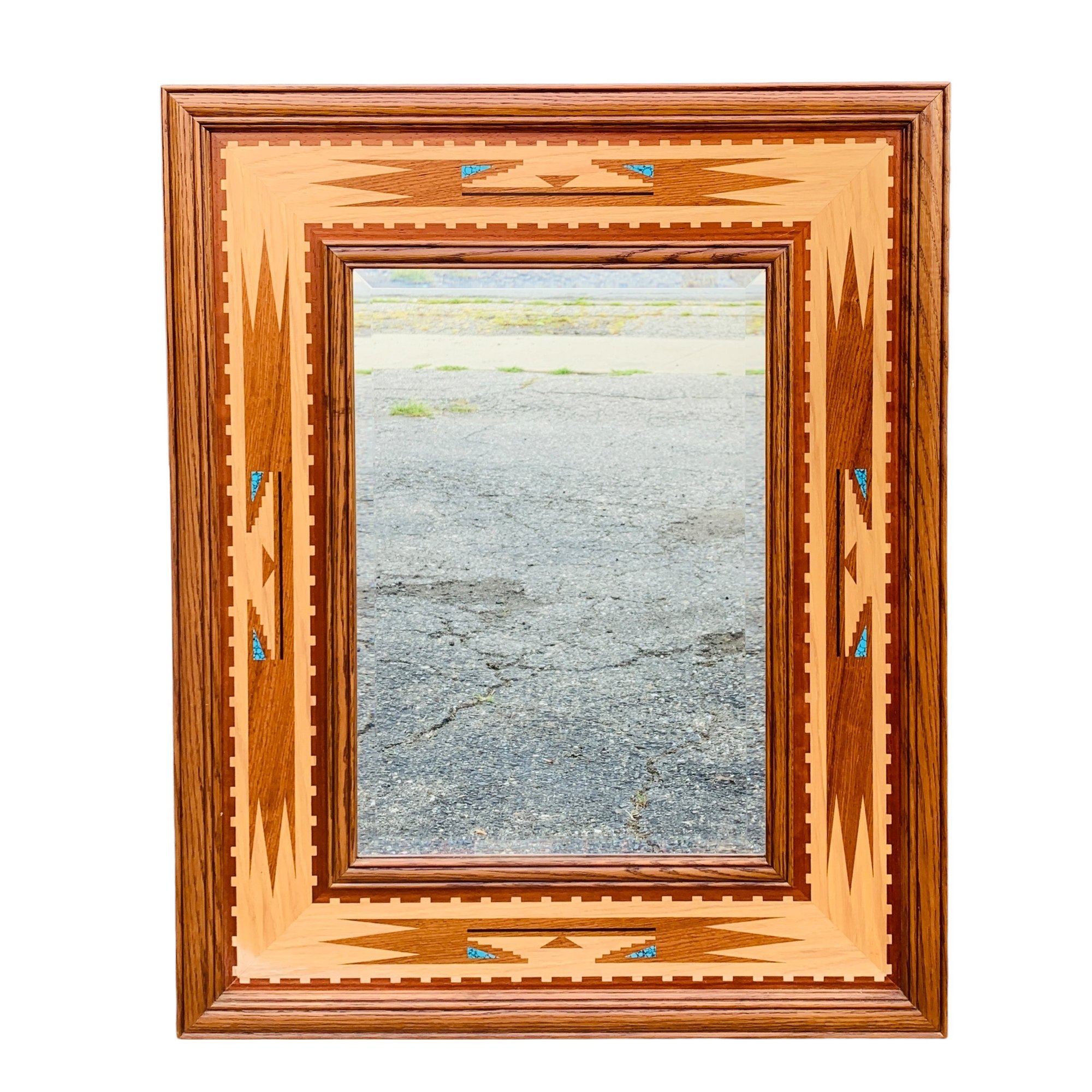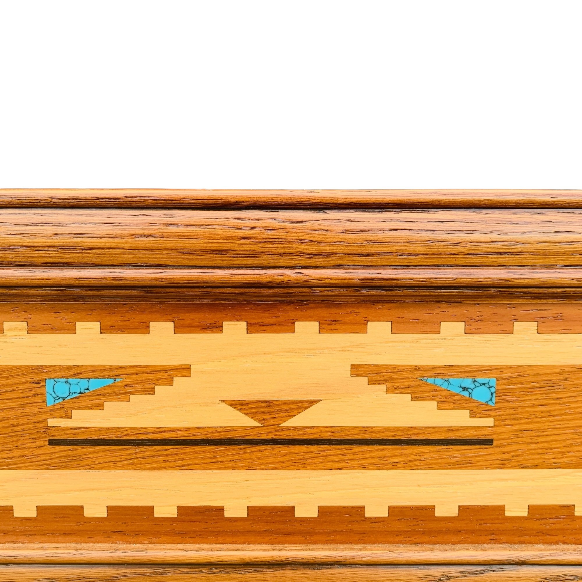 Webbed turquoise and wood inlay in a Southwestern motif.