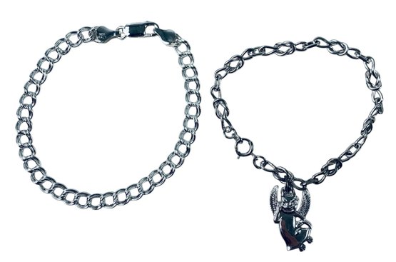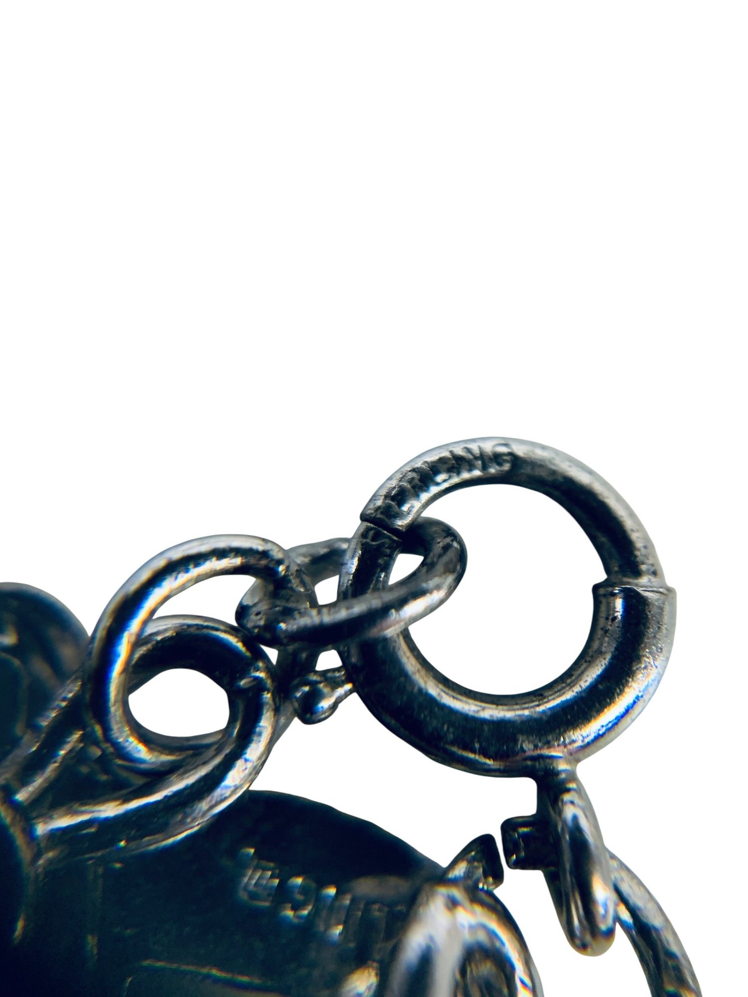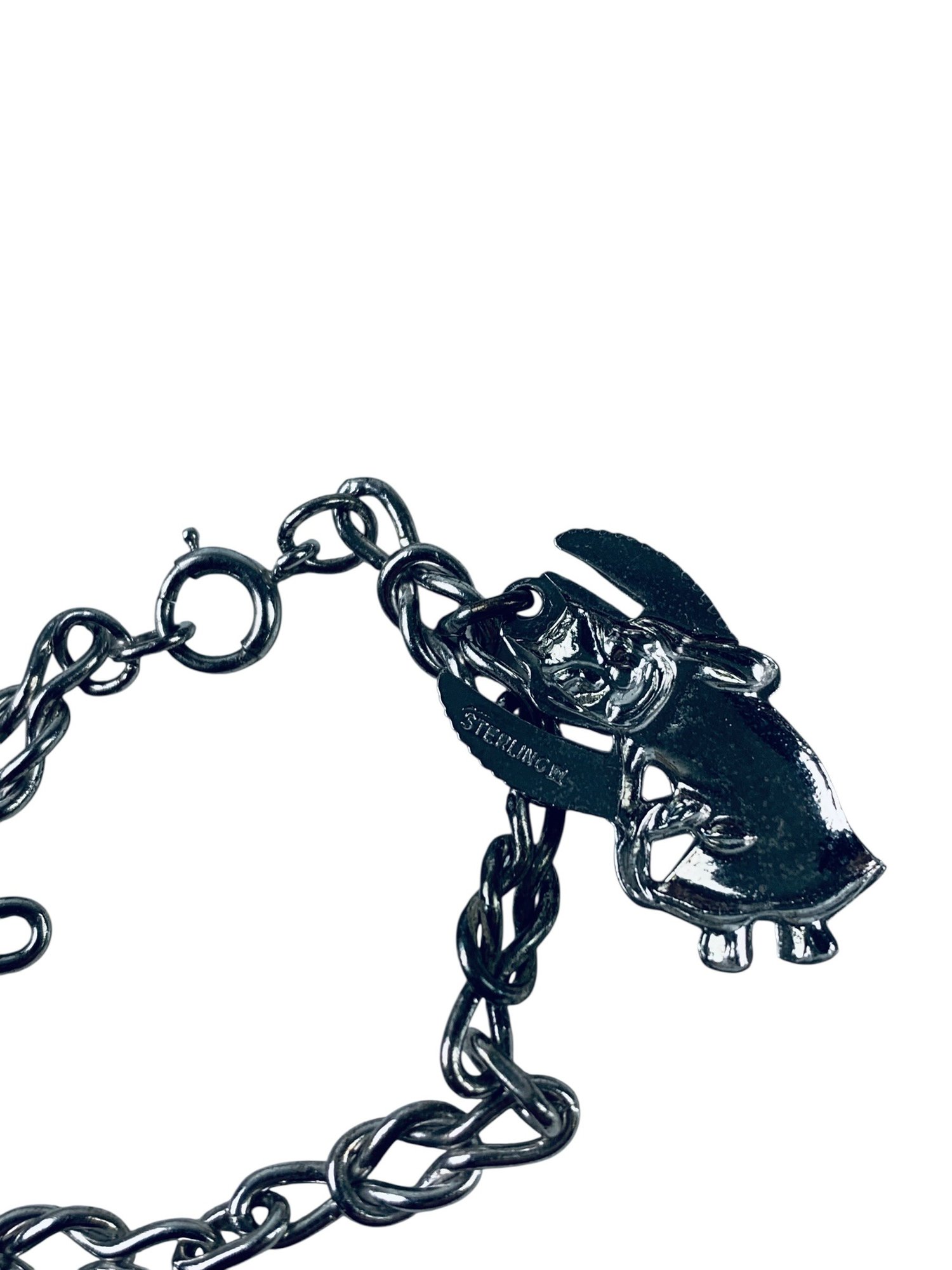 Stamped "Sterling" on the back of the charm and the clasp.