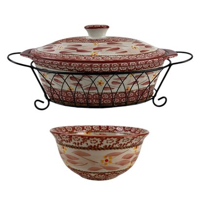 Includes covered casserole dish, metal stand with wicker trivet and 5-3/4" bowl.