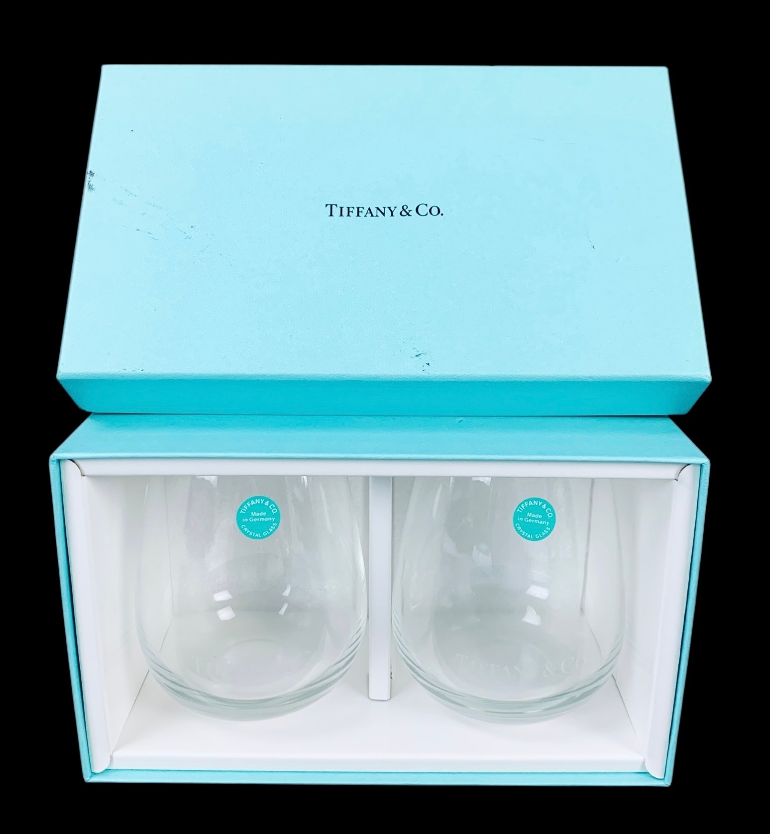 "Tiffany & Co." logo enameled along the lower front of each glass.