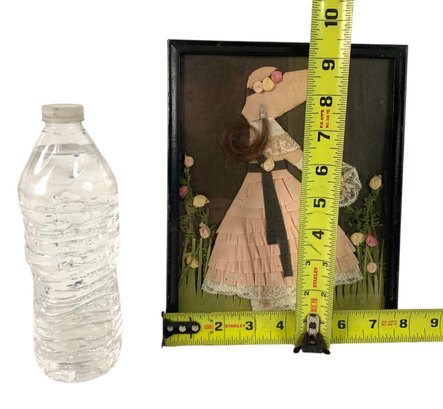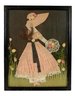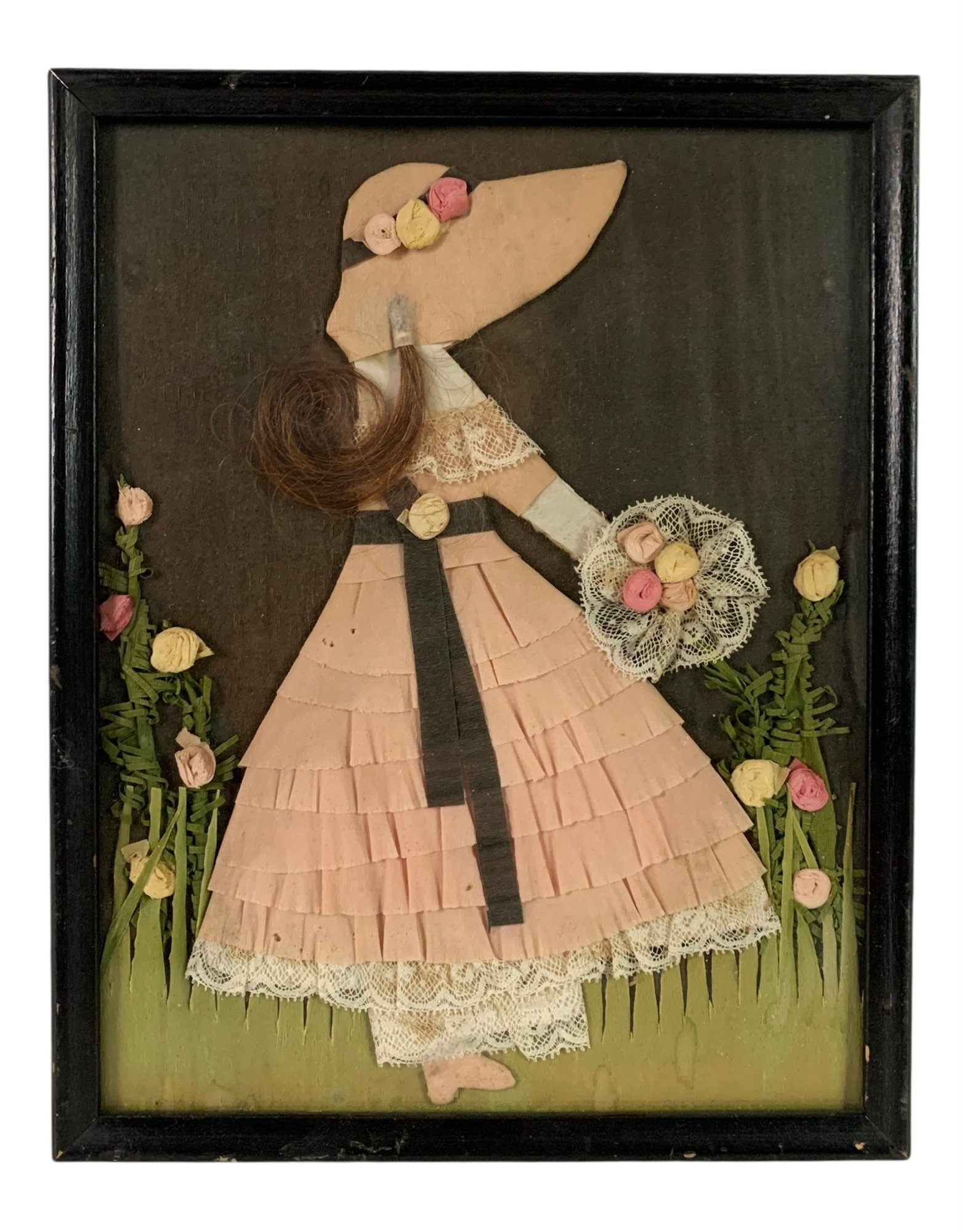 Features a ribbon doll standing in a field of flowers wearing a pink dress with real hair poking out from under her matching hat.