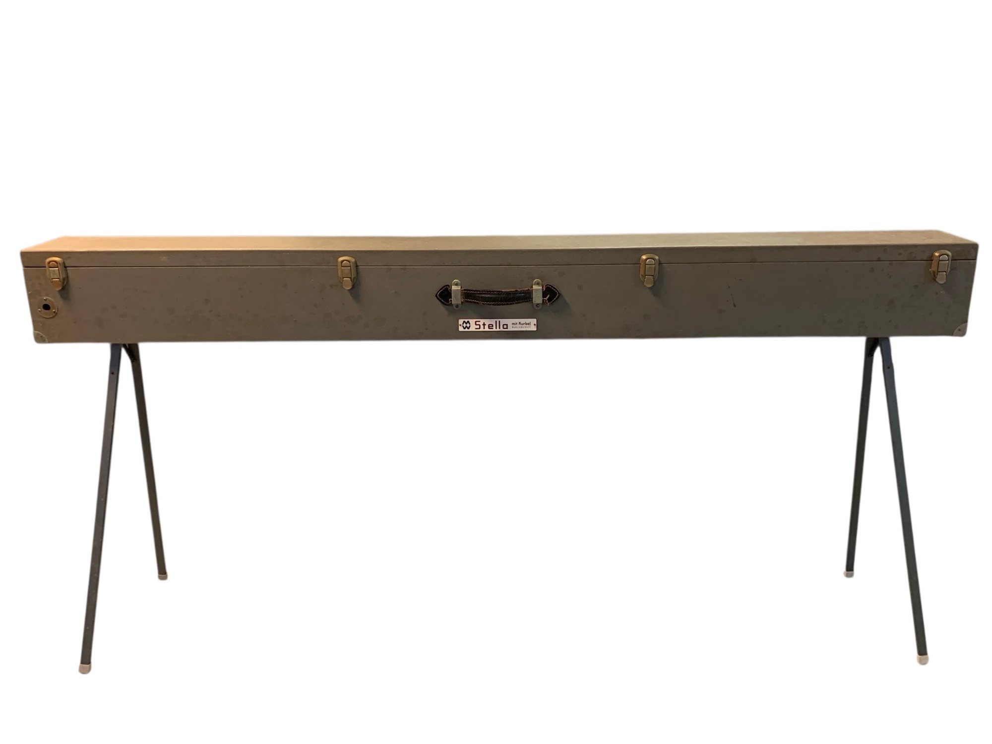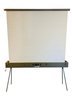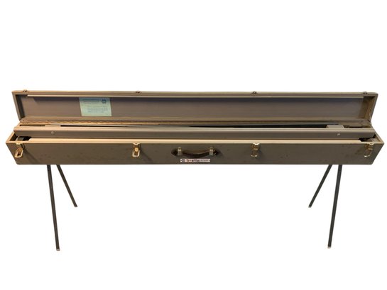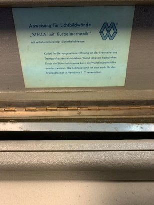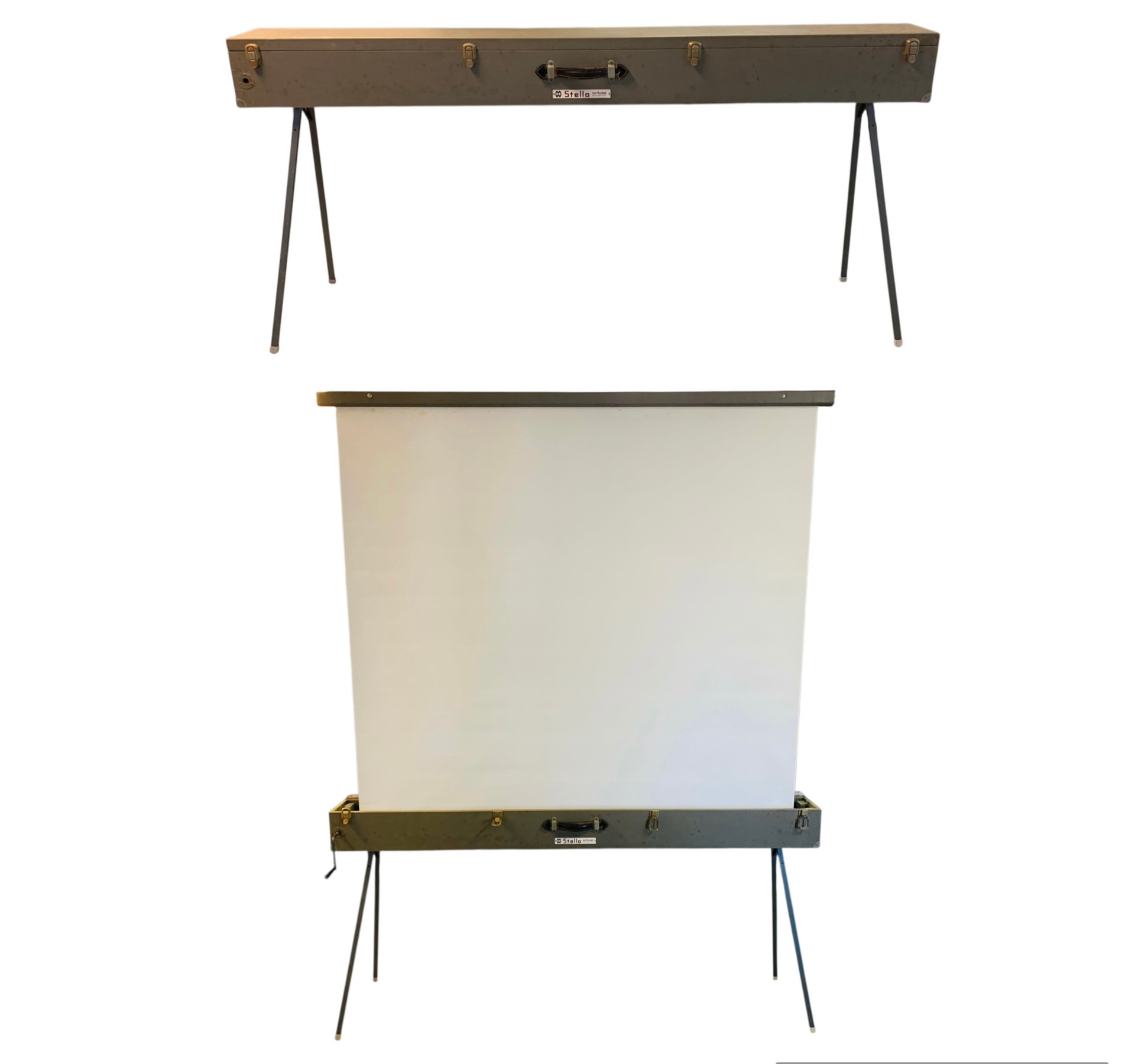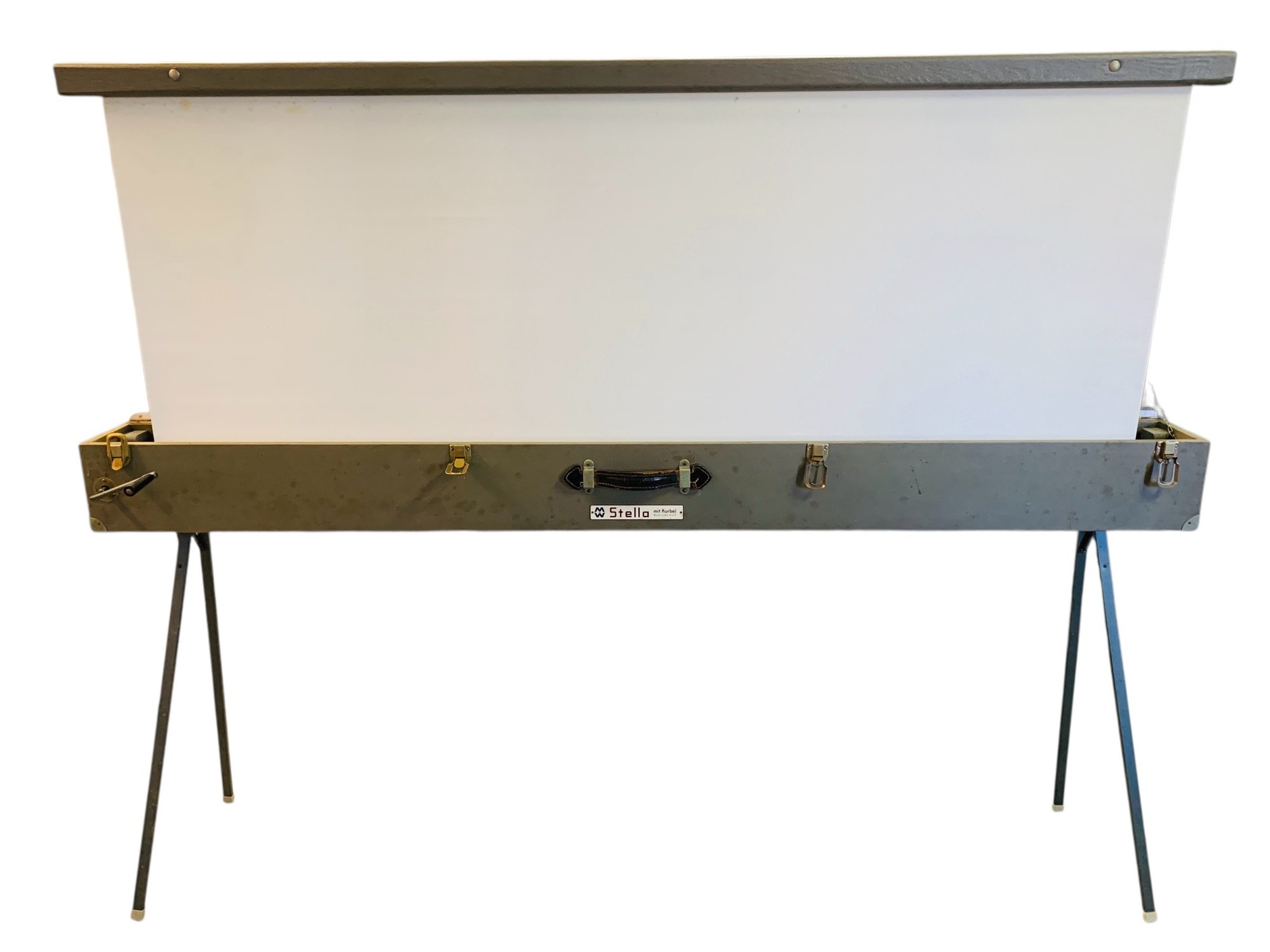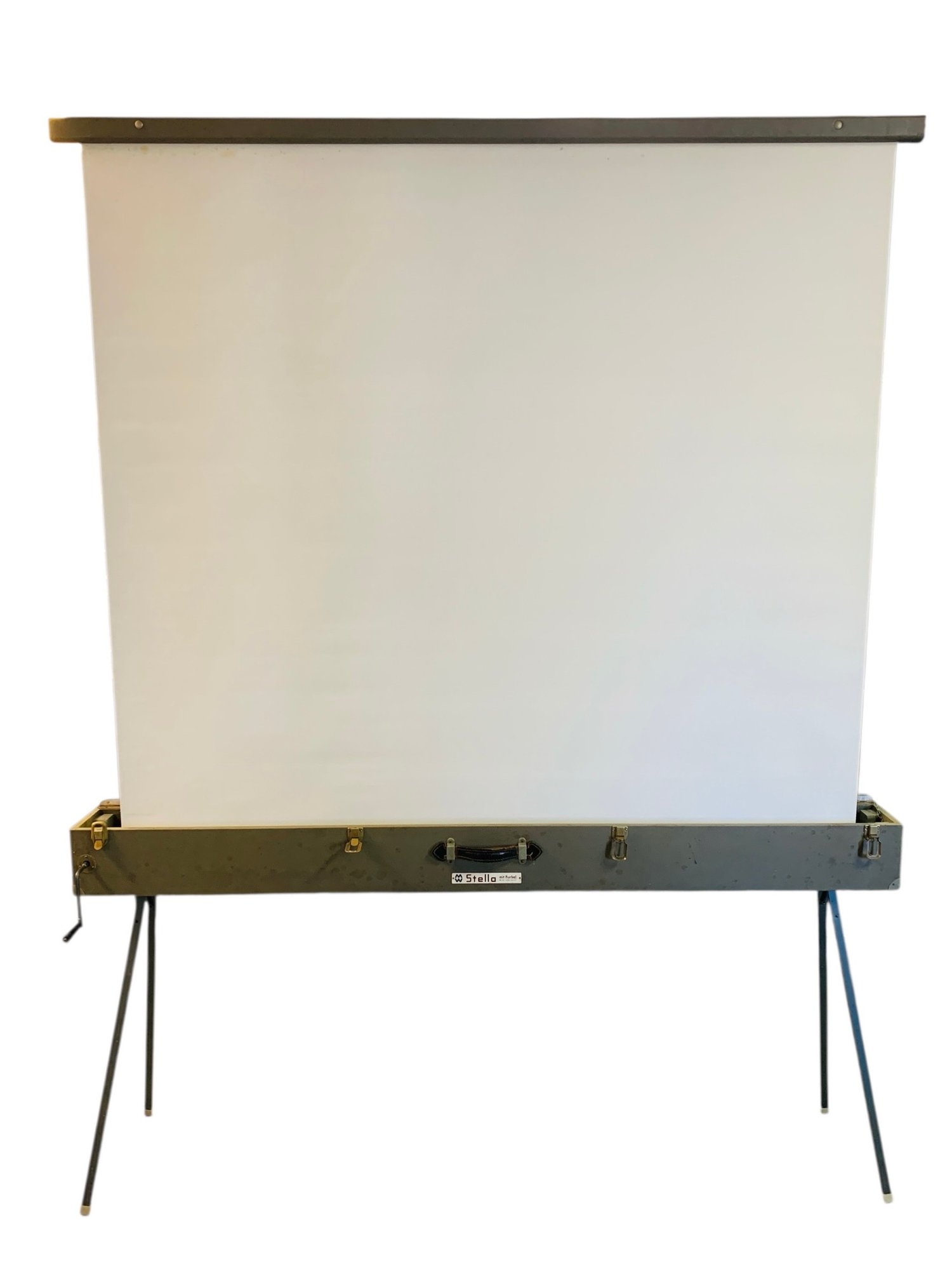 Features: folding metal legs, wood case with four latches and leather handle, cranks for raising the cloth screen up and down to the desired height.