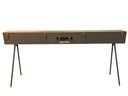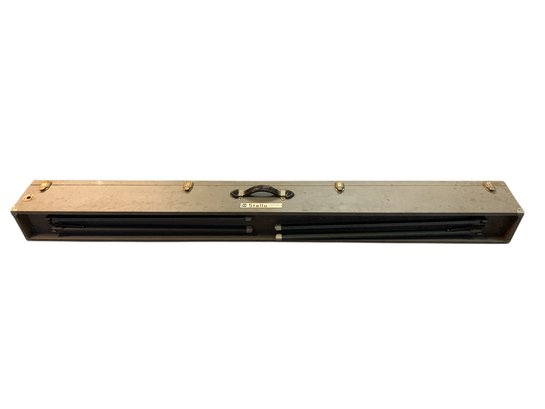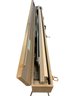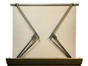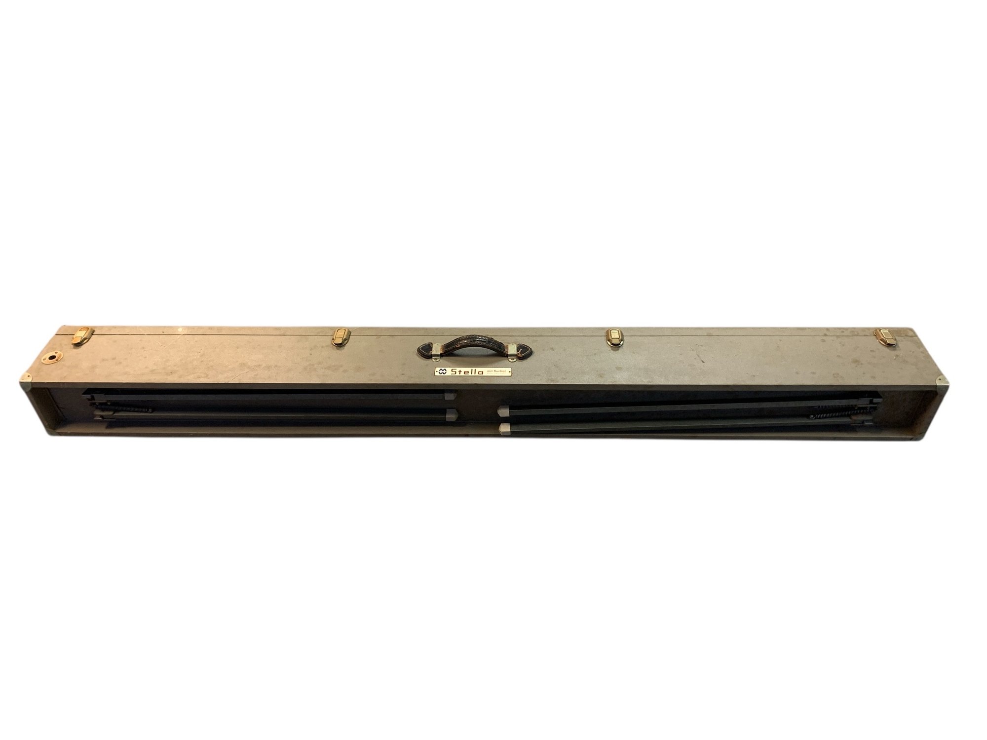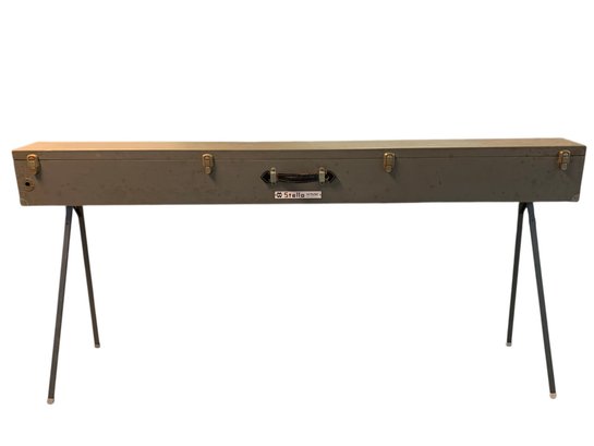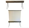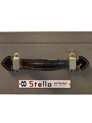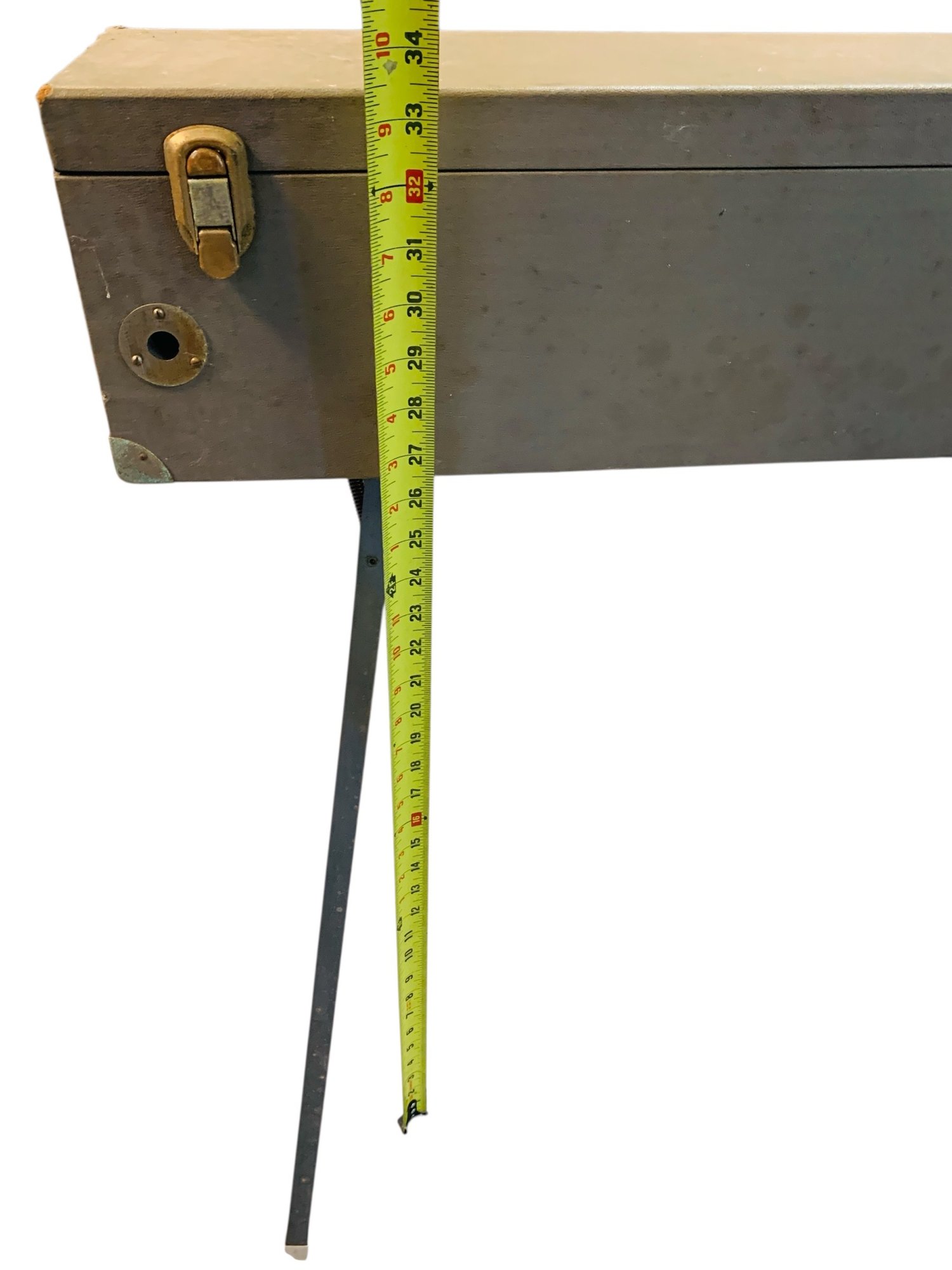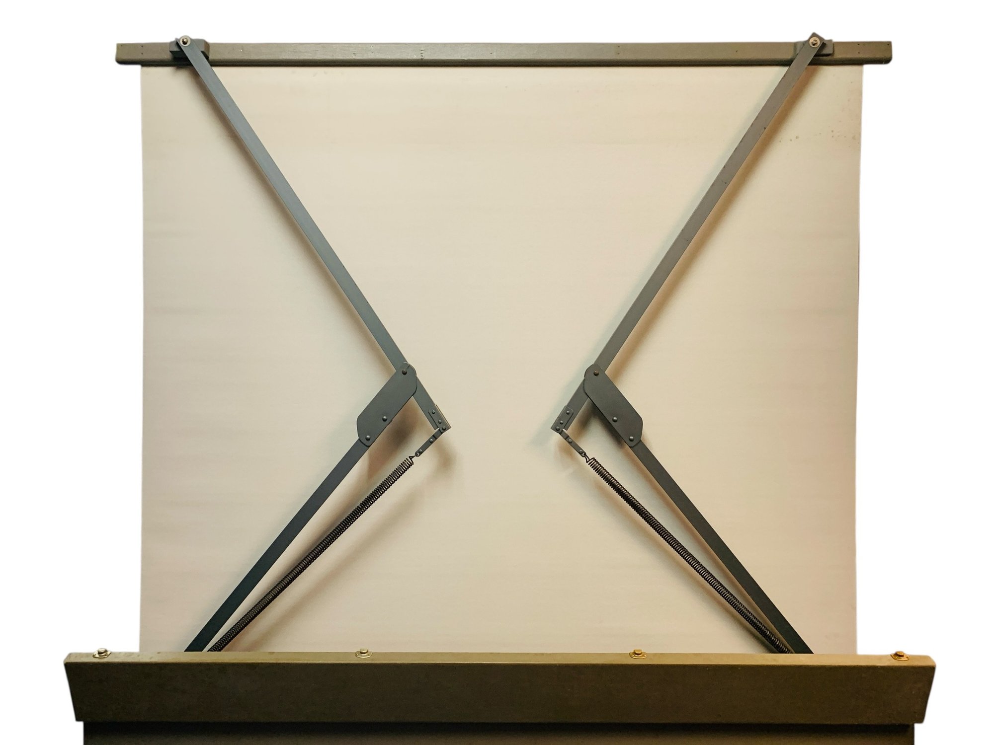 Features: folding metal legs, wood case with four latches and leather handle, cranks for raising the cloth screen up and down to the desired height.