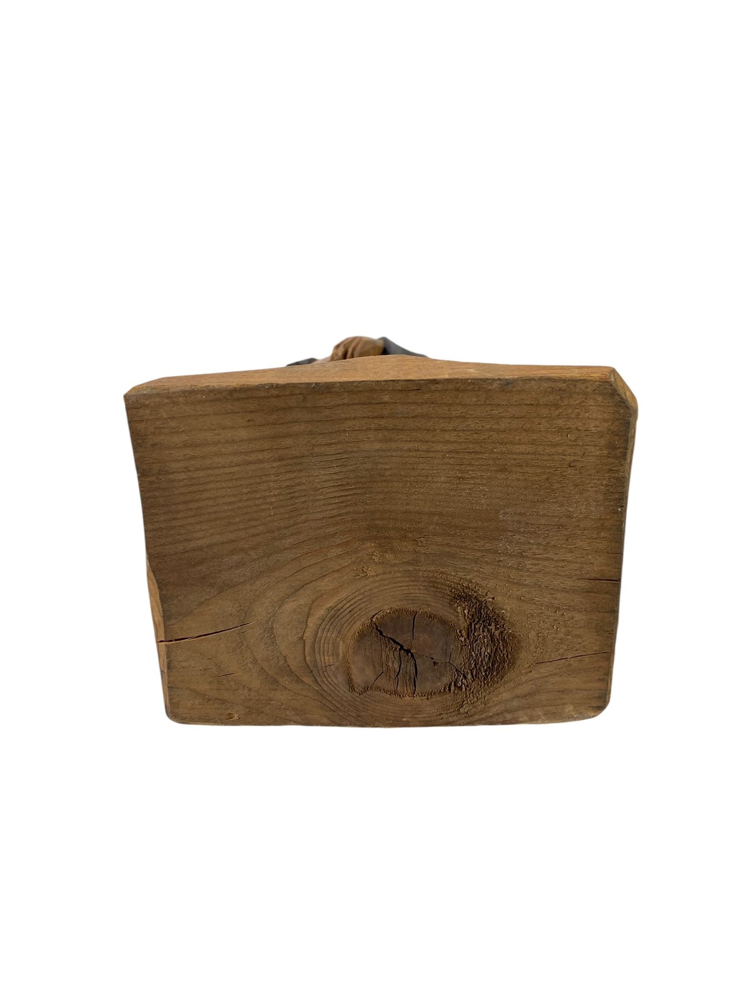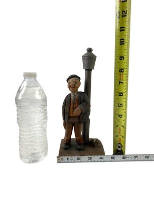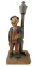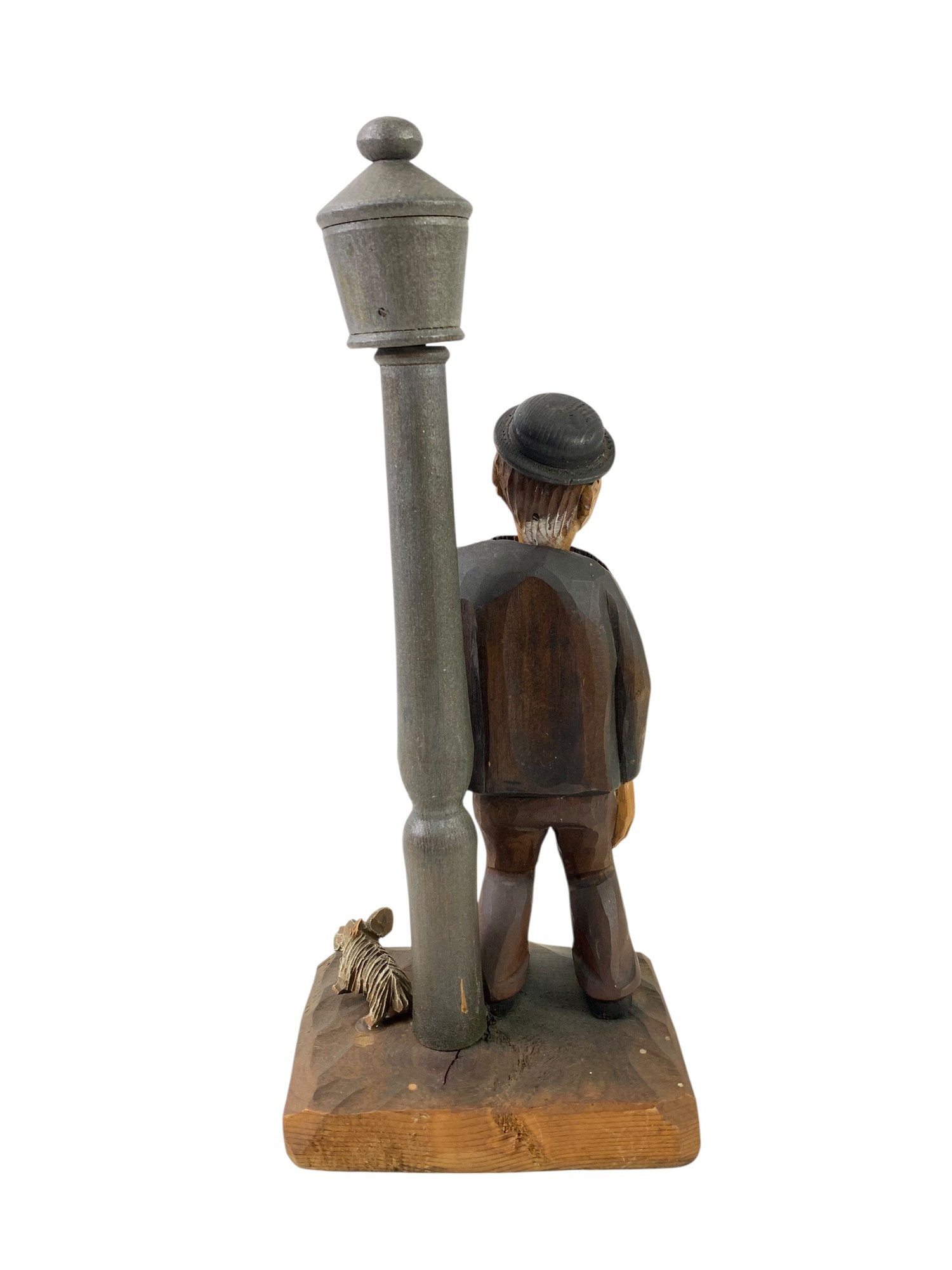 Hand carved and painted drunkard leaning against a light post with a terrier at his feet.