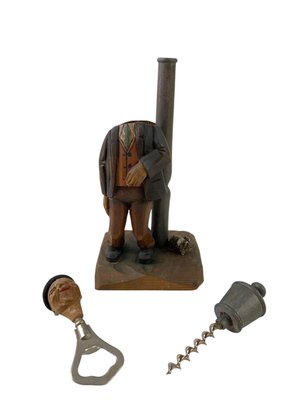 The man's head and the top of the lamp post reveal a hidden bottle opener and corkscrew.