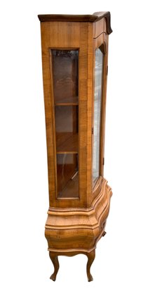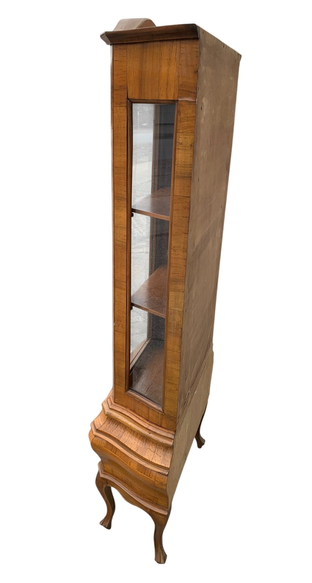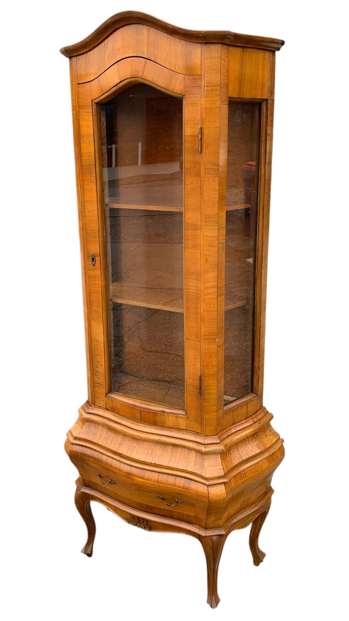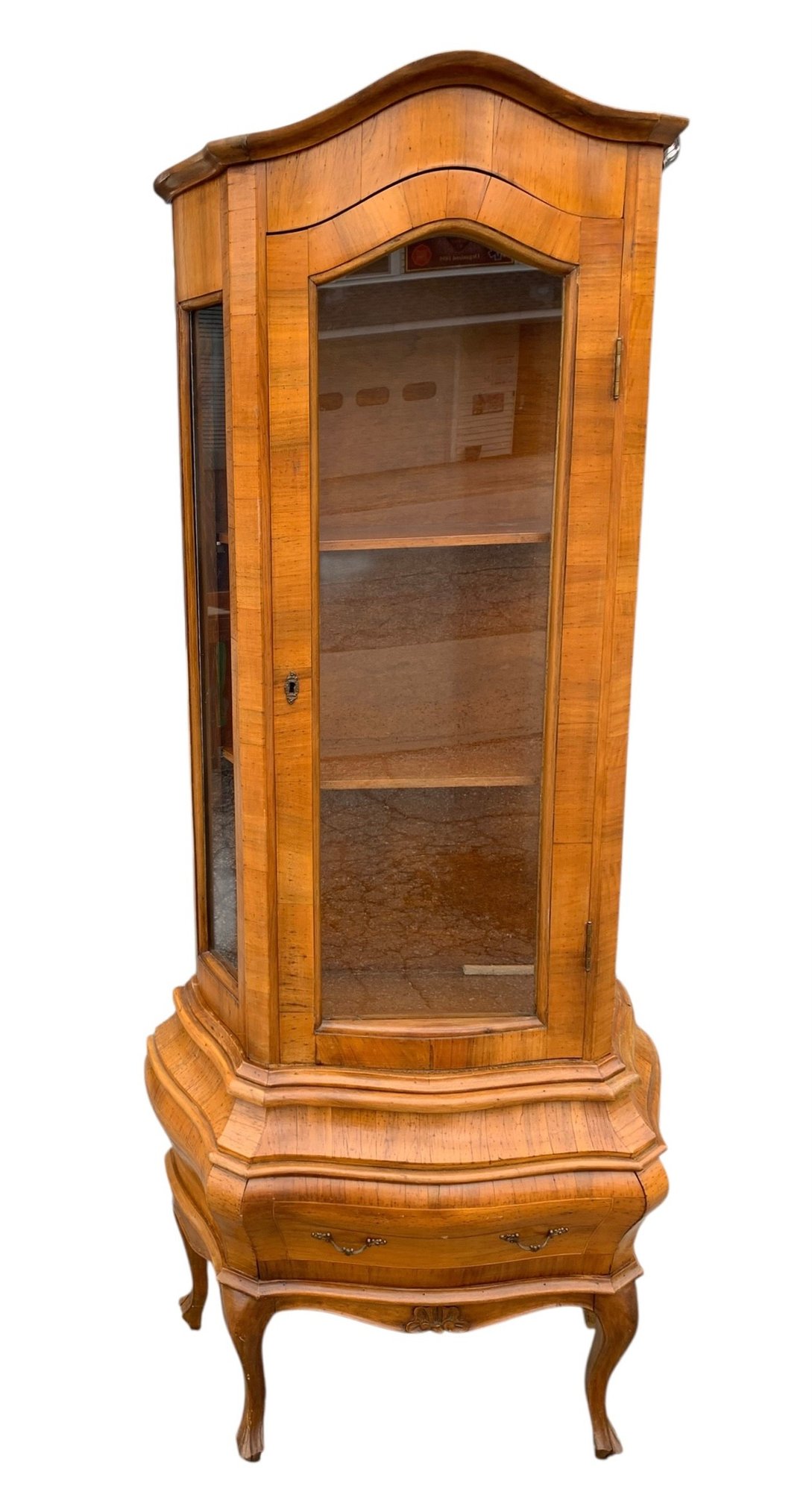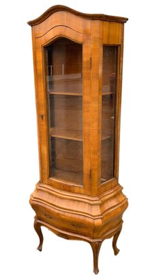 Glass display cabinet with three interior shelves and a single drawer at the base.
