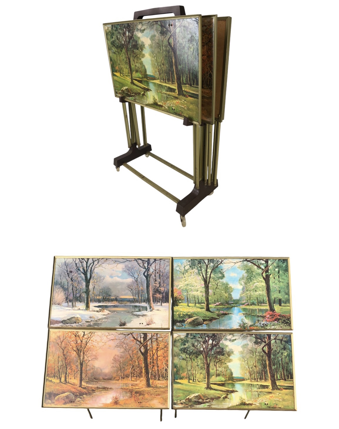 Includes (1) wheeled stand and (4) folding TV trays.