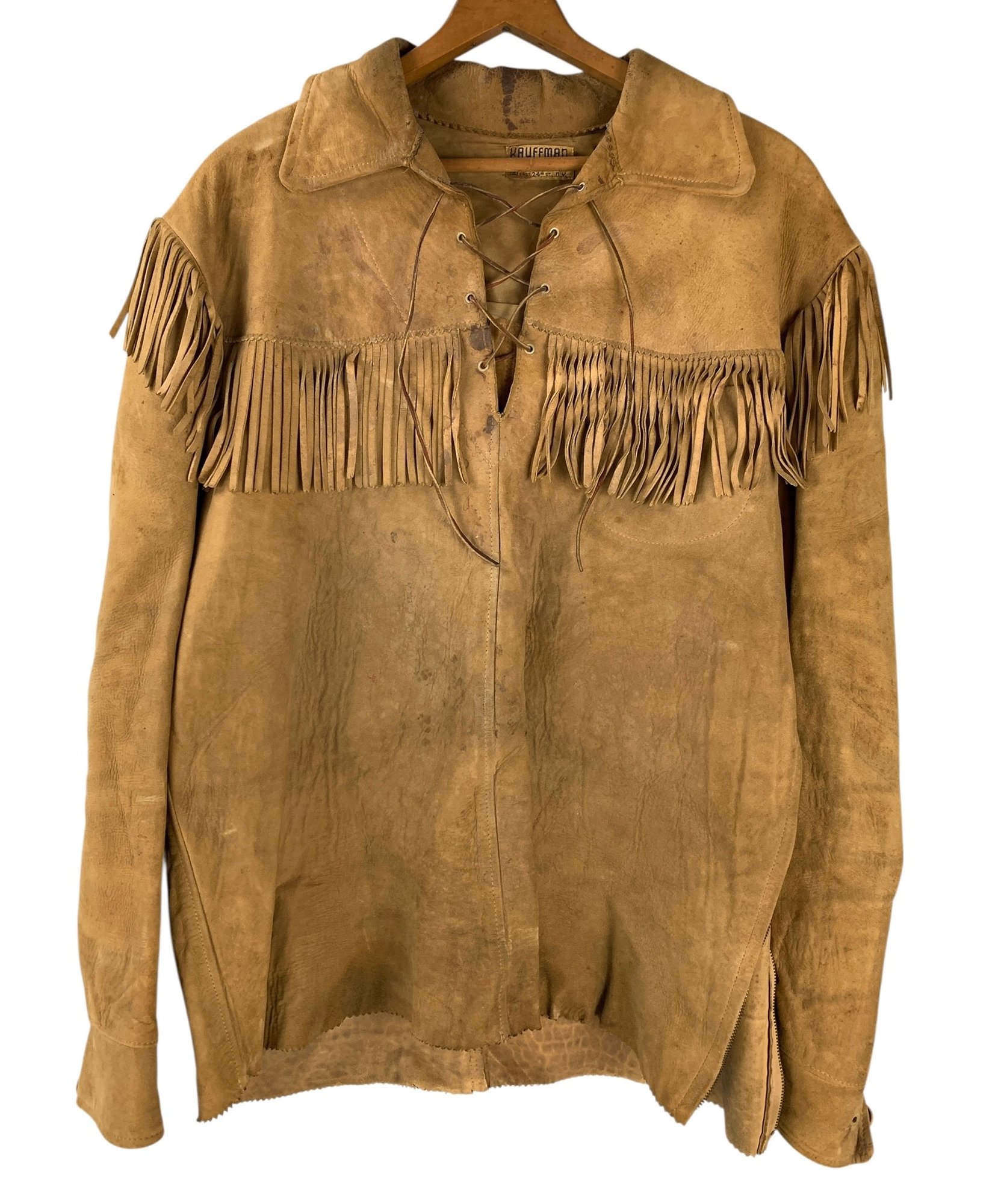 Features a zipper along one side, fringe along the front, sleeve and back, and a lace-up neckline.
