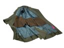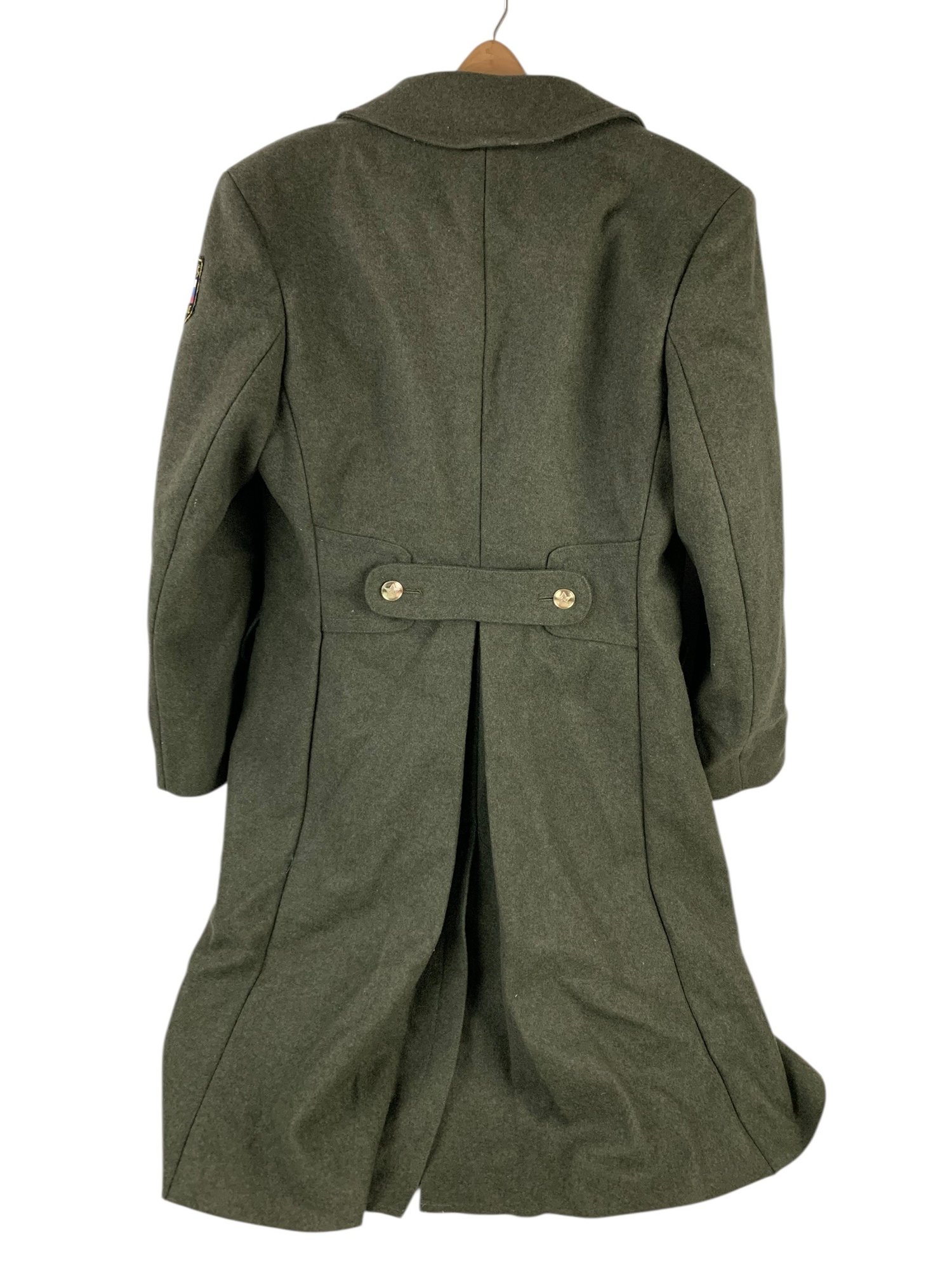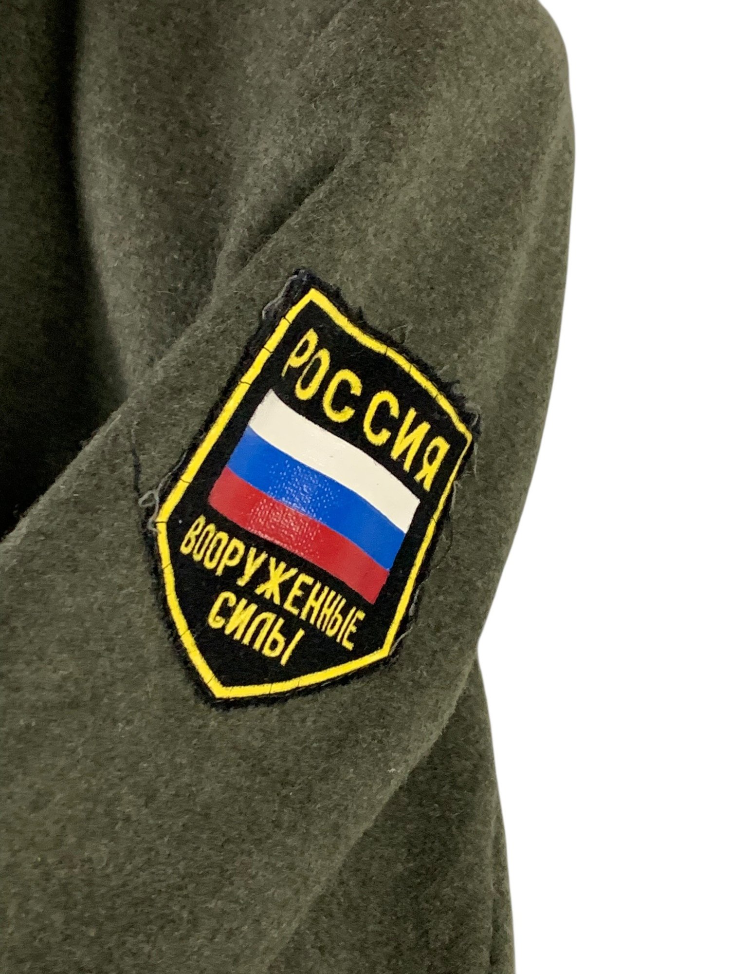Russian flag patch sewn on one shoulder.