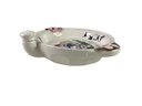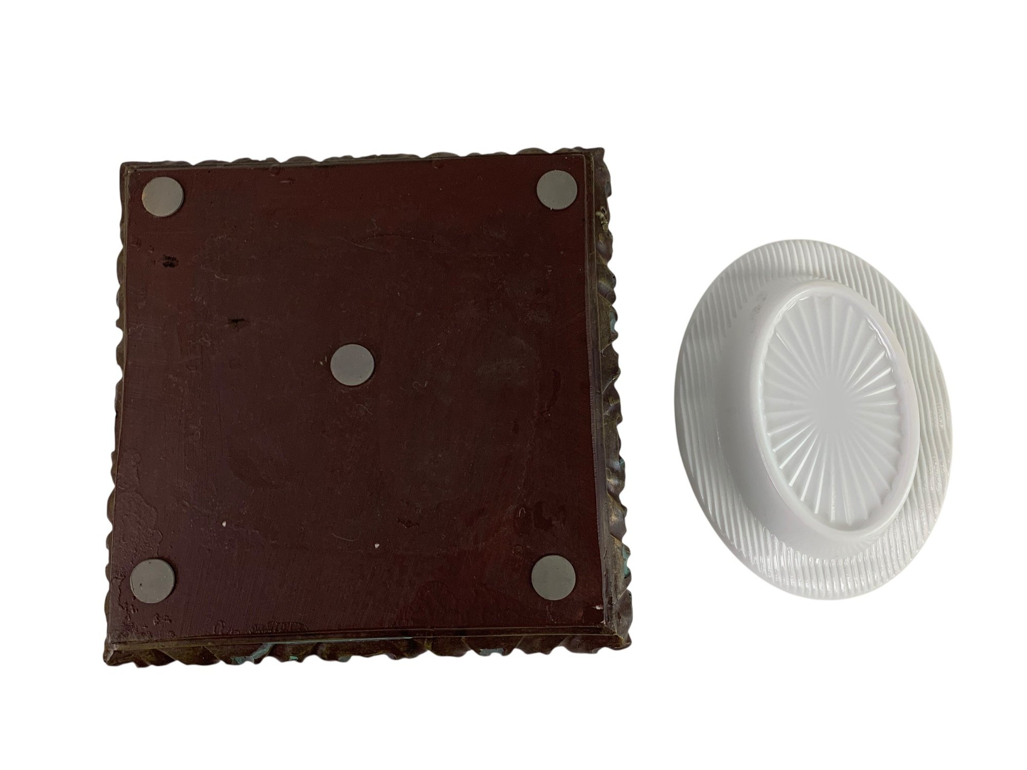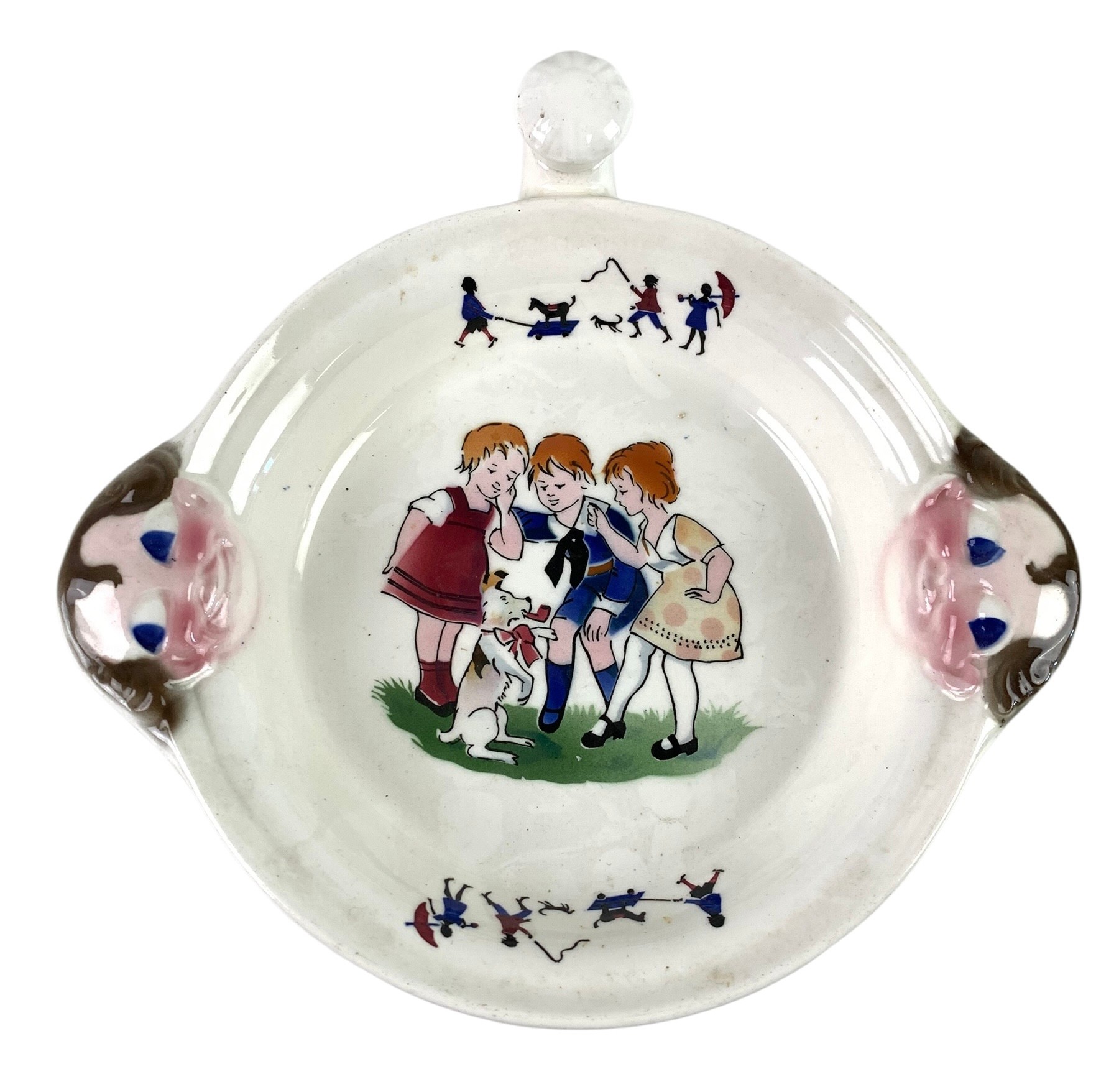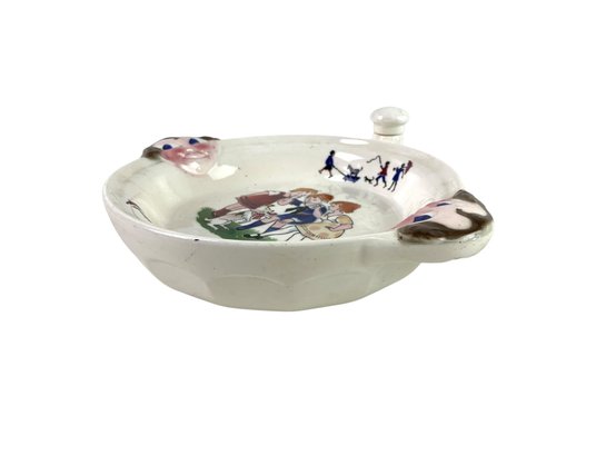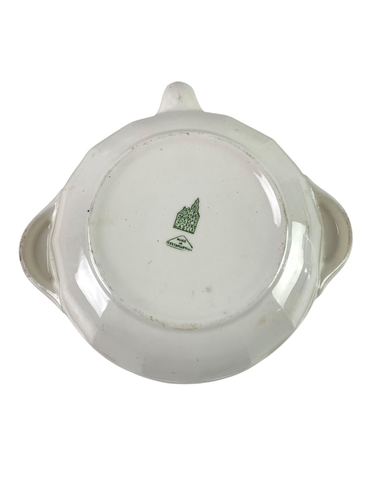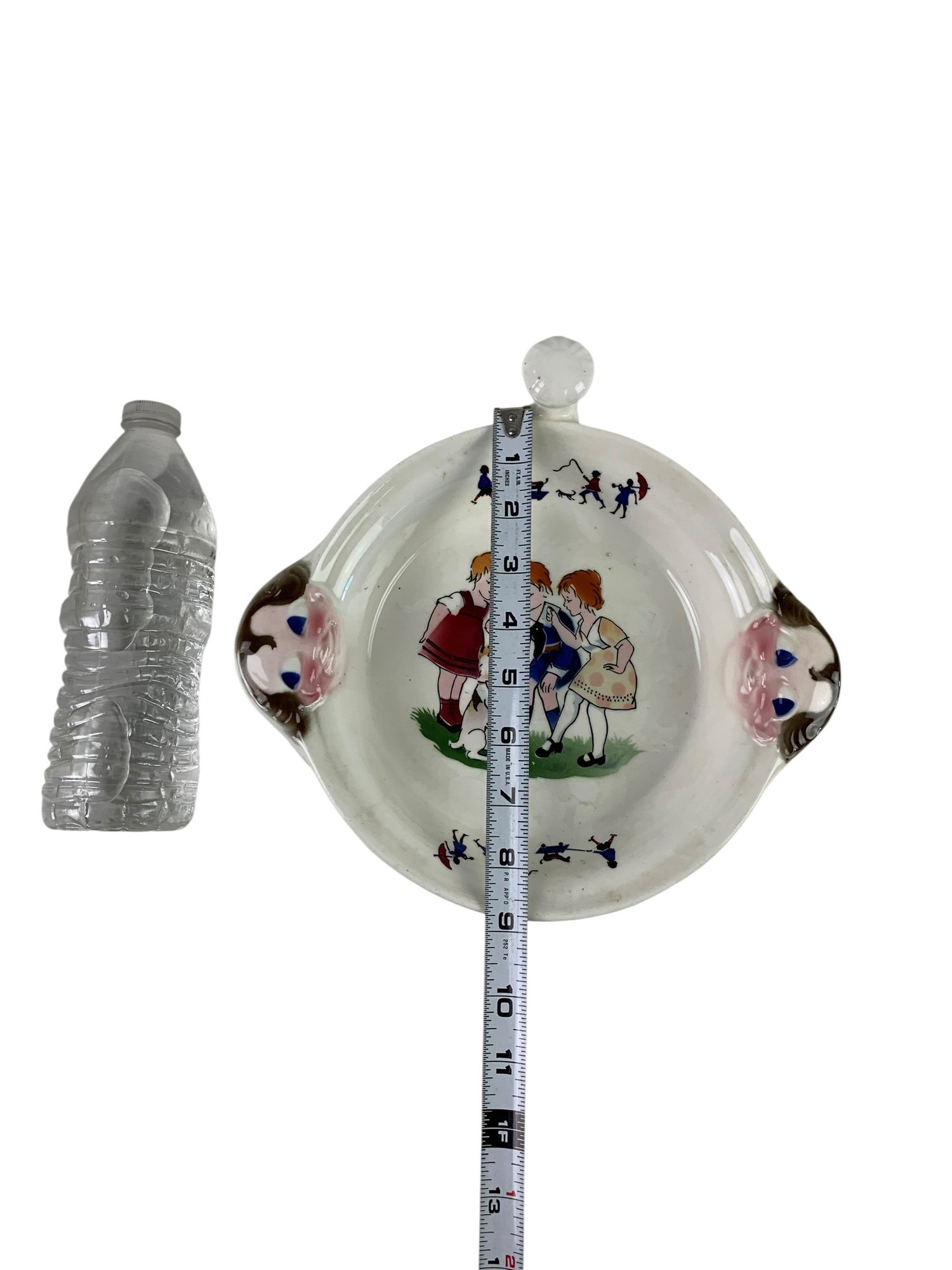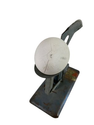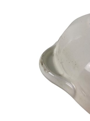 The warming dish has a chip on the underside of one handle, and the egg is cracked.