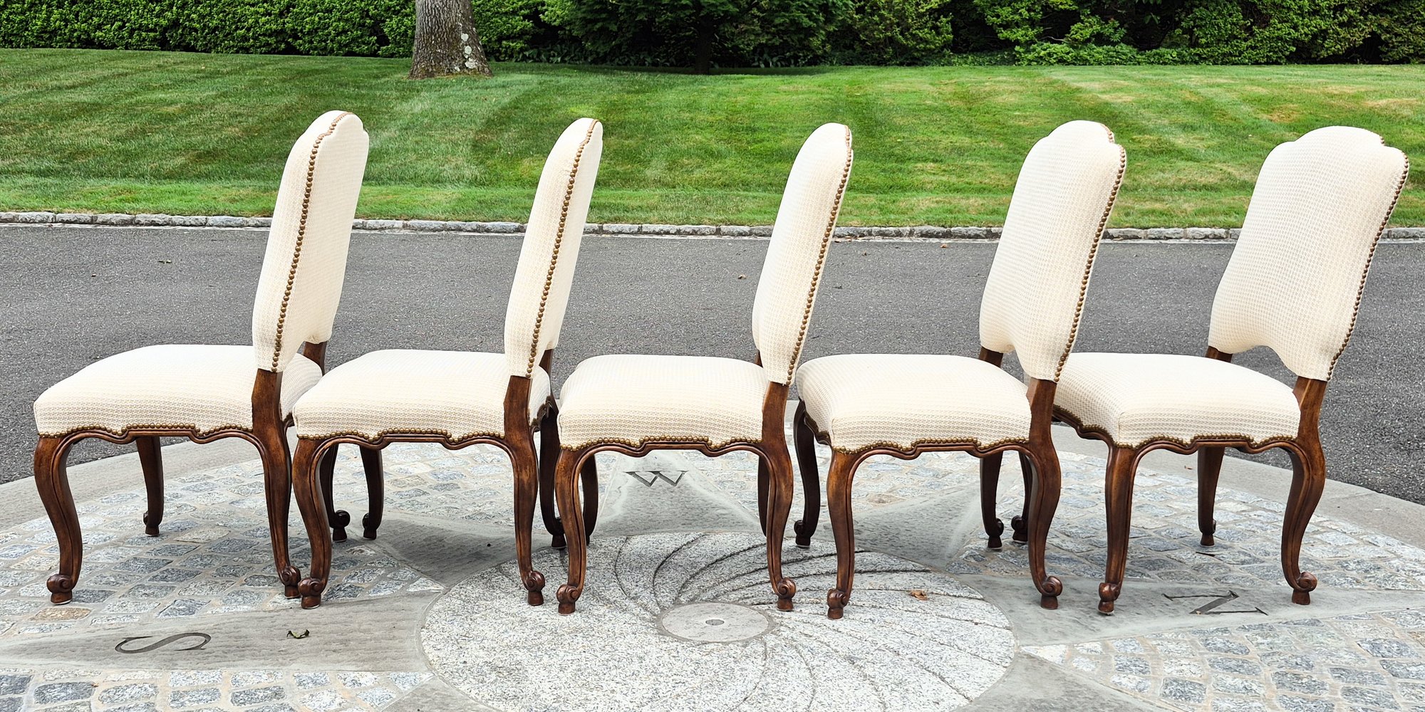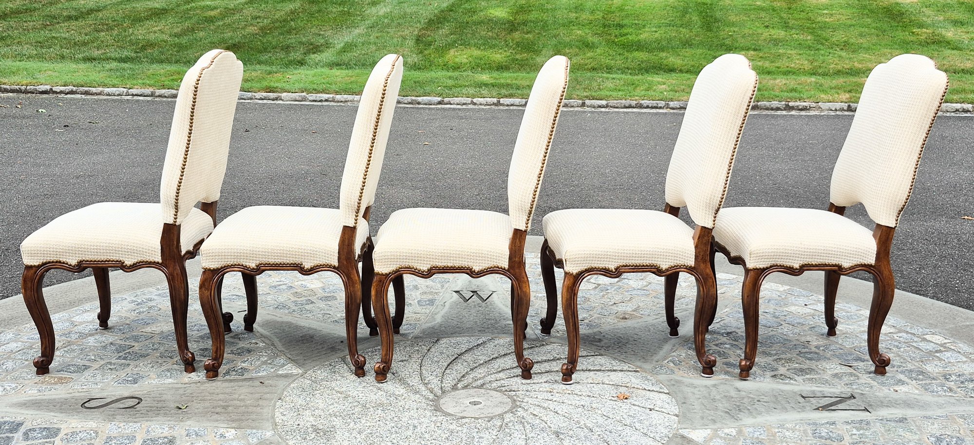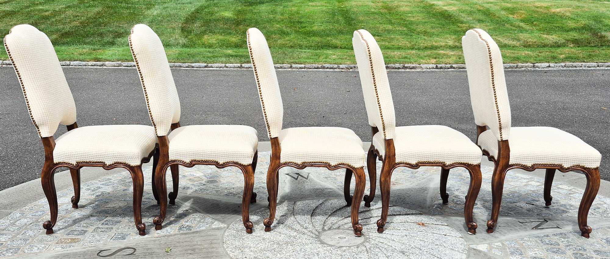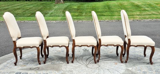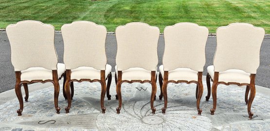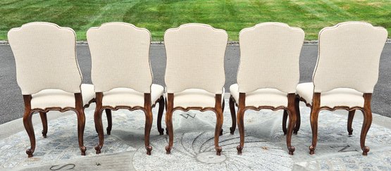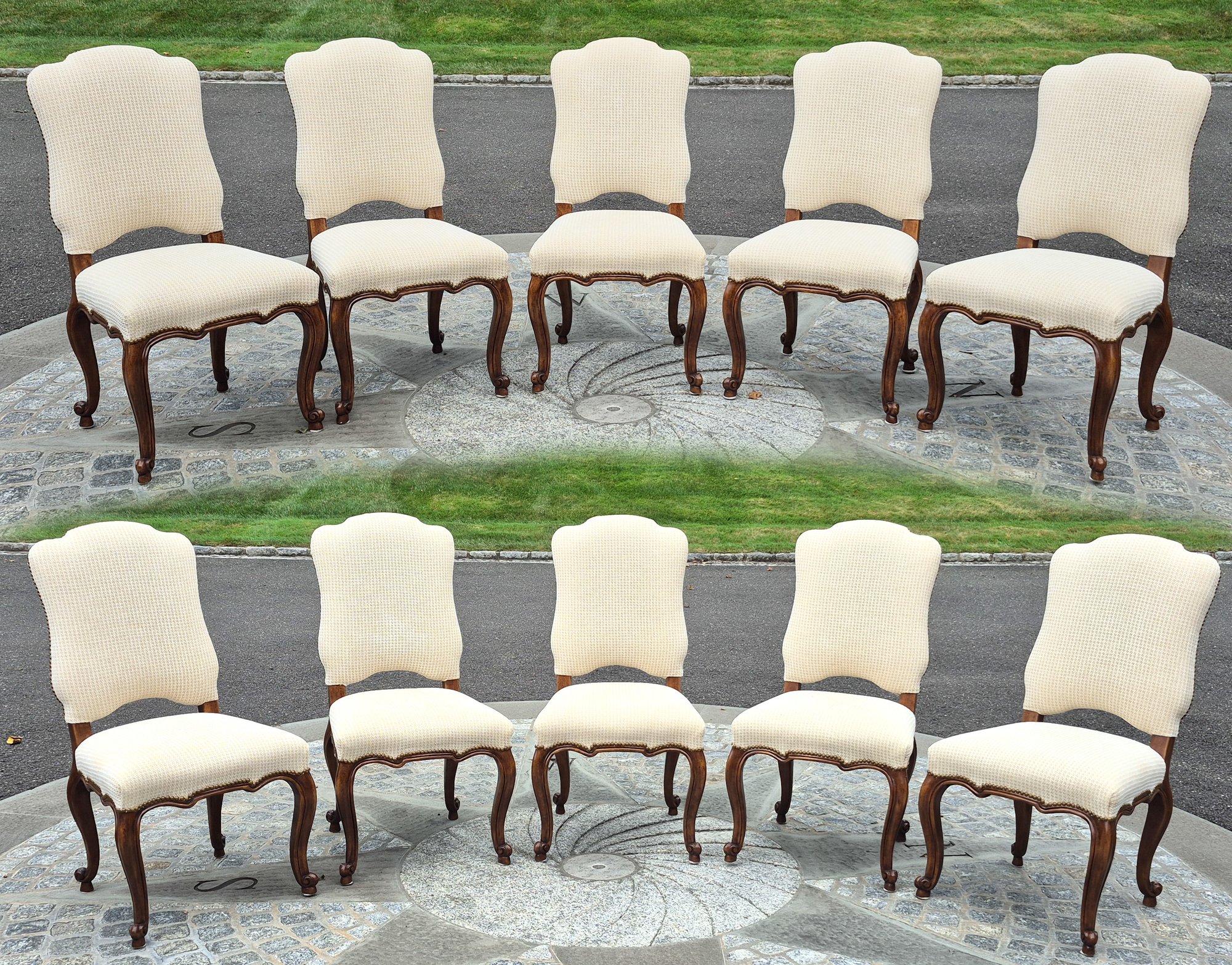 A set of ten quality 20th C. Louis XV style dining chairs by Minton-Spidell, with ivory upholstery and brass tack detail.