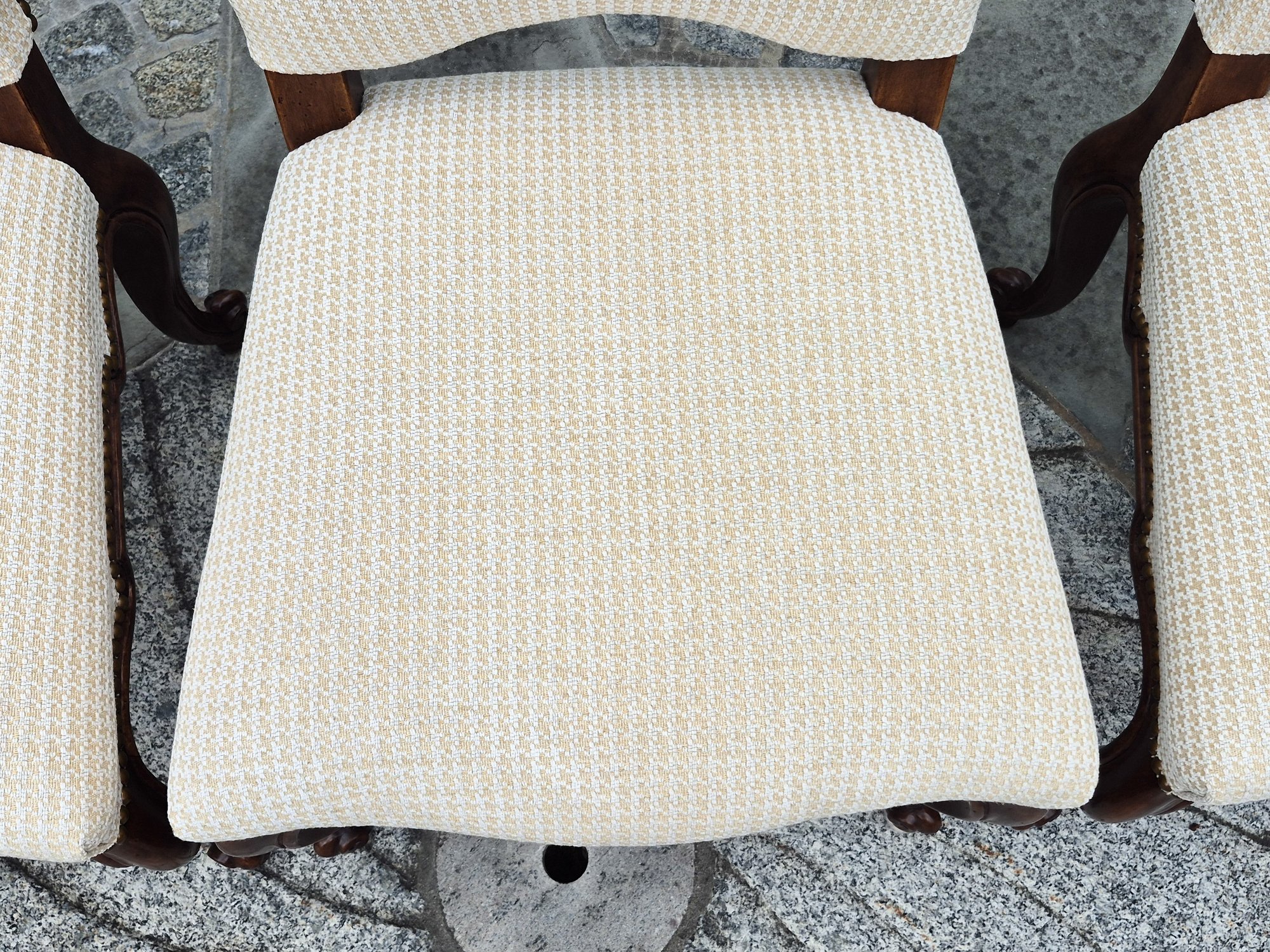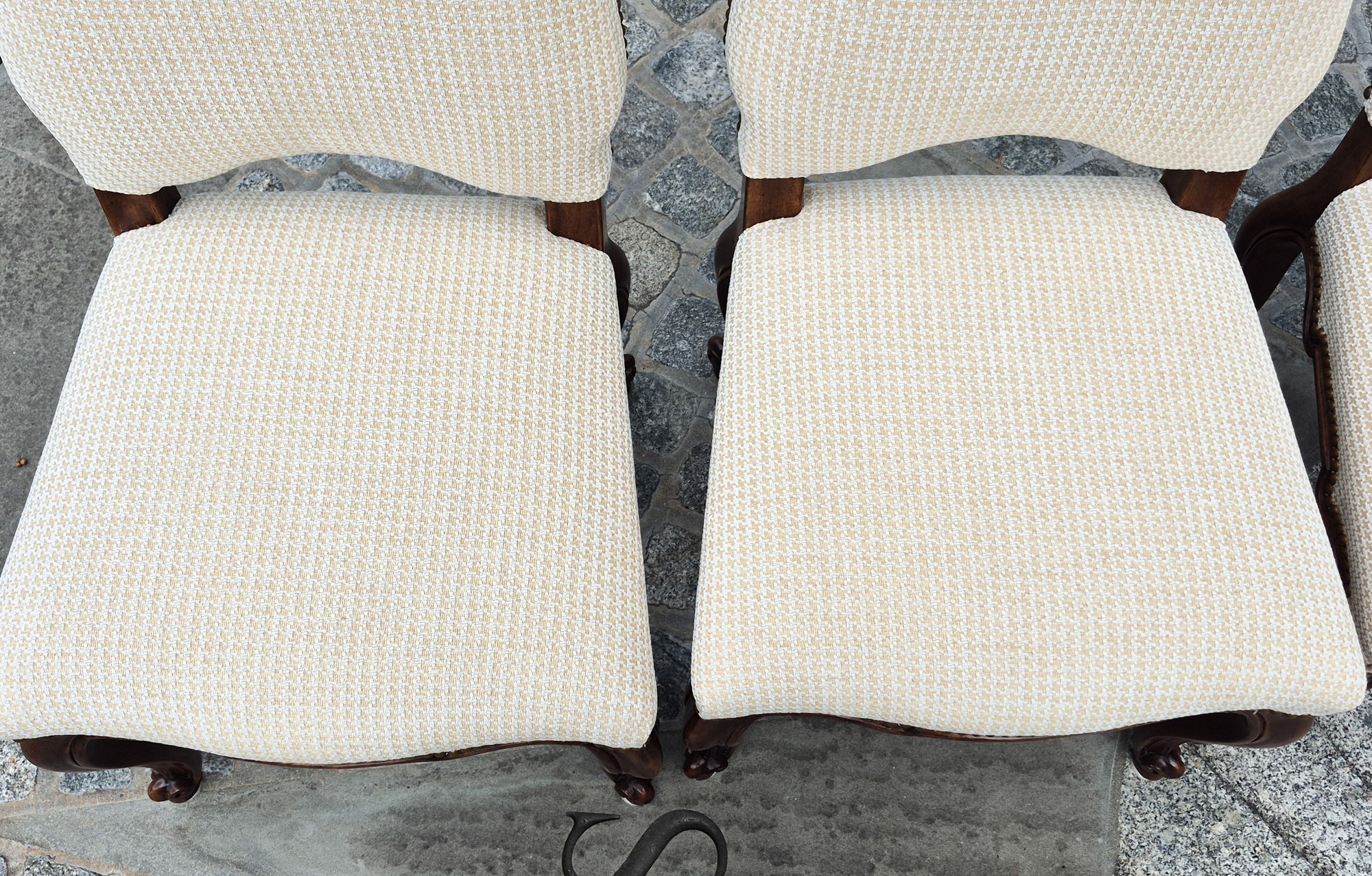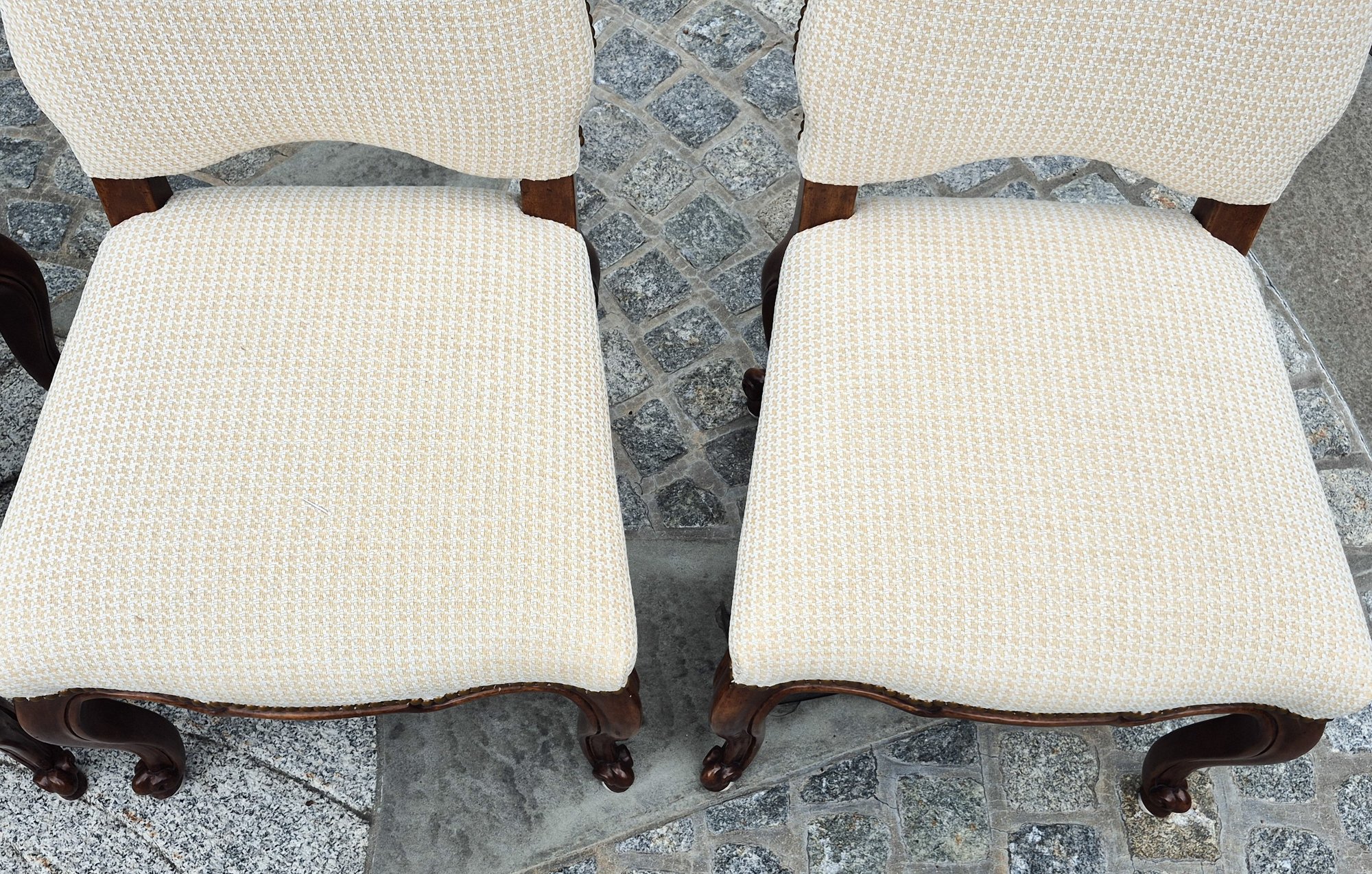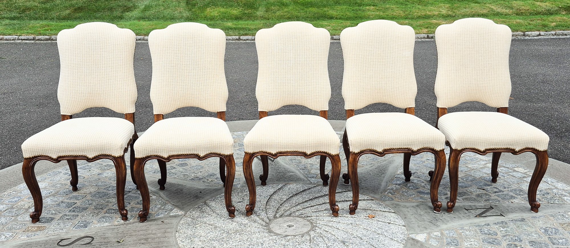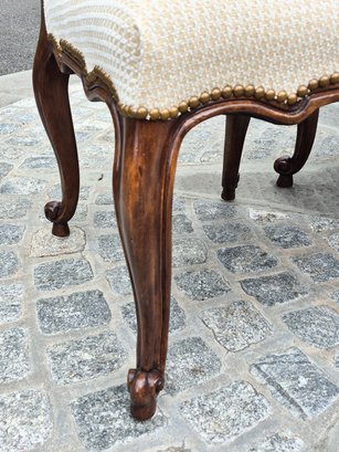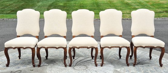 A set of ten quality 20th C. Louis XV style dining chairs by Minton-Spidell, with ivory upholstery and brass tack detail.