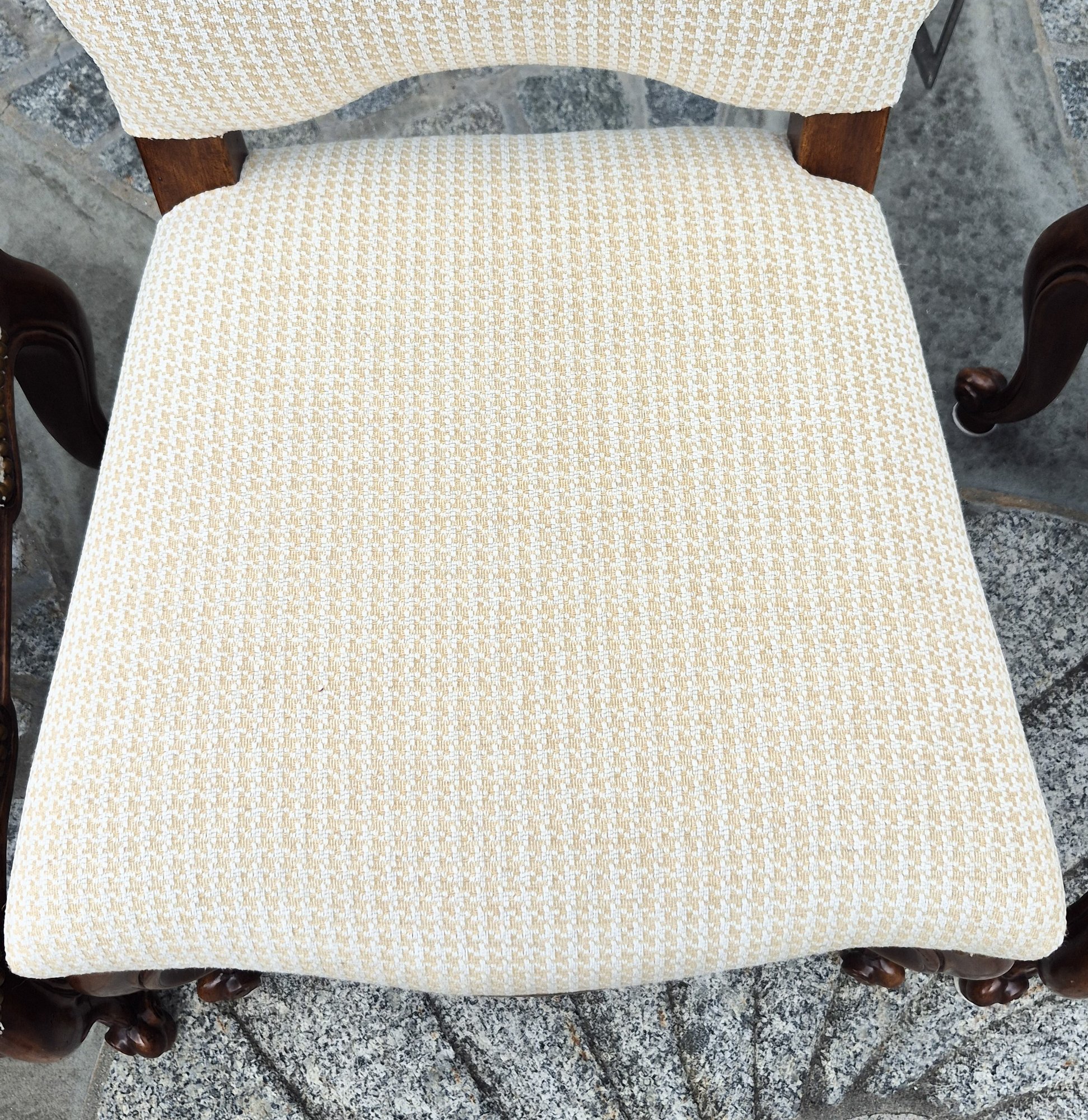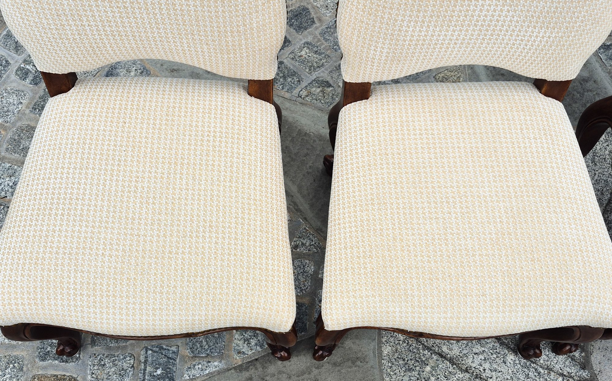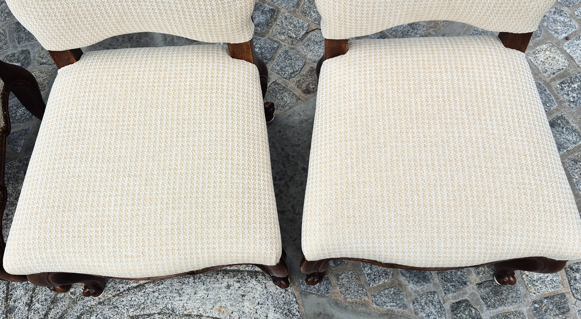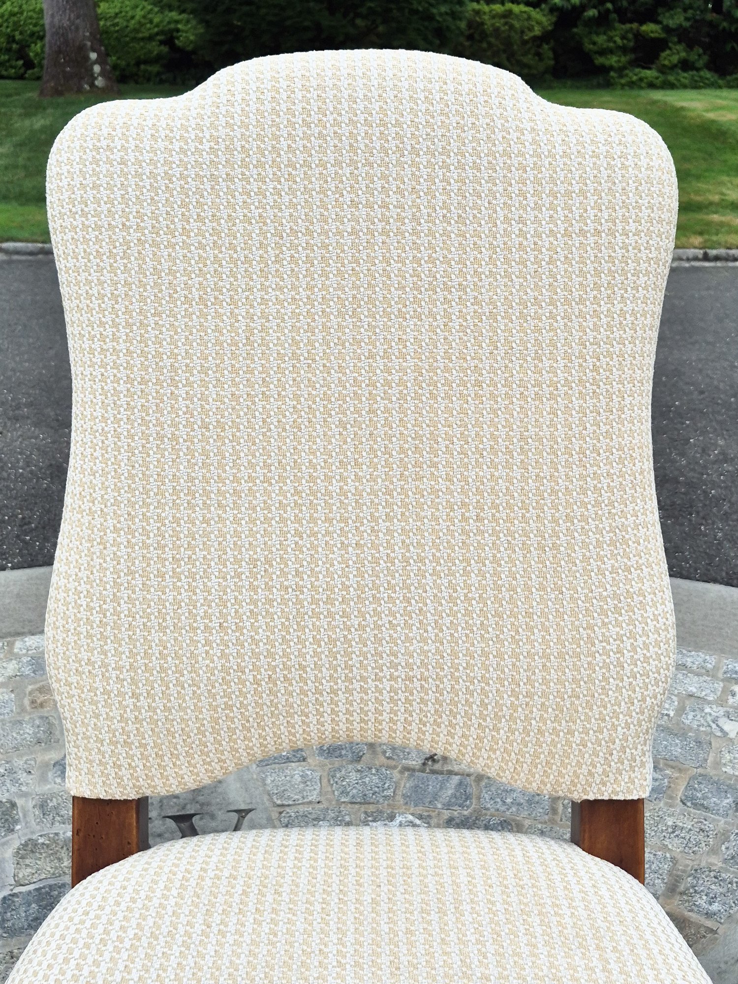 A set of ten quality 20th C. Louis XV style dining chairs by Minton-Spidell, with ivory upholstery and brass tack detail.