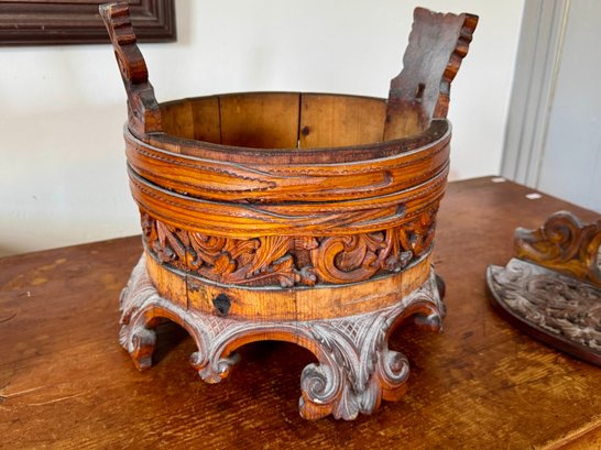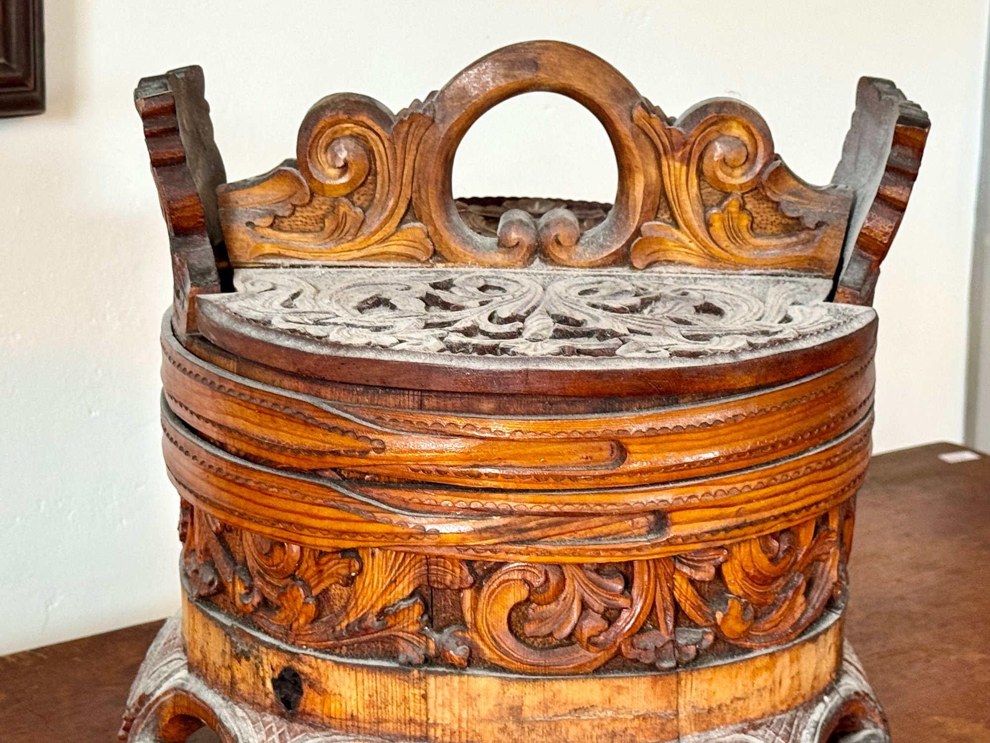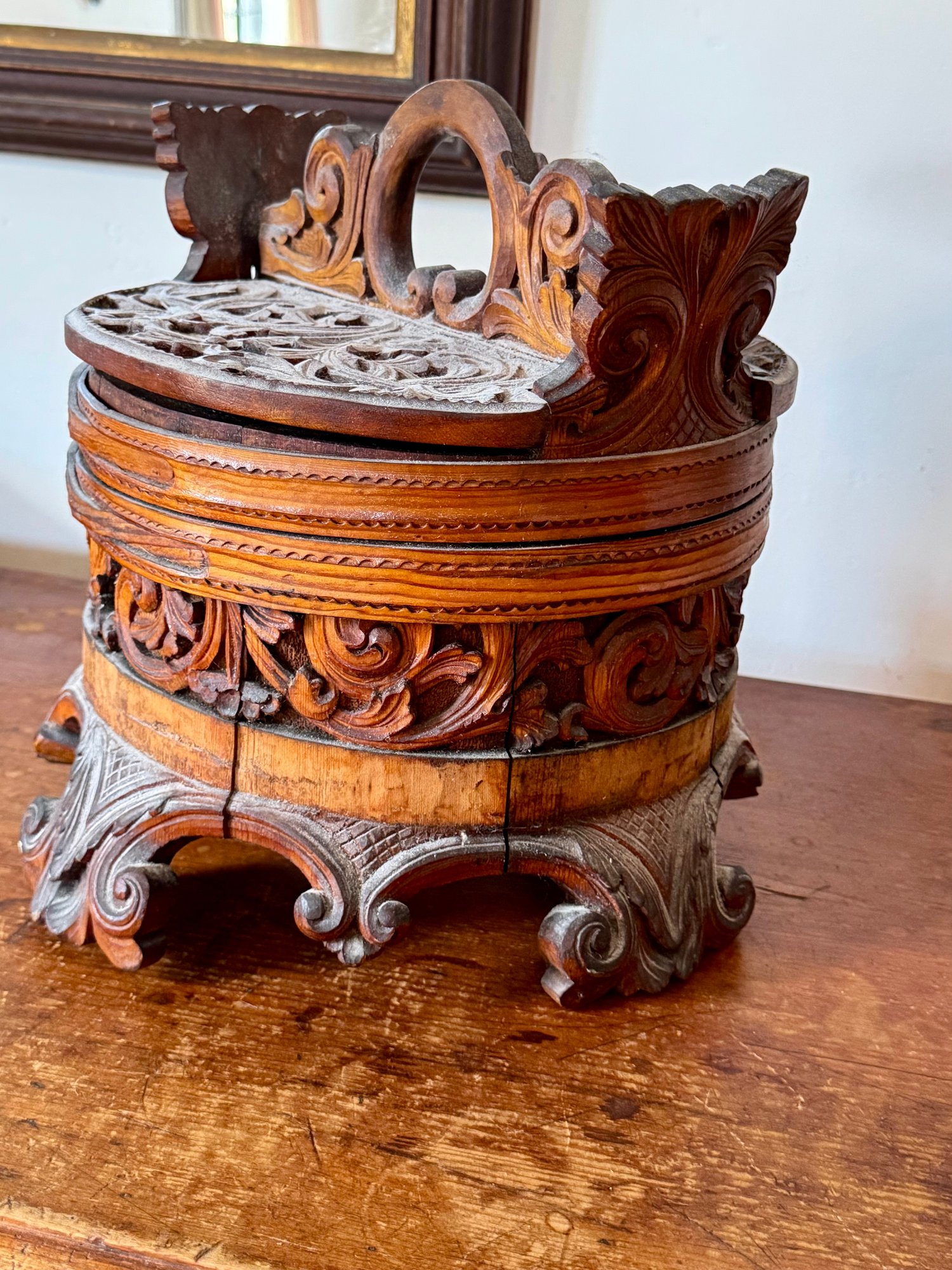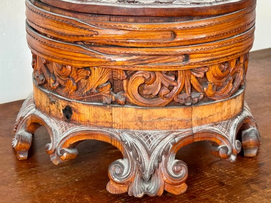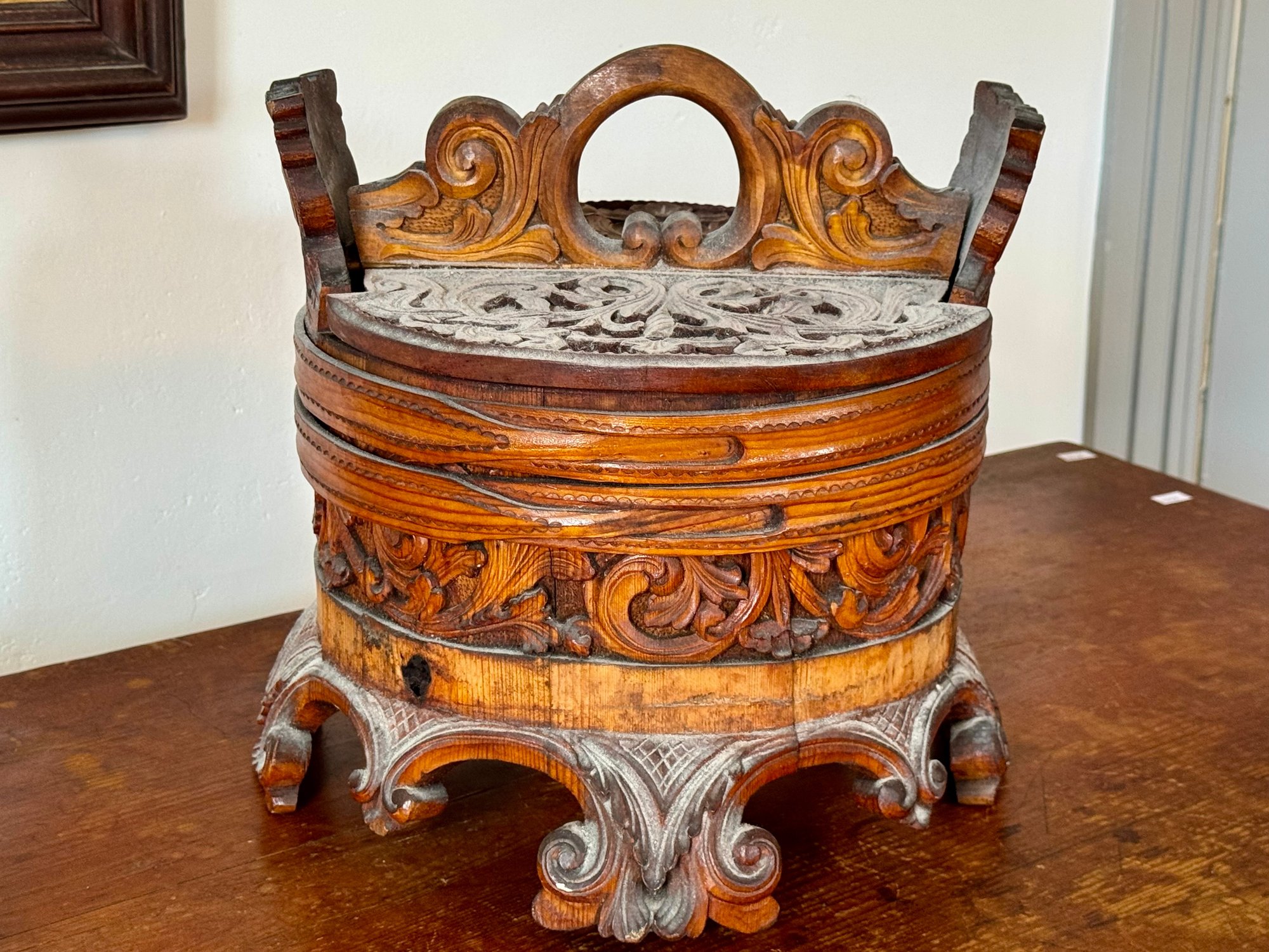A 19th C Scandinavian, possibly Norwegian, carved wooden porringer with acanthus leaf and floral carvings. Could also be a butter box.