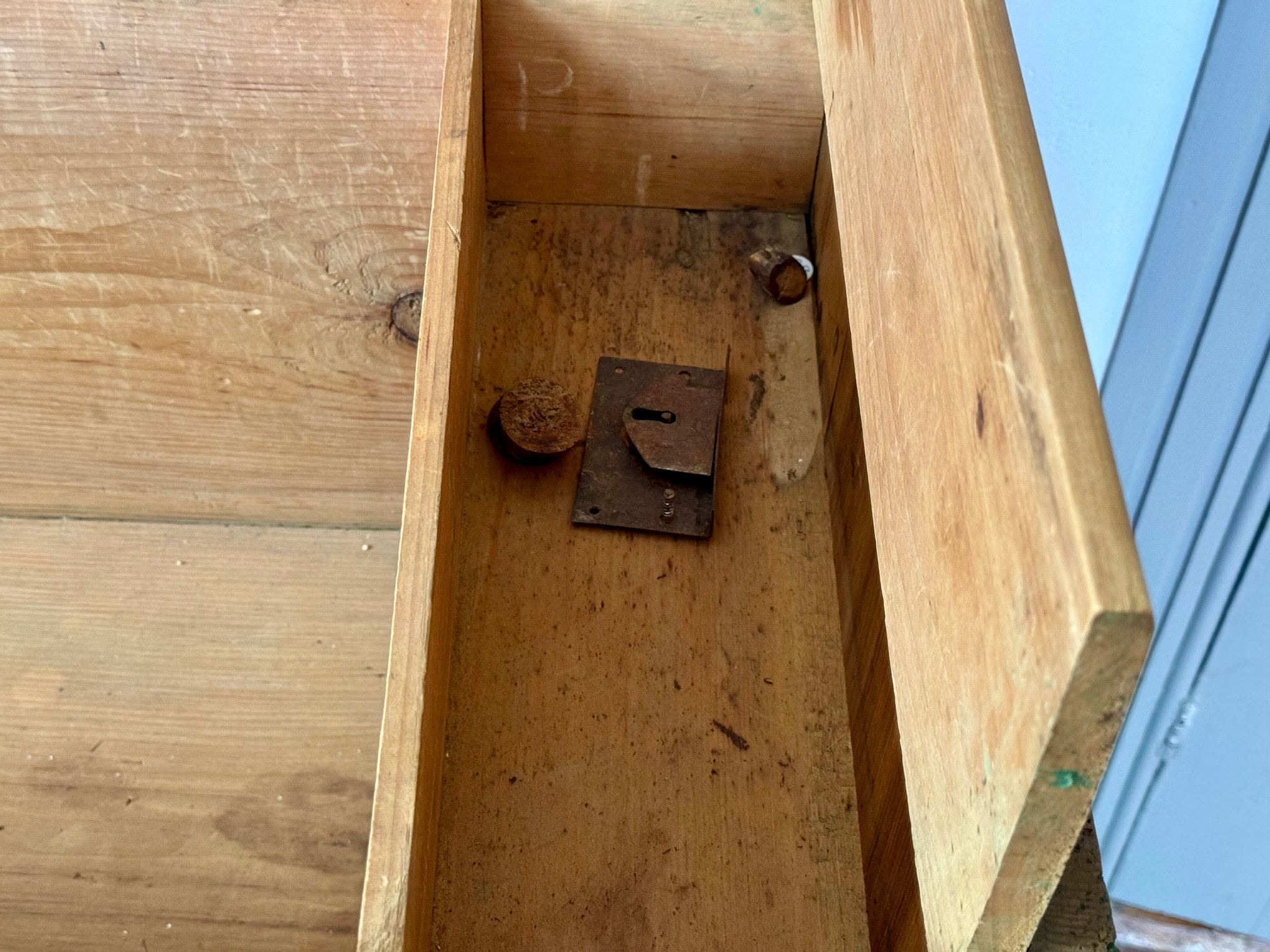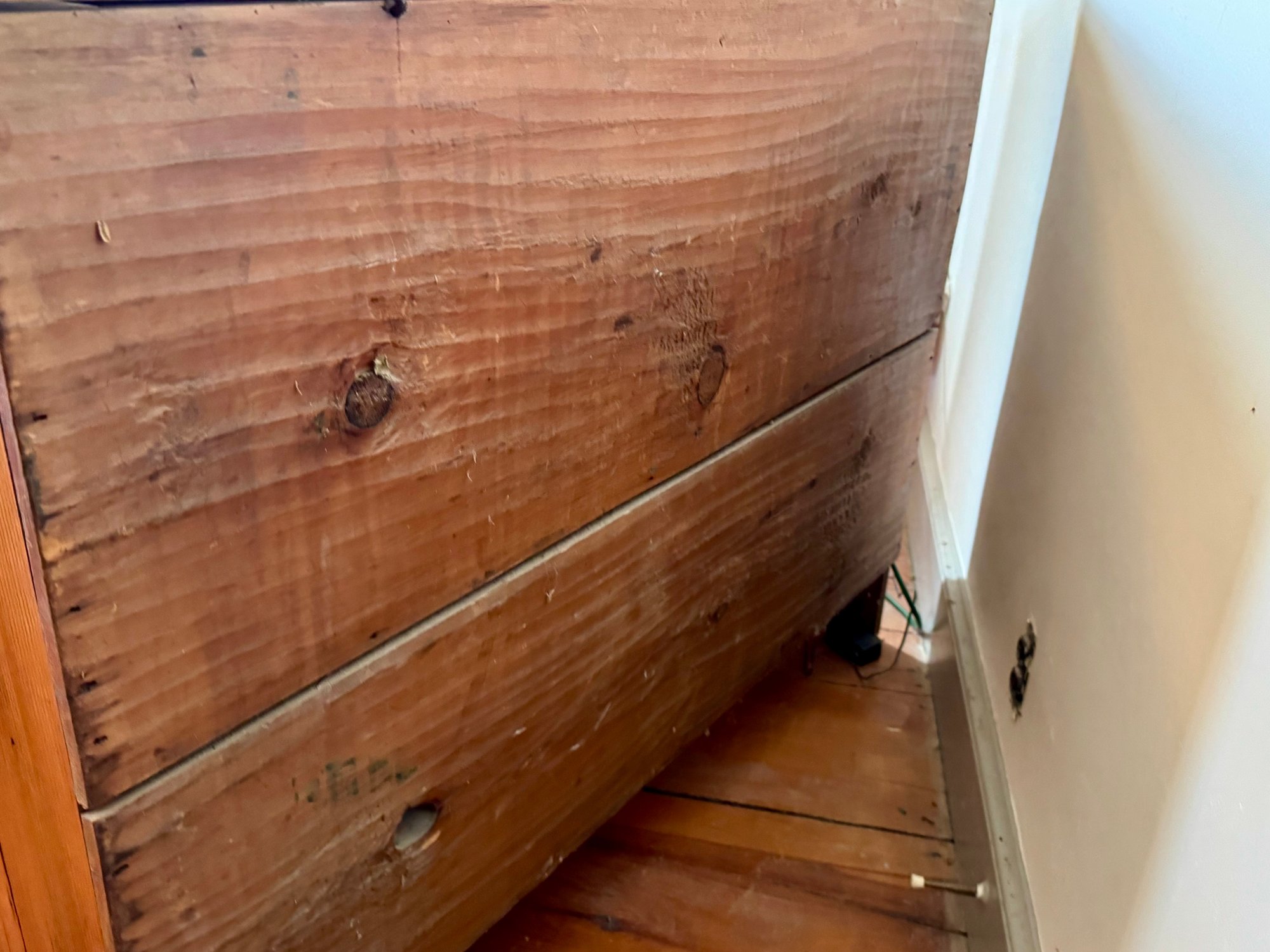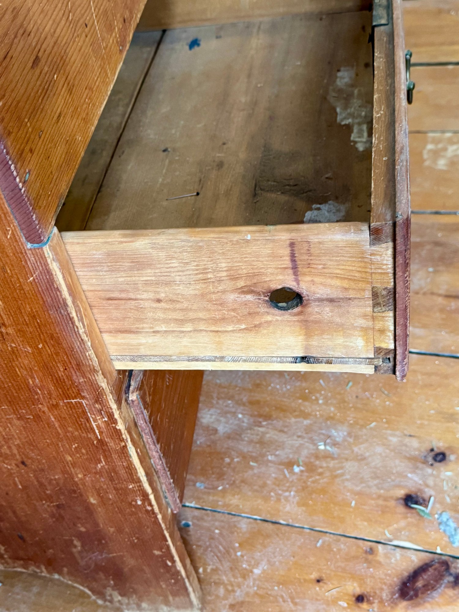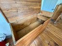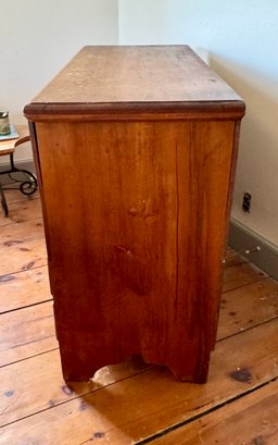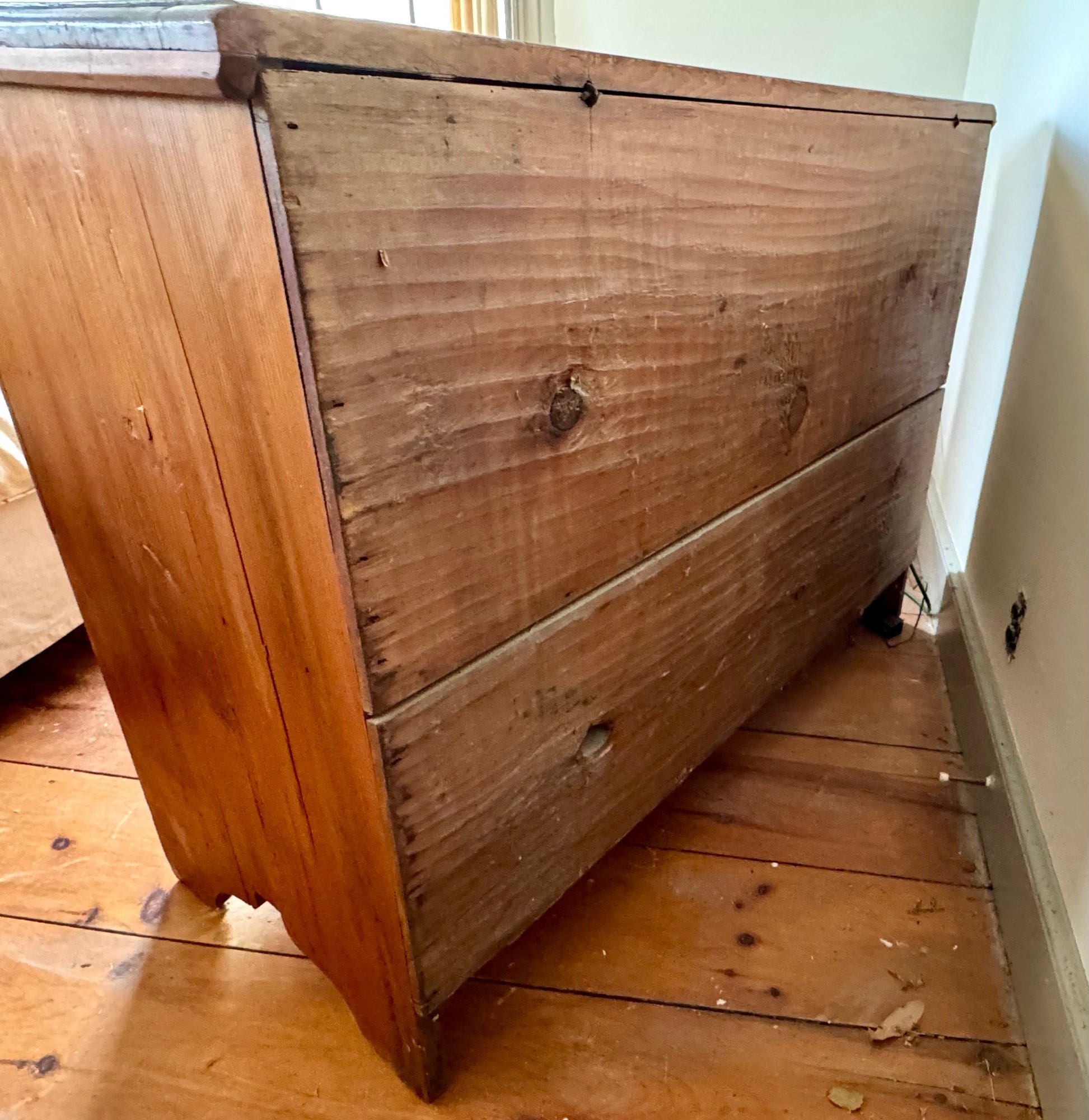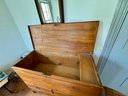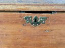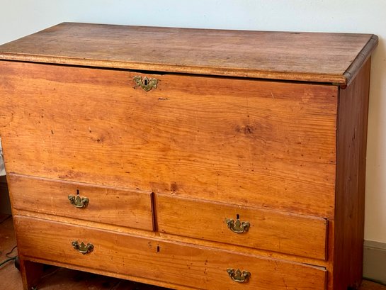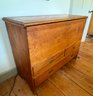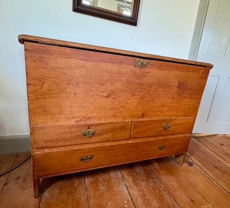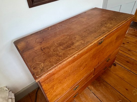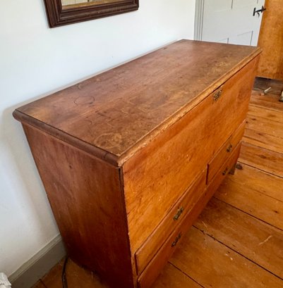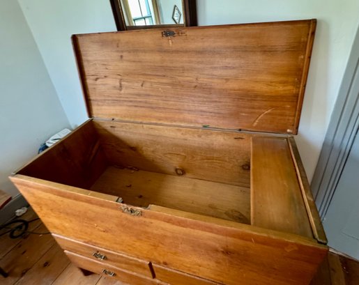 An antique lift top blanket chest with two drawers over one drawer, brass hardware.