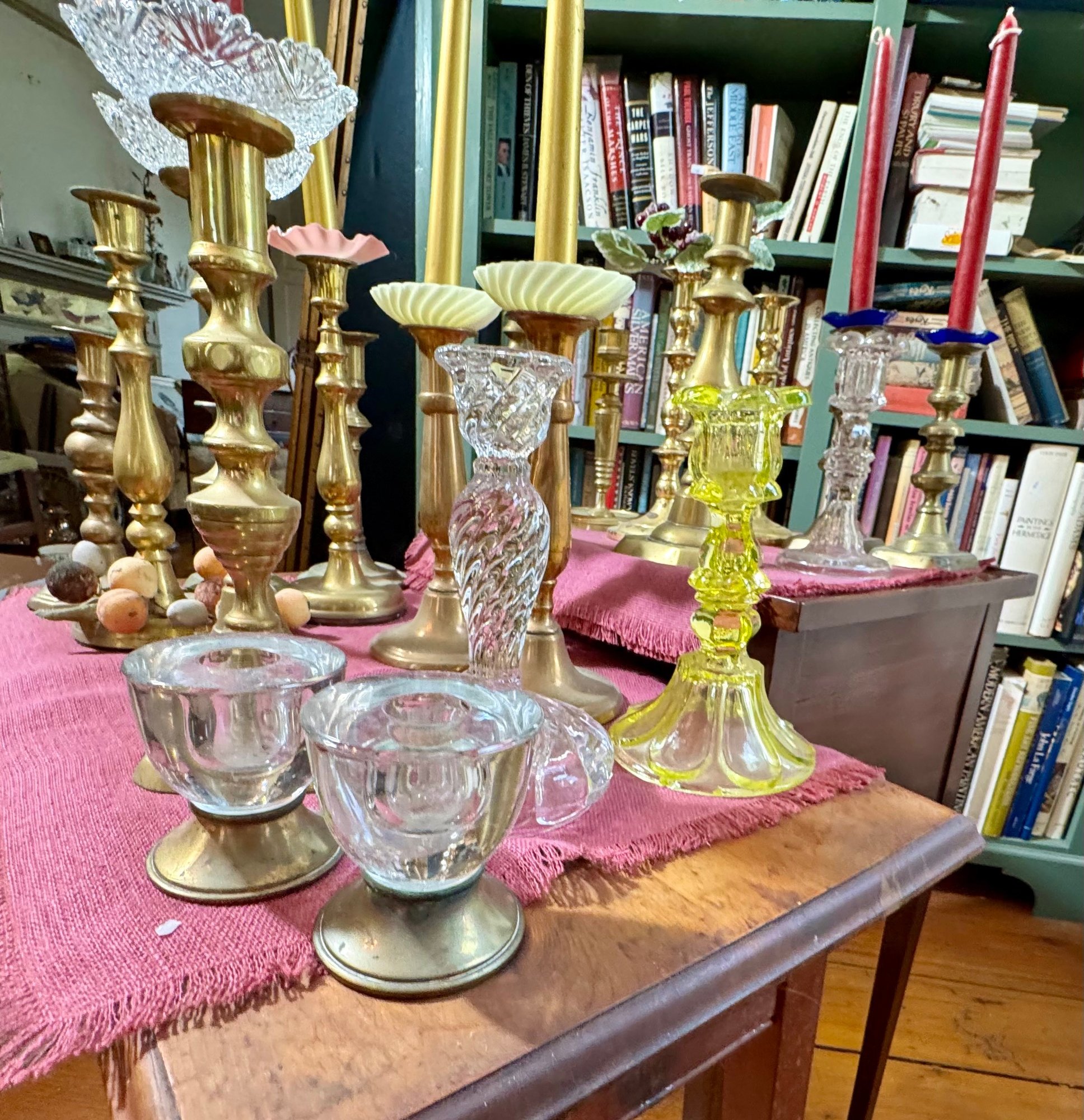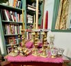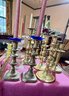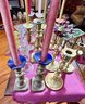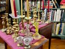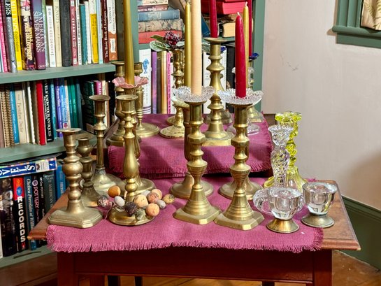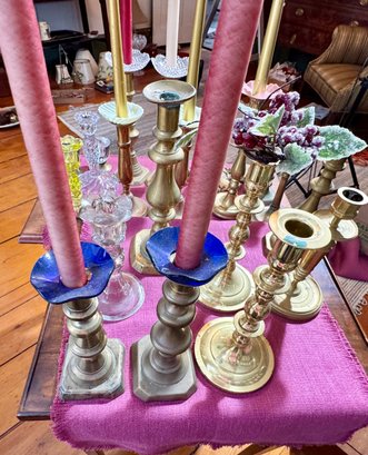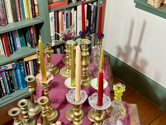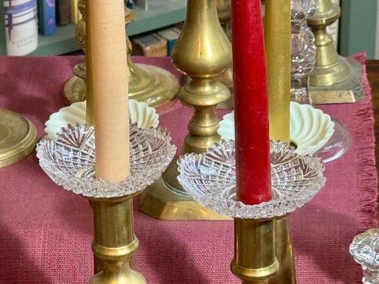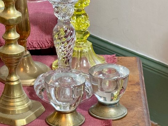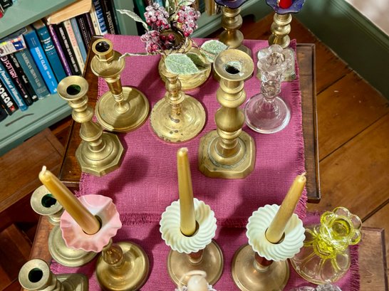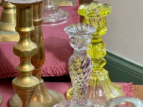 Antique and vintage candlesticks, including: three glass, a pair of short glass with brass bases, three pair of brass candlesticks, other miscellaneous candlesticks, includes the bobeches.