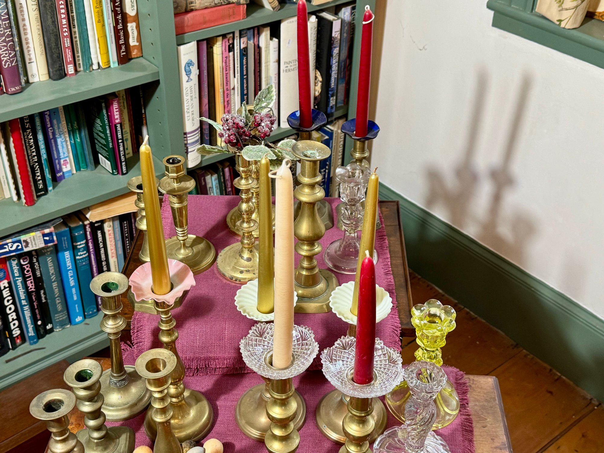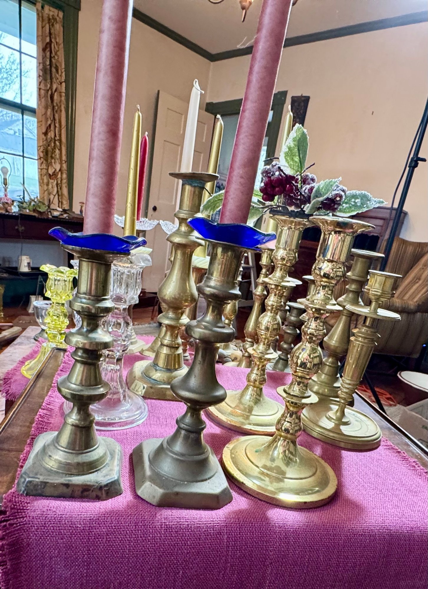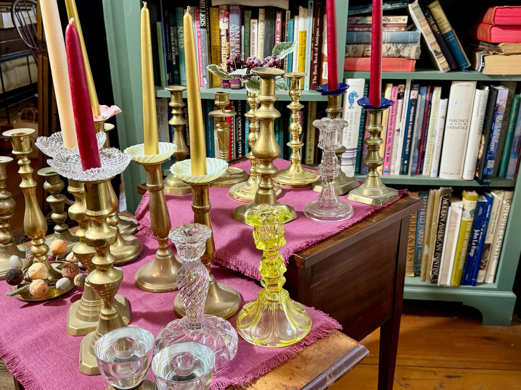 Antique and vintage candlesticks, including: three glass, a pair of short glass with brass bases, three pair of brass candlesticks, other miscellaneous candlesticks, includes the bobeches.