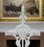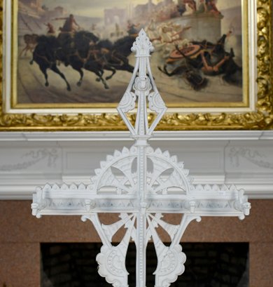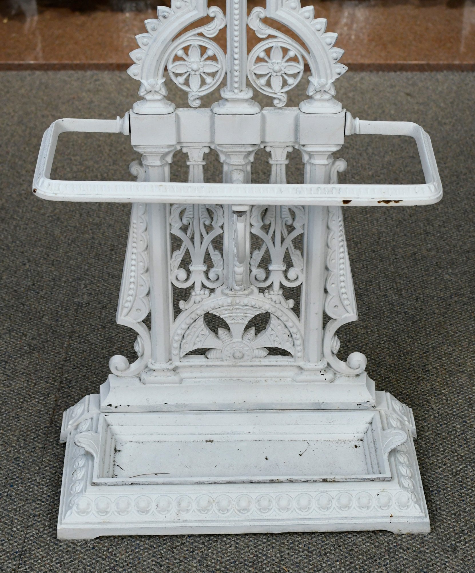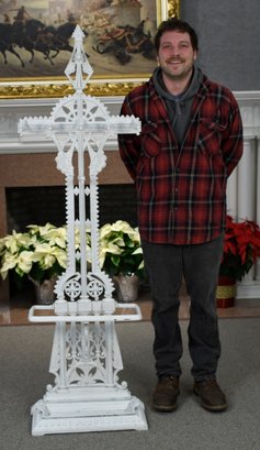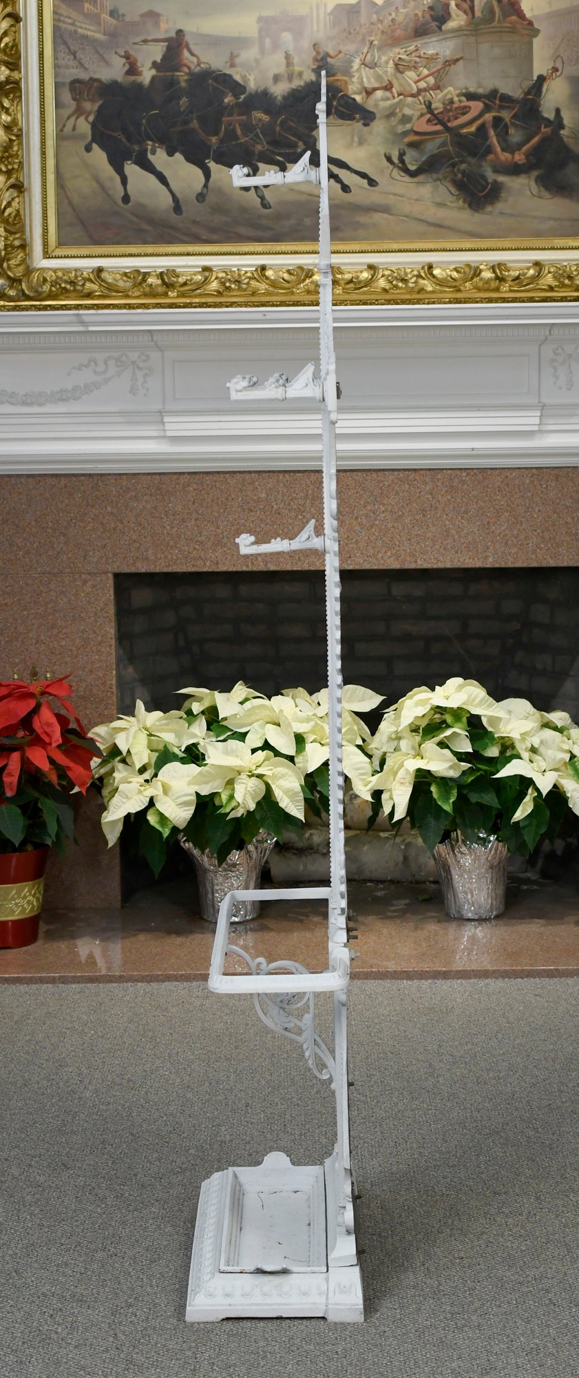 A white-painted antique cast iron Aesthetic period hall tree, manufactured by Coalbrookdale Co. foundry.