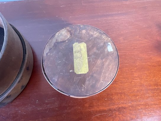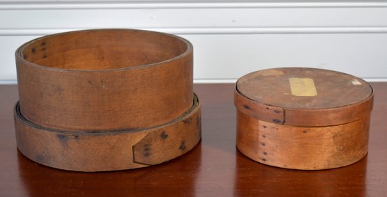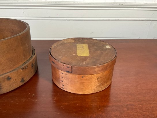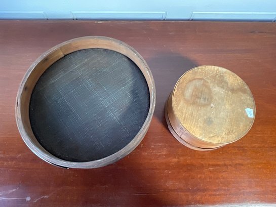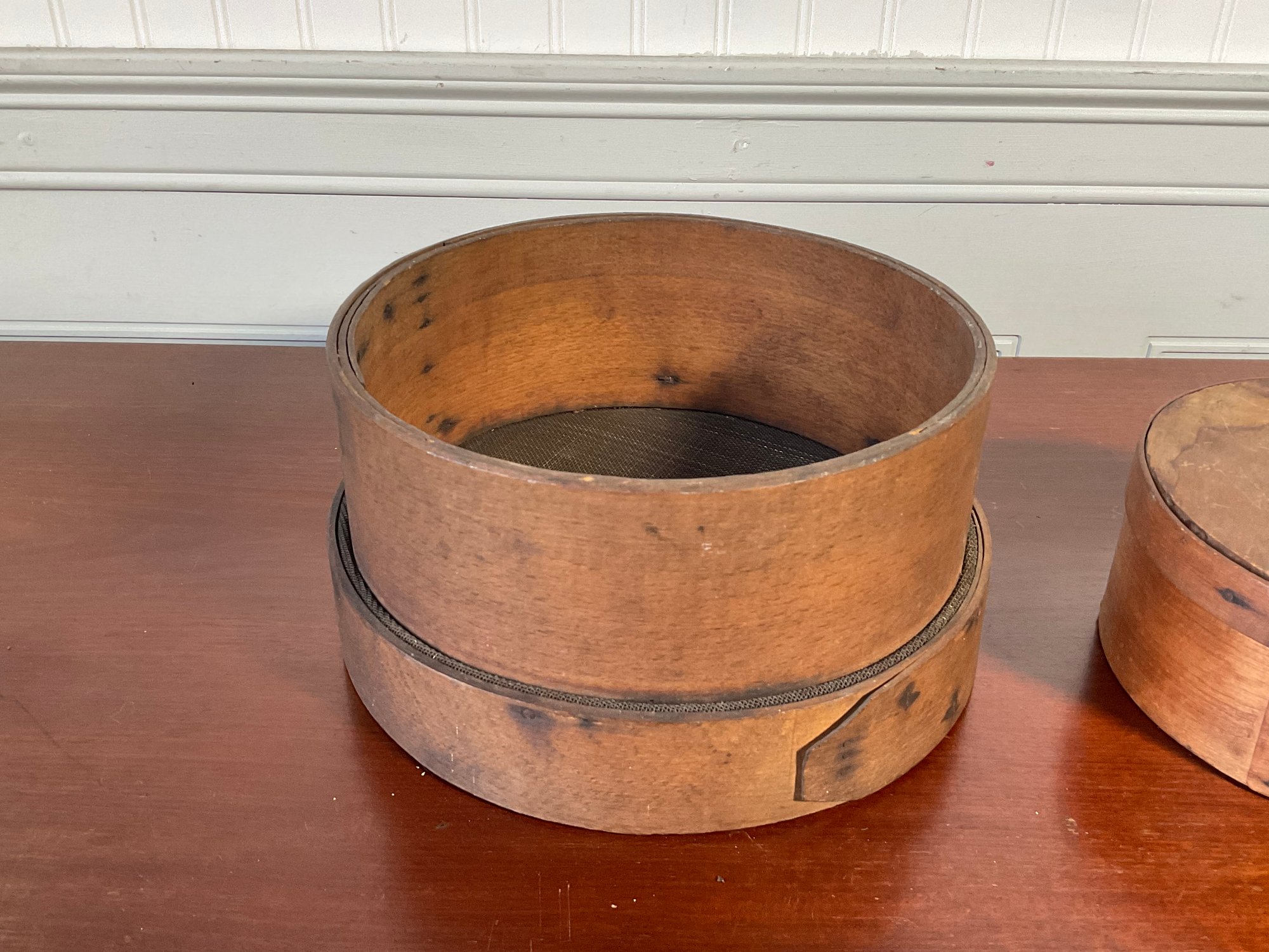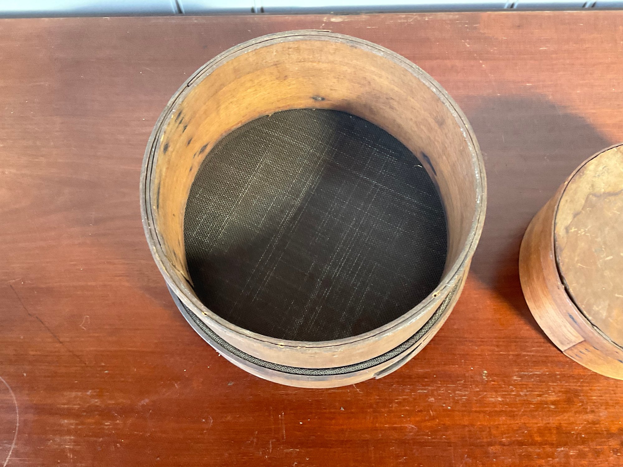 Two pieces of antique country woodenware, including: 8” dia. pantry box with applied label “Robert Conary Insurance Ipswich Mass”, with a country flour sifter 5.5” x 11.25” dia..