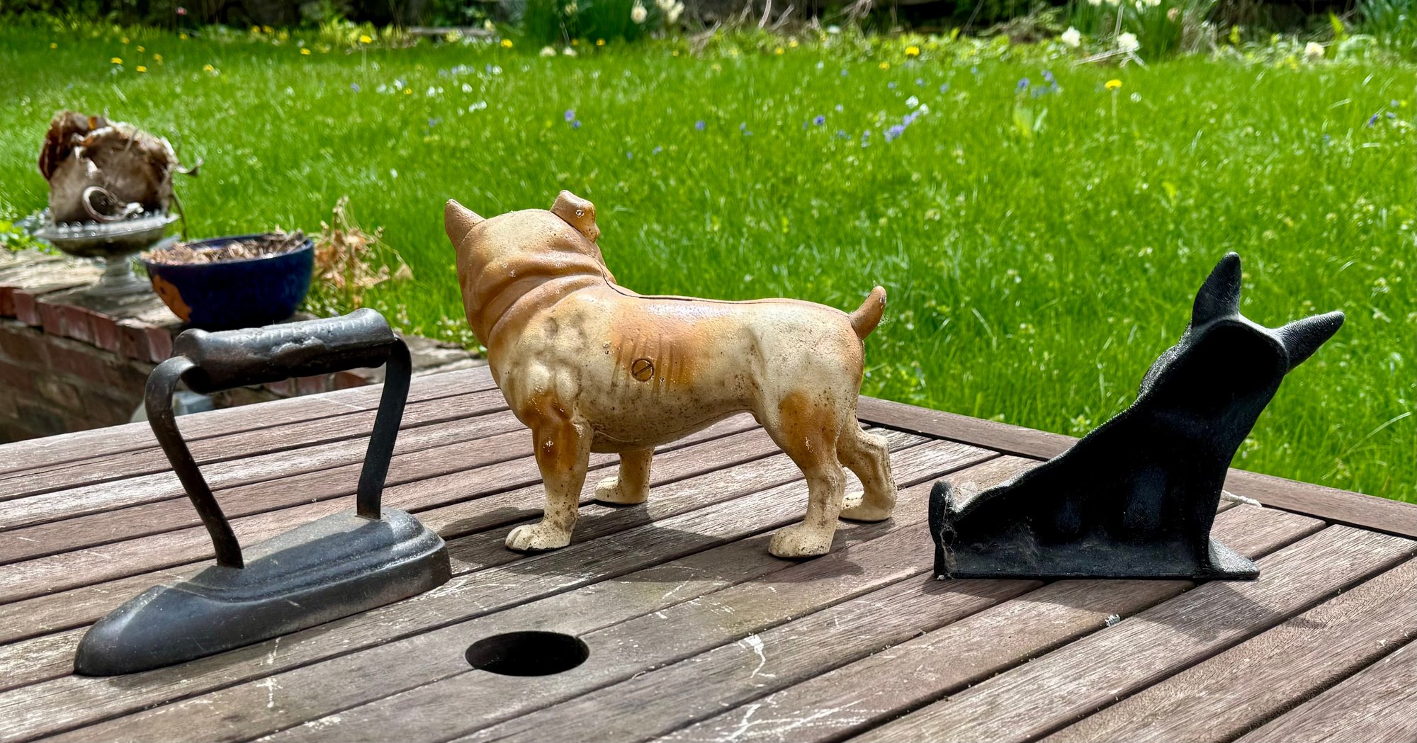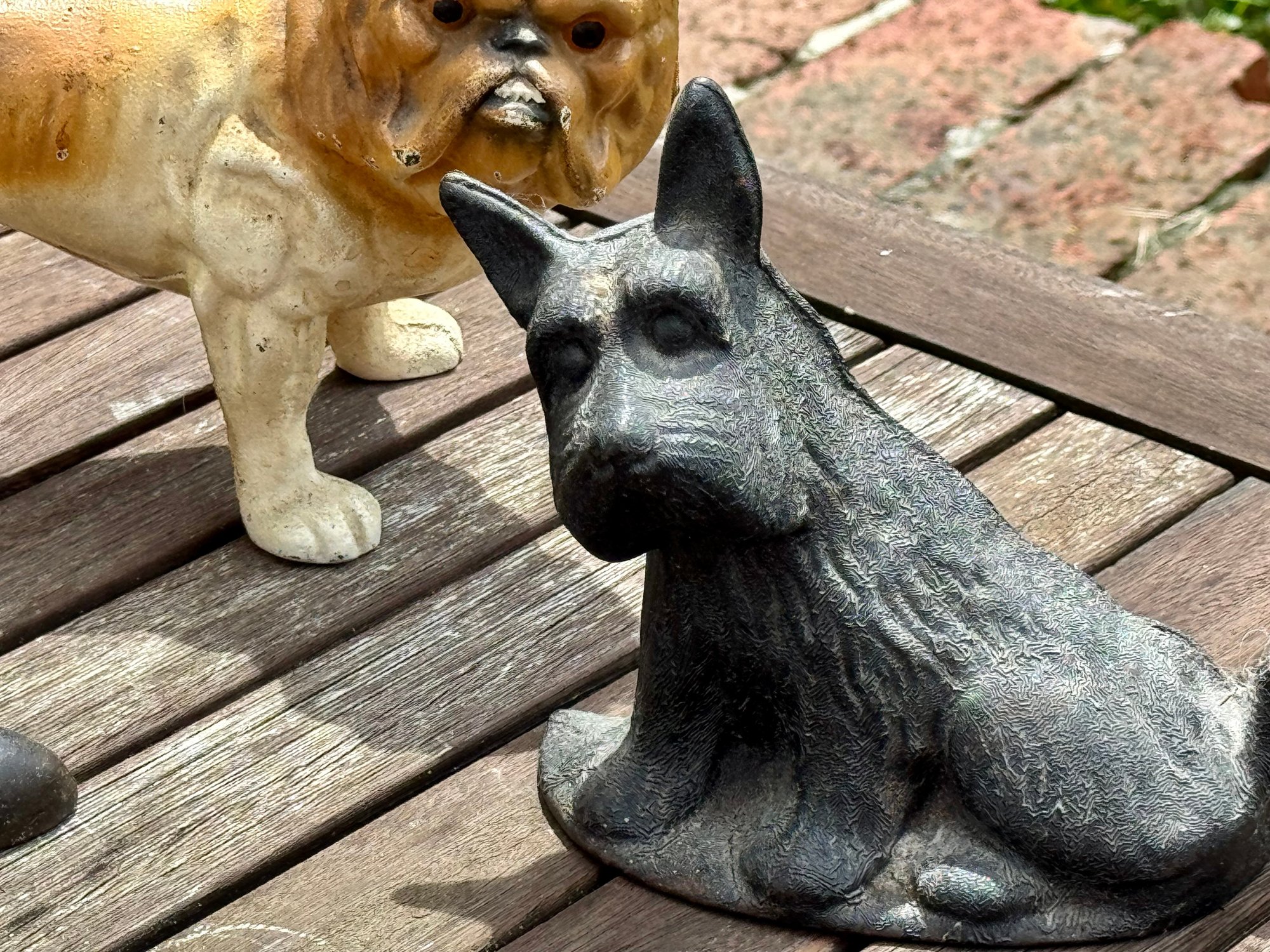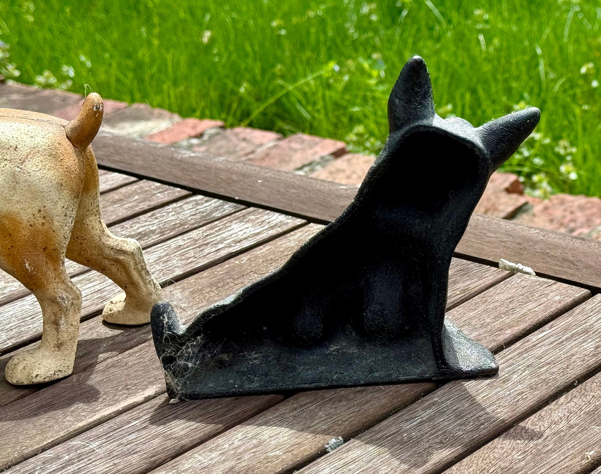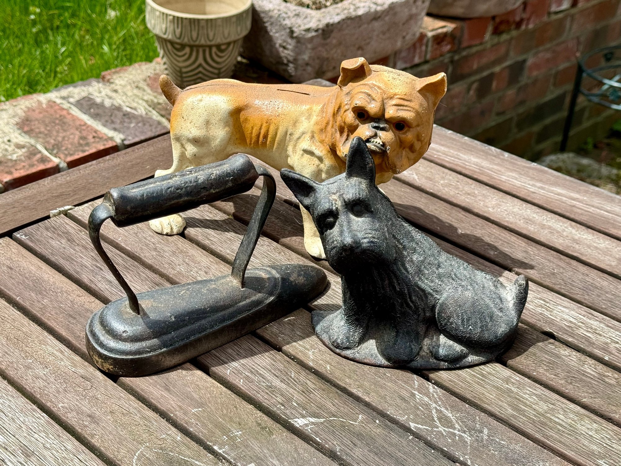Three antique doorstops, including: bulldog 6” H x 9” L, black dog 5.5” H, and an iron 5” H x 7” L.