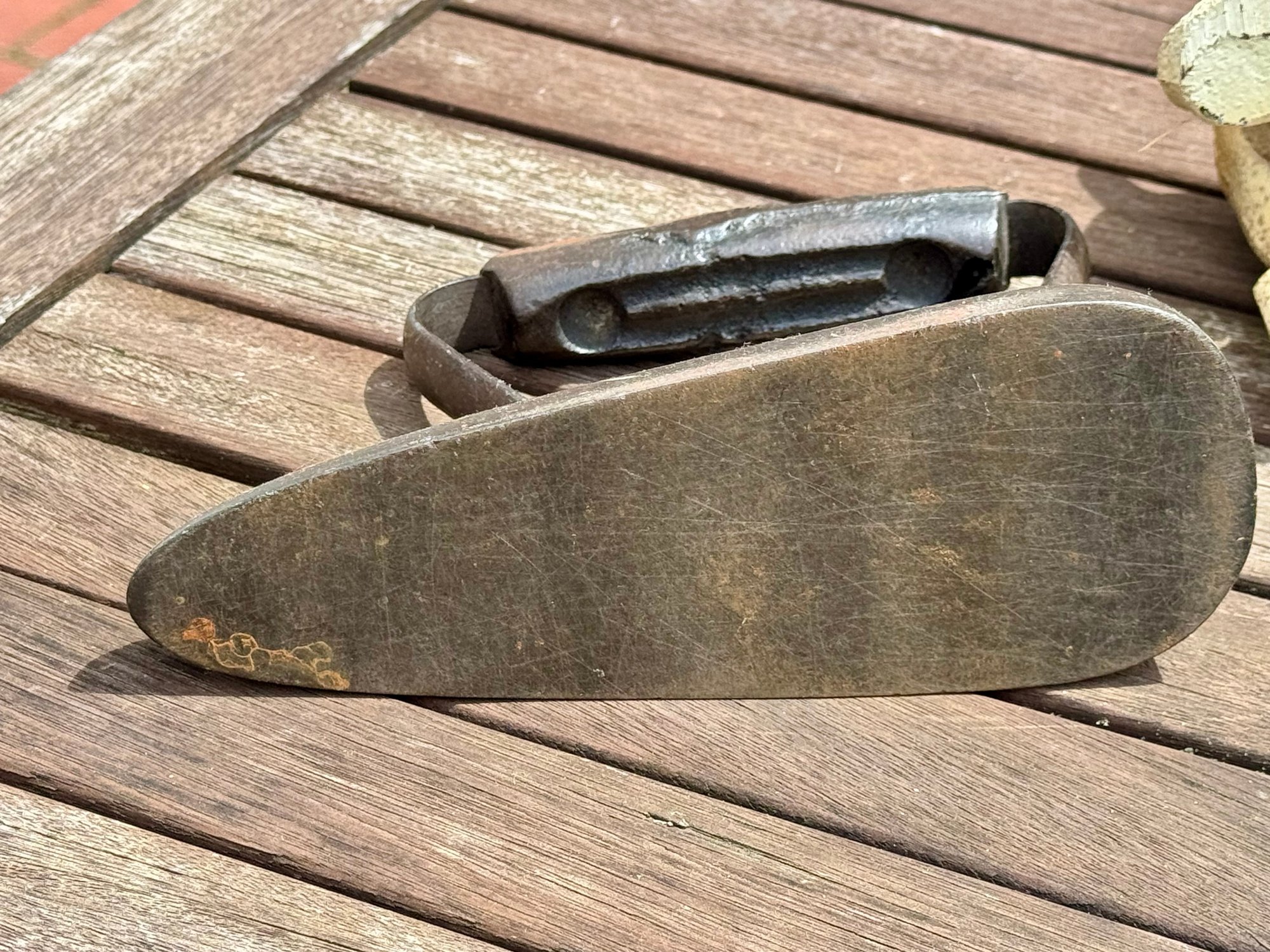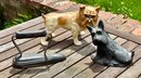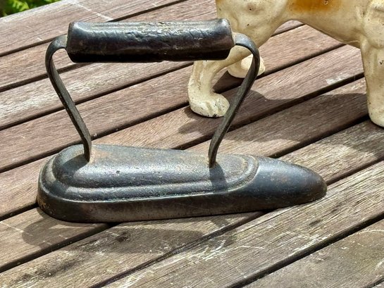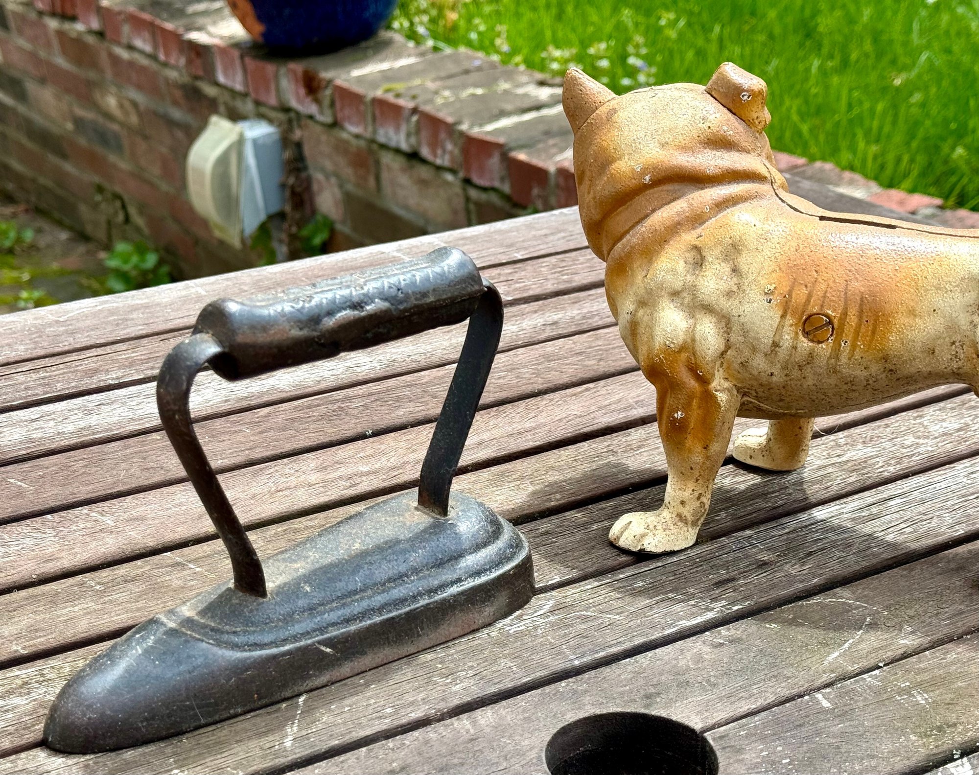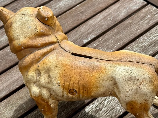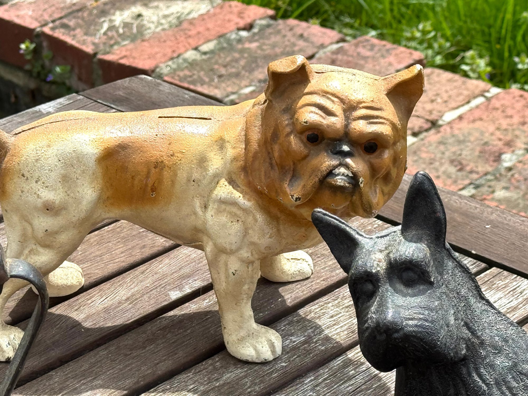 Three antique doorstops, including: bulldog 6” H x 9” L, black dog 5.5” H, and an iron 5” H x 7” L.