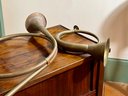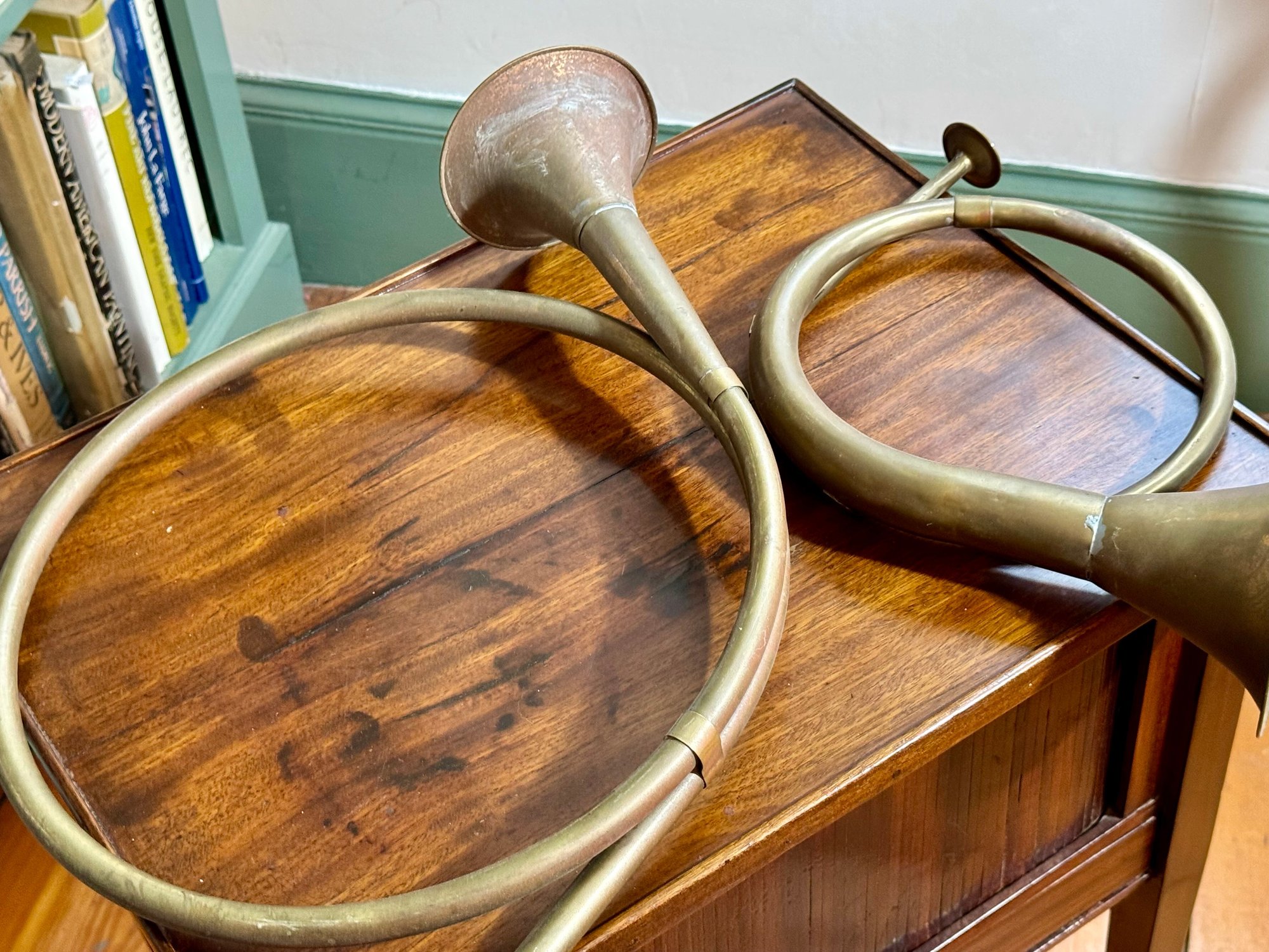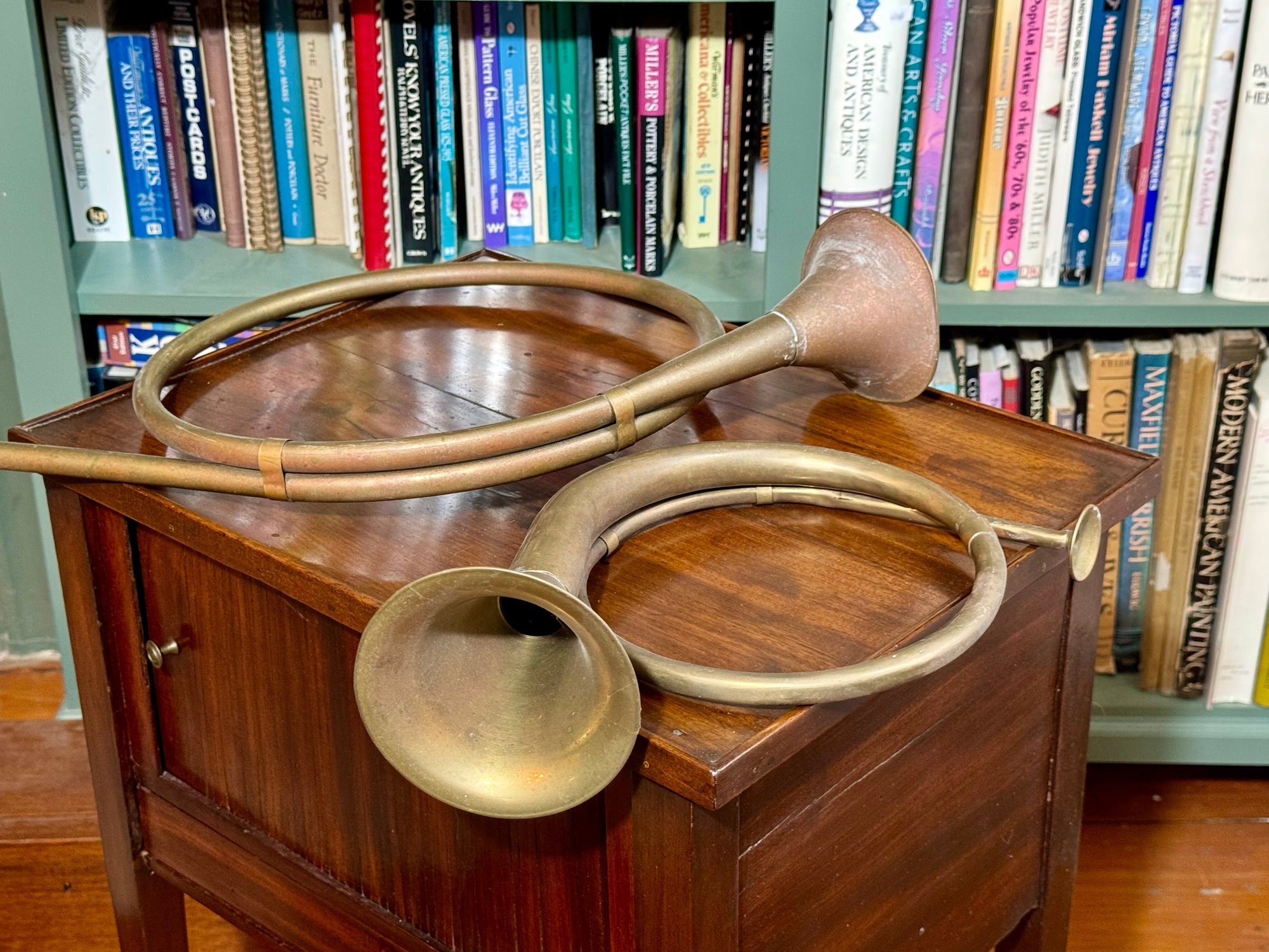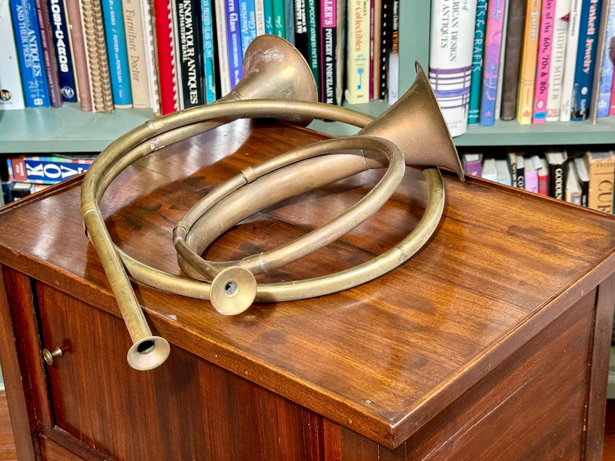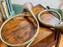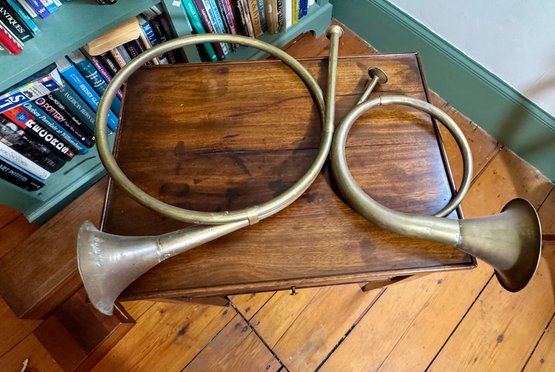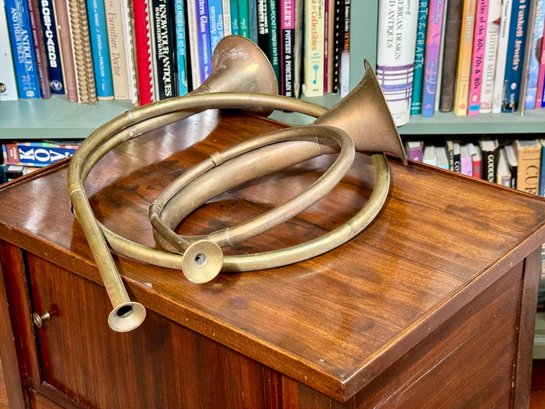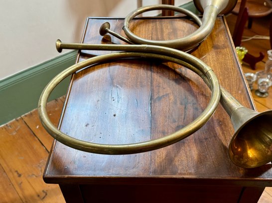 Two antique French horn style brass bugles.