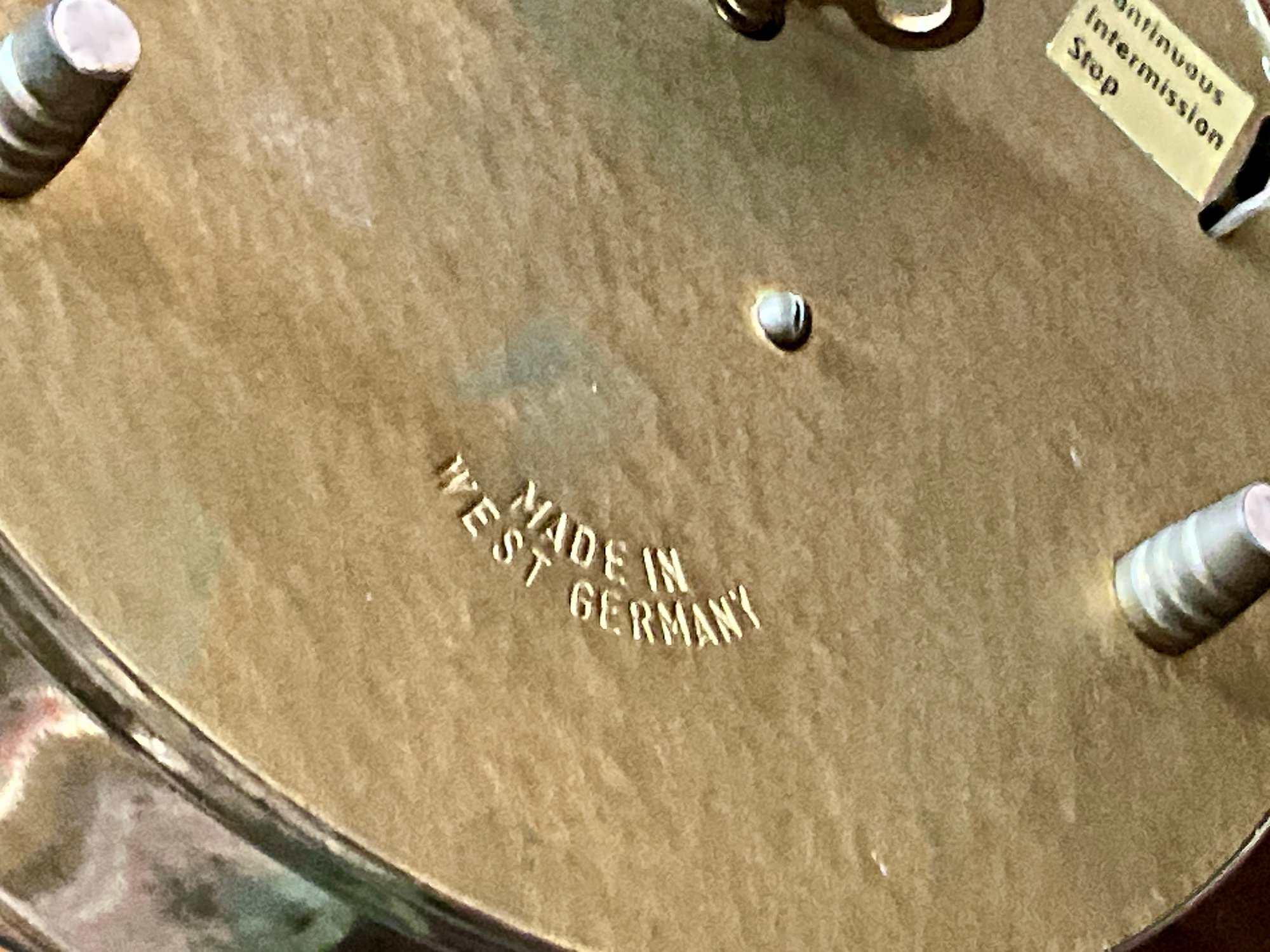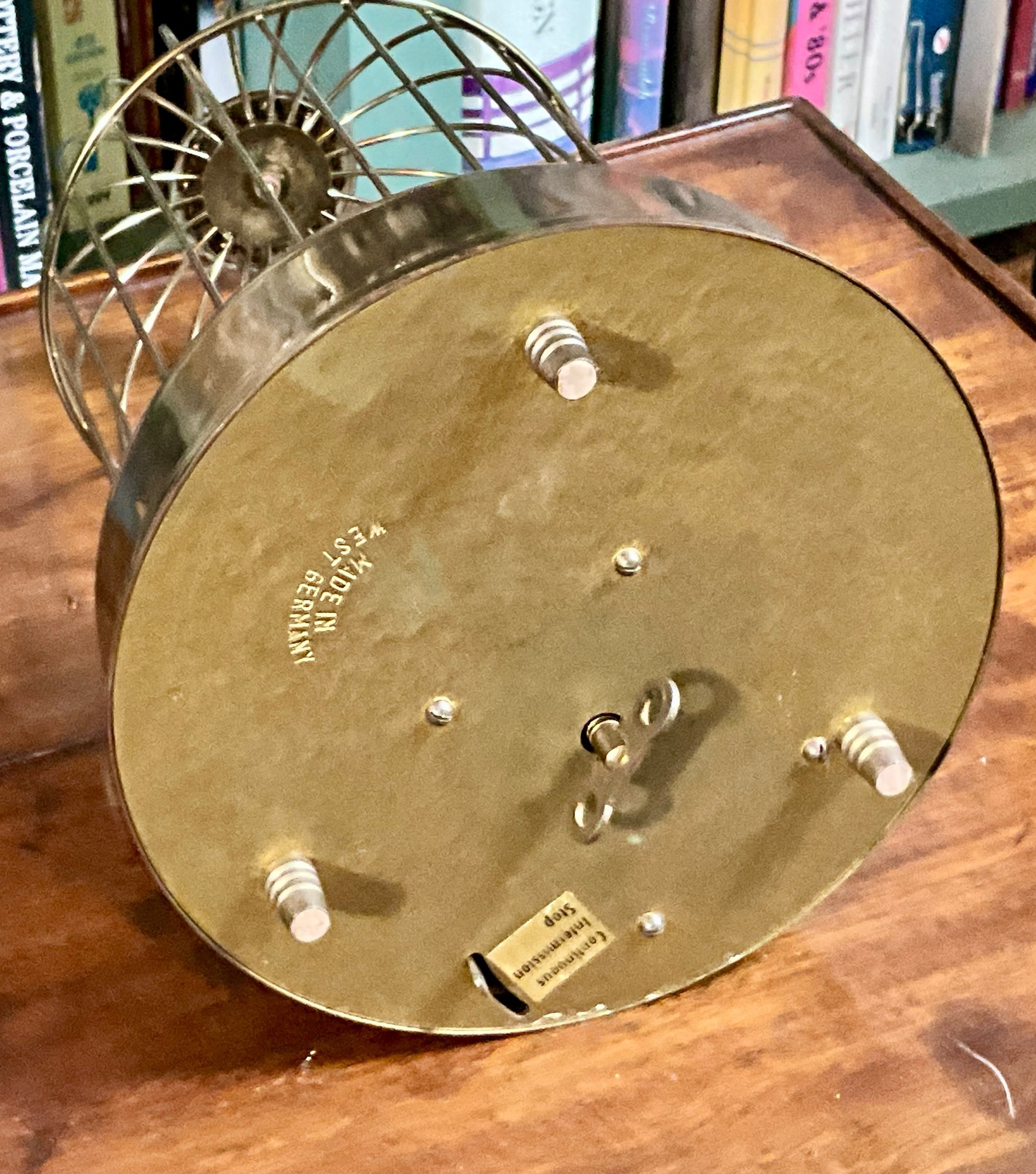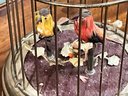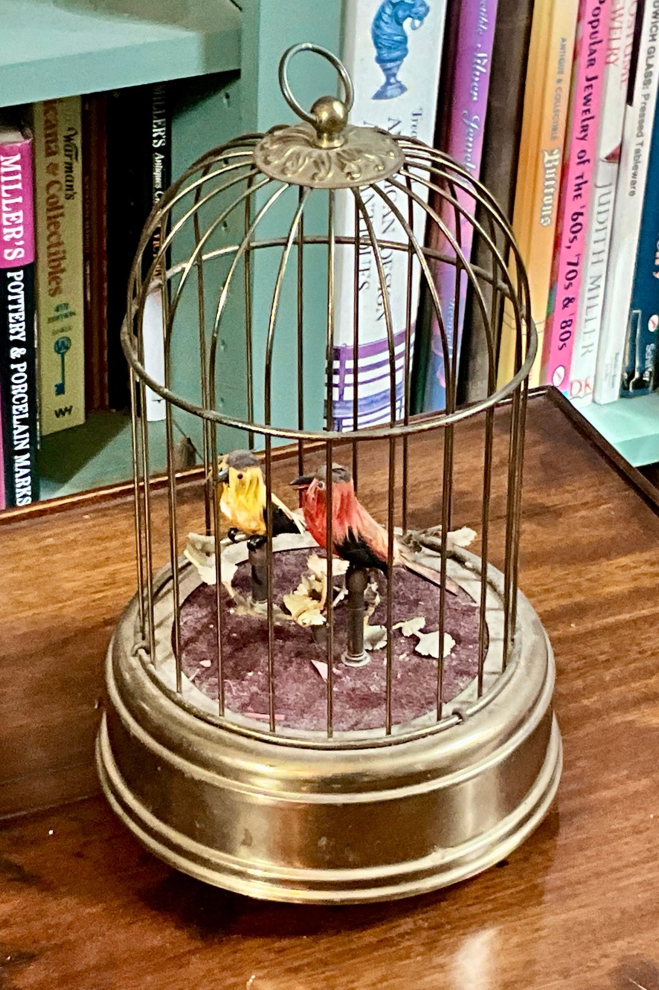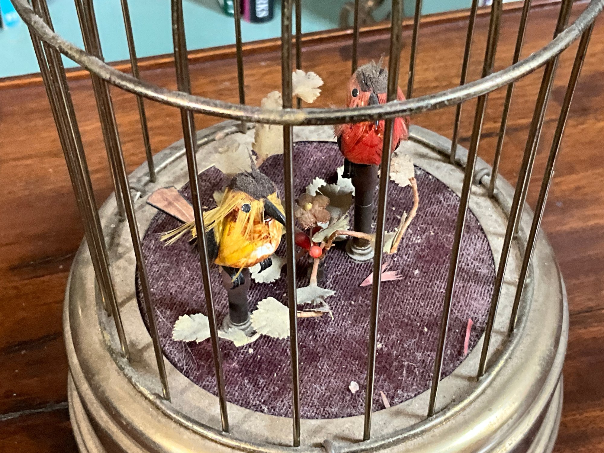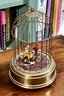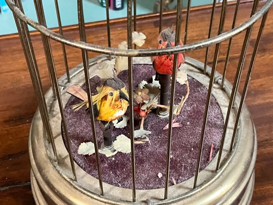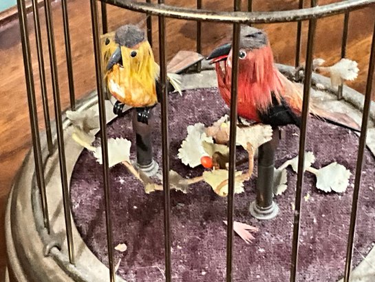 An antique musical bird cage with two birds, marked on bottom 'Made in West Germany'.